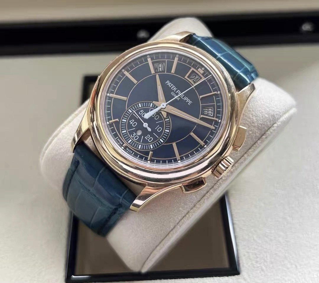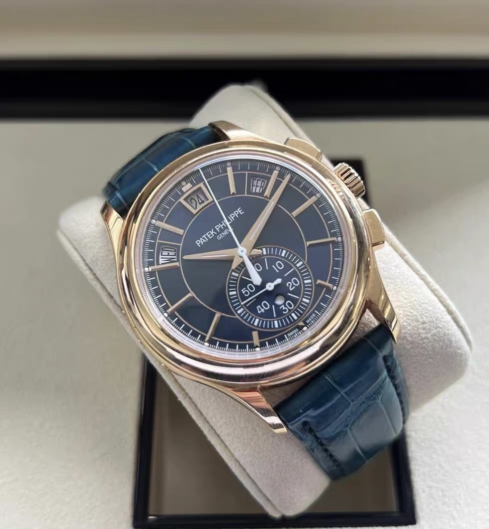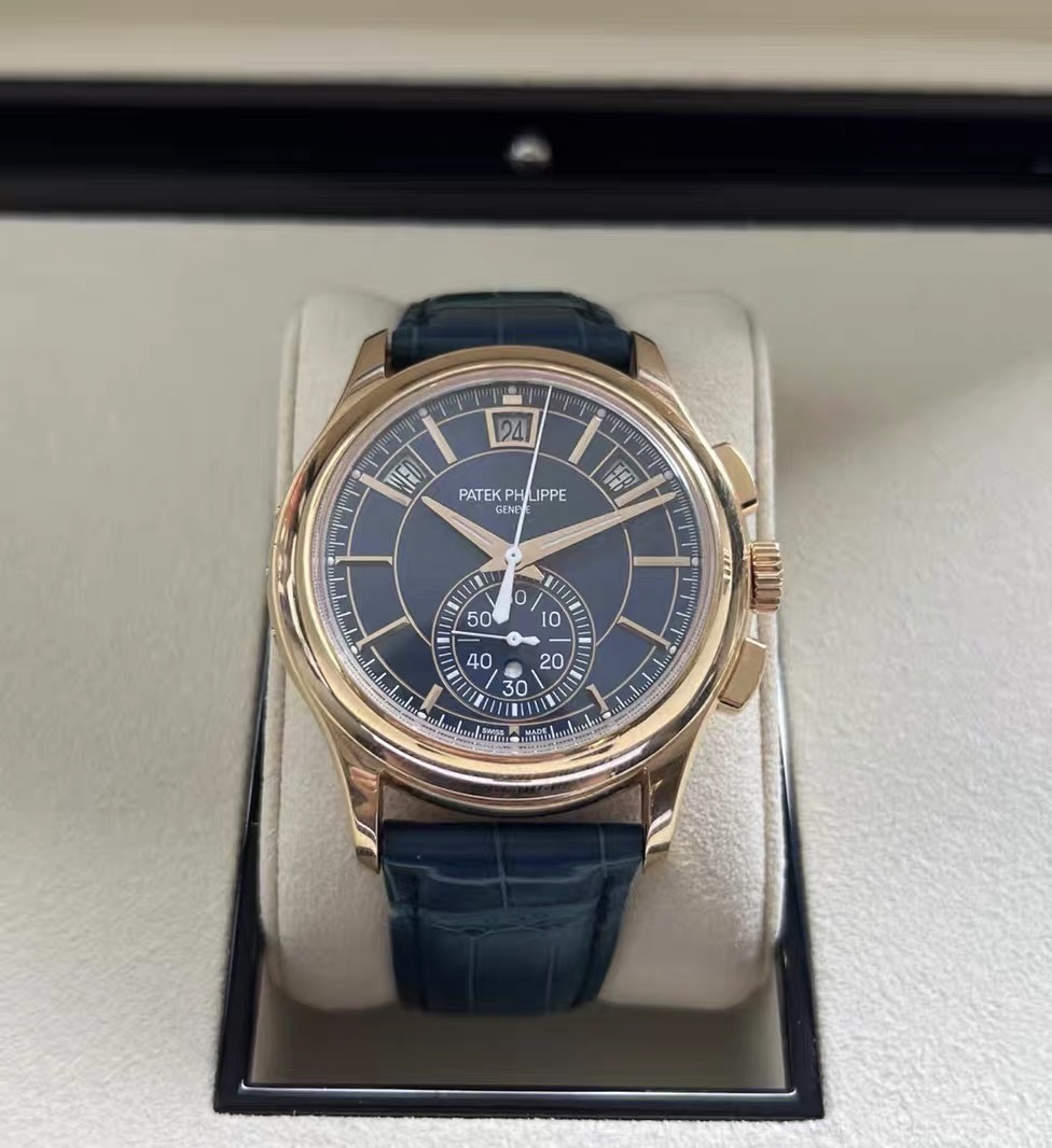 18k玫瑰金,蓝色表盘,日期 星期 月份 年历 计时