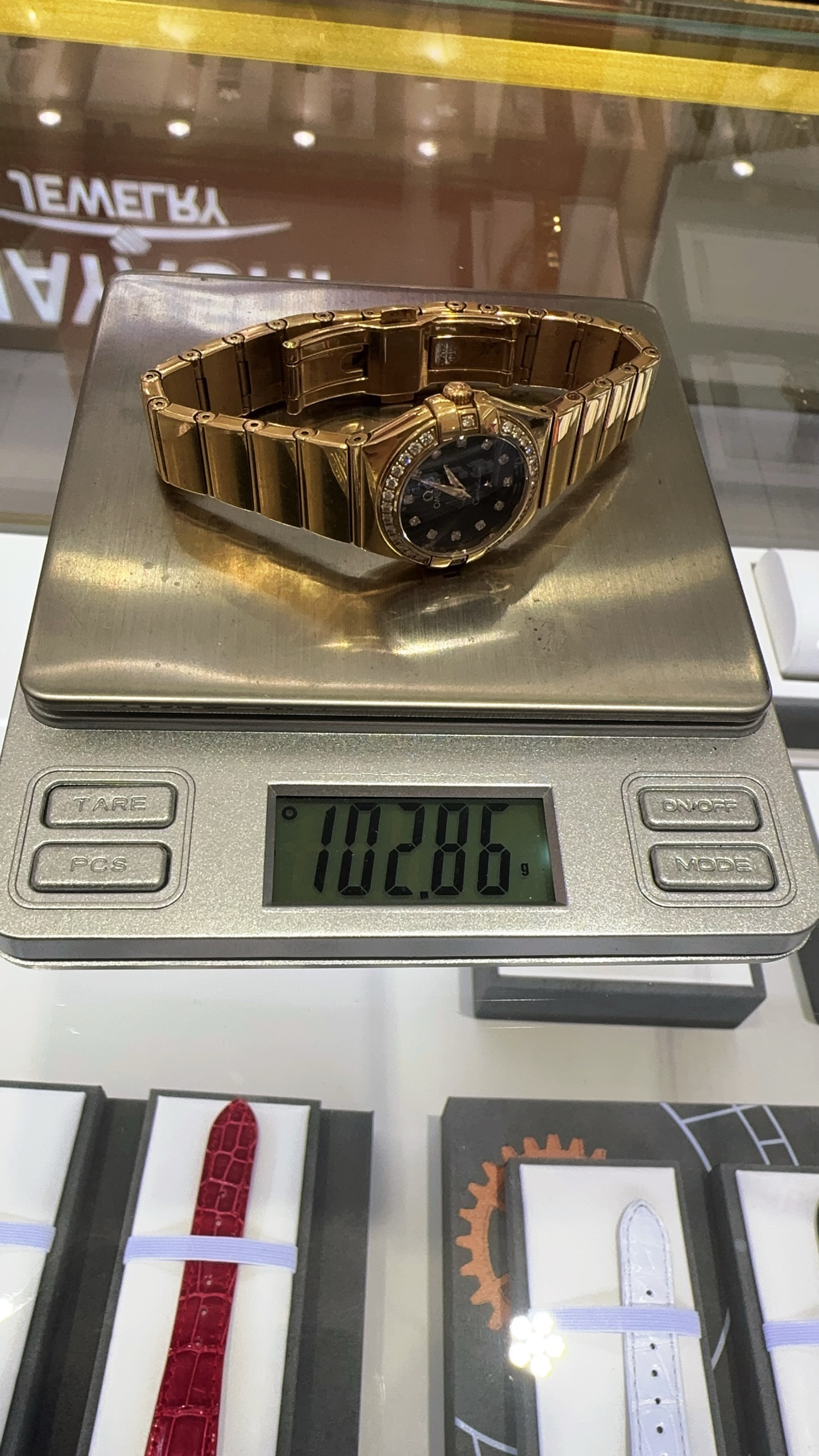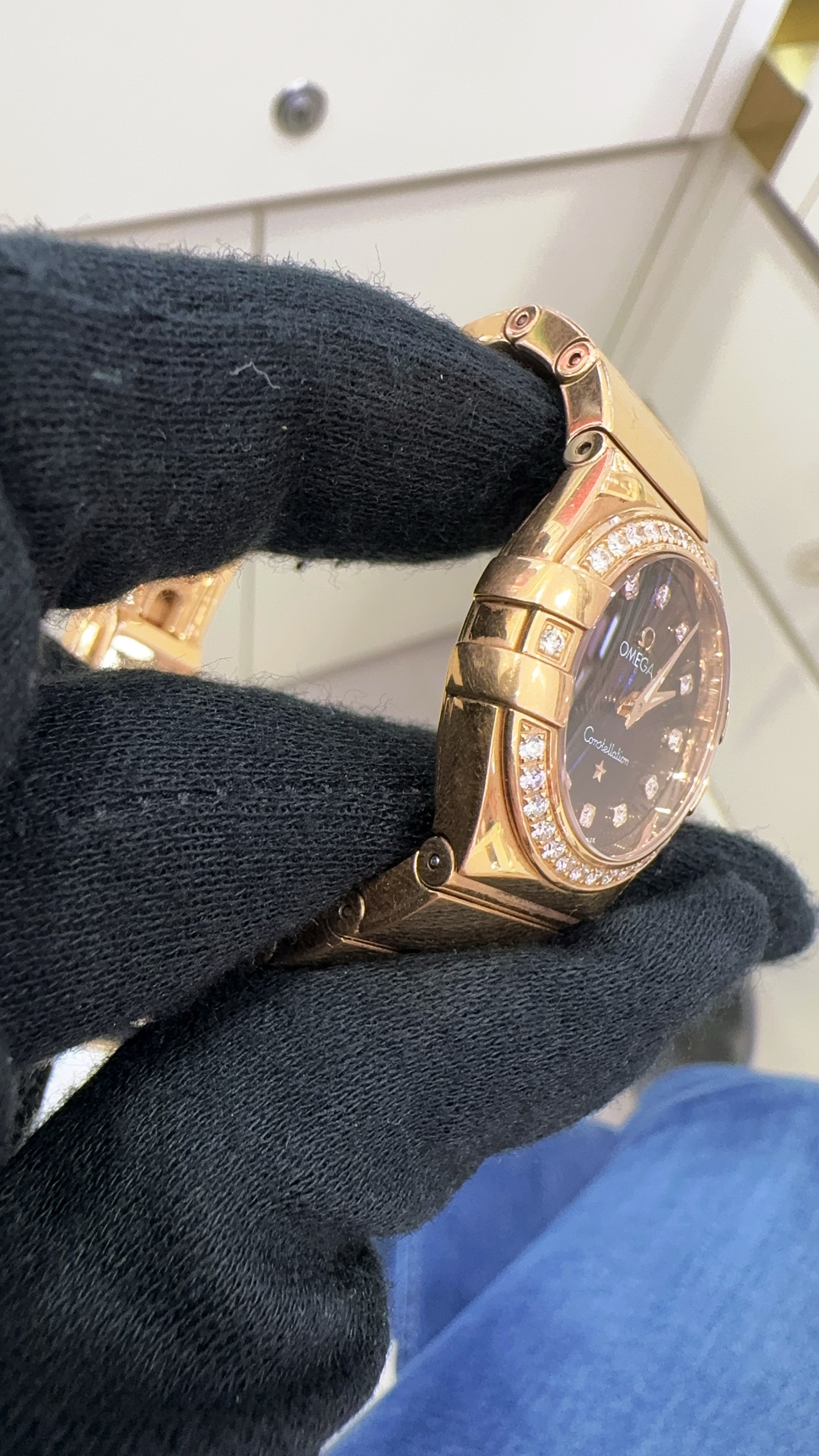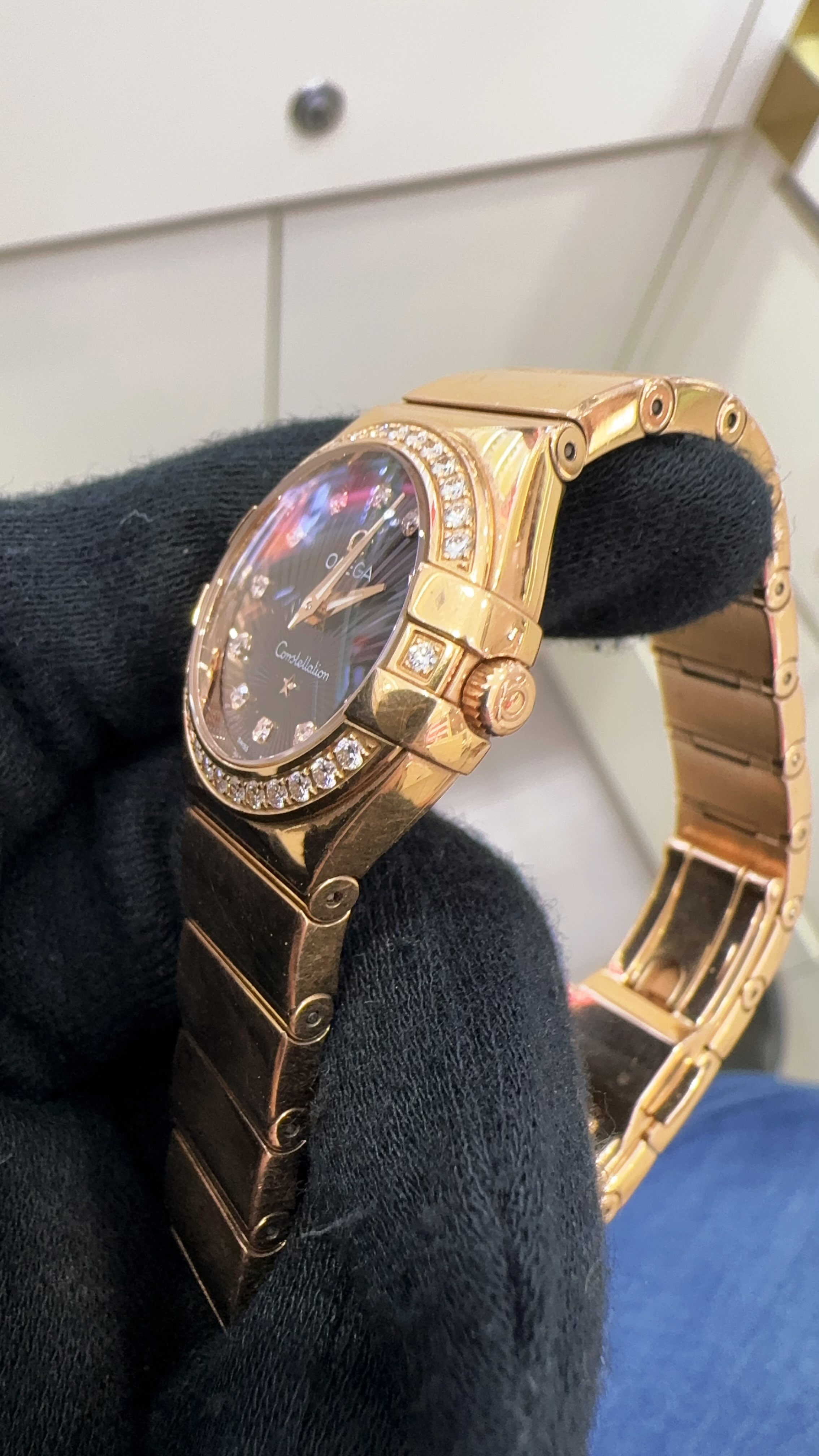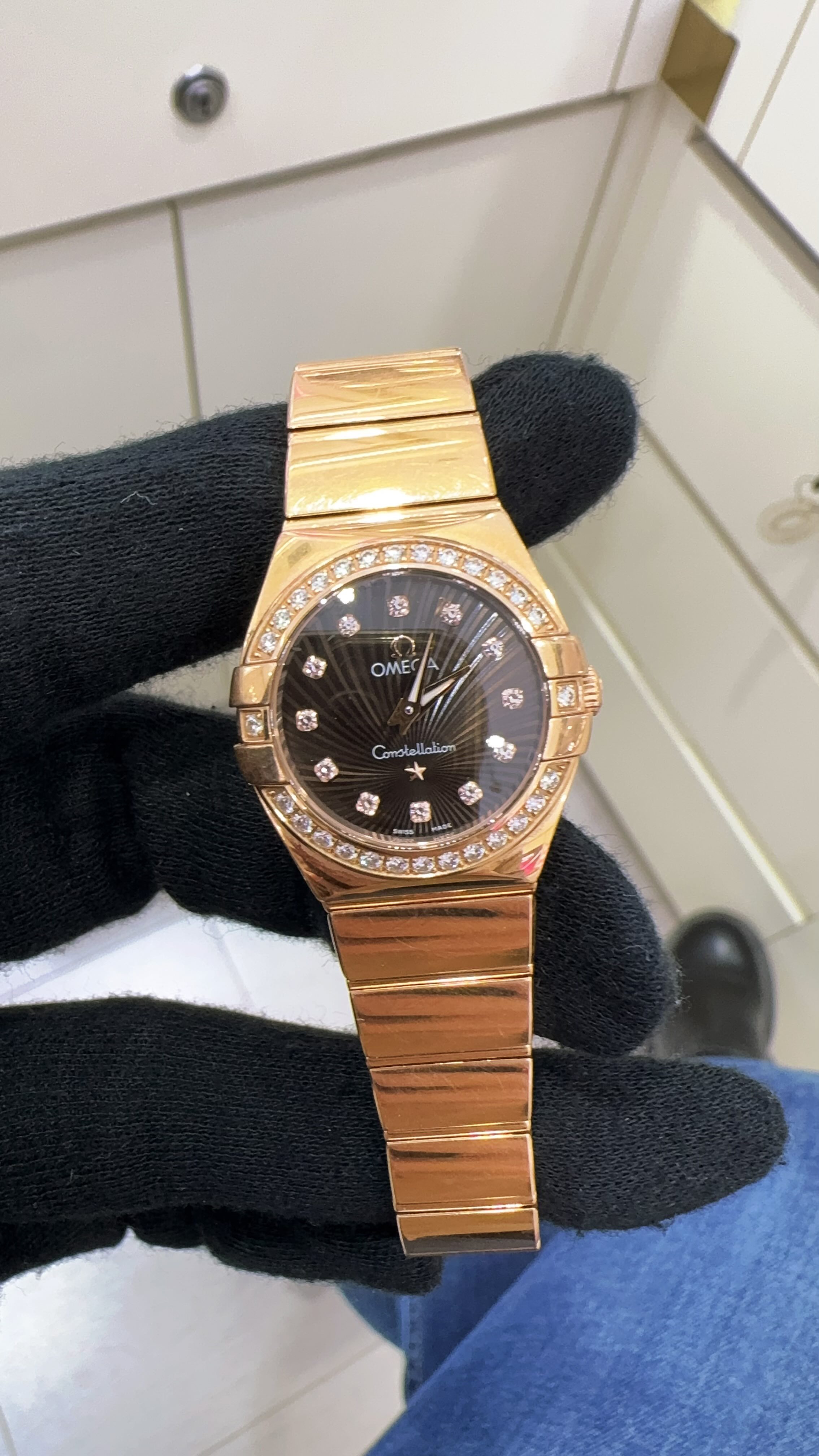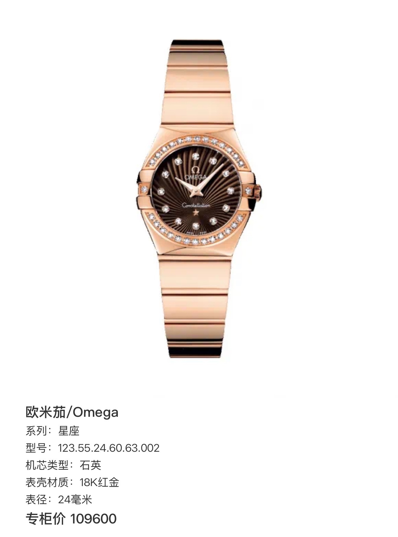 OMEGA欧米茄星座系列玫瑰金女表,型号:123.55.24.60.63.002 ,石英机芯,24mm表径,原镶钻石,总重102.86克,公价109600,单表
