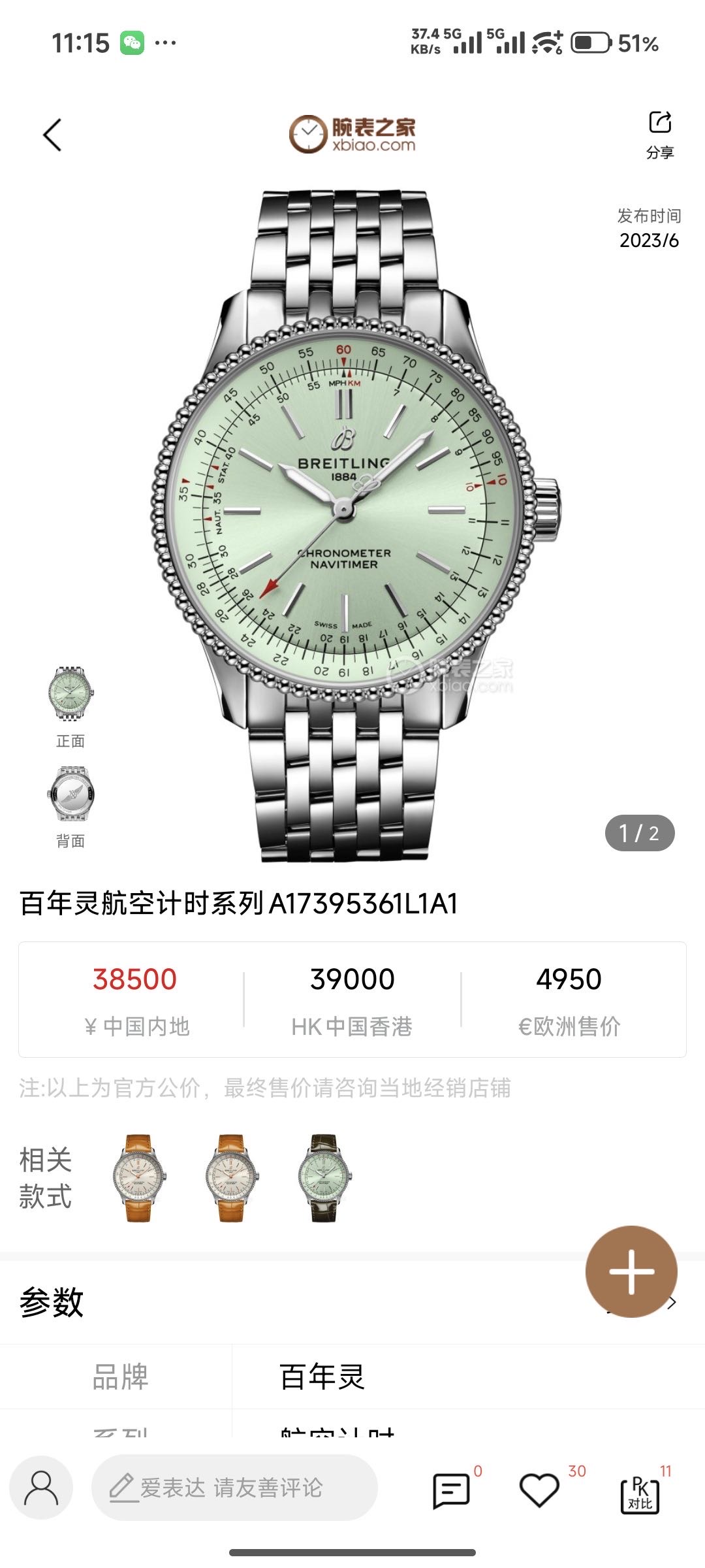 百年灵/Breitling 航空计时1 A17395361L1A1 自动机械 专柜价:38500.00