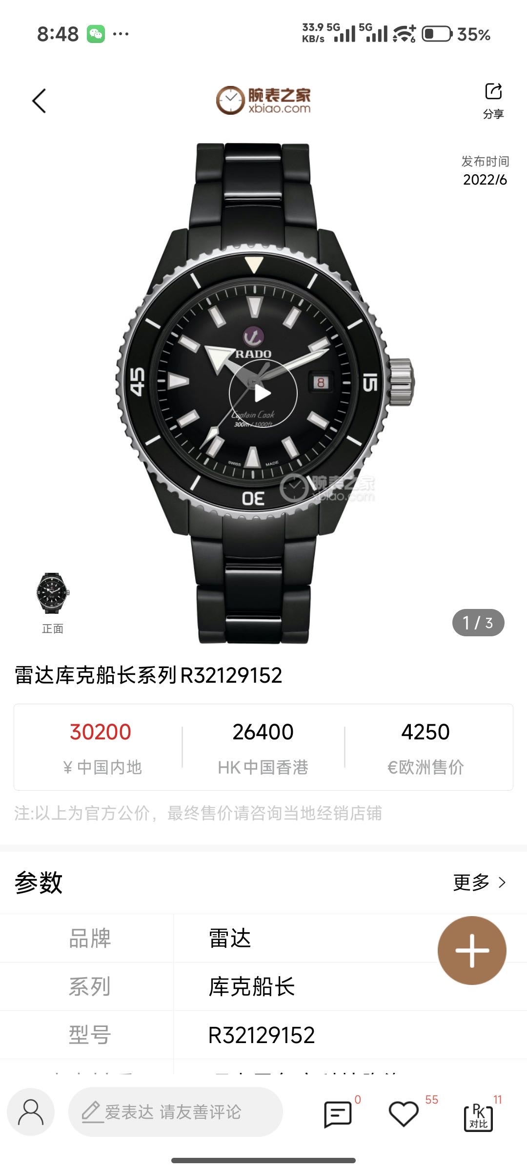 雷达/Rado 库克船长 R32129152 自动机械 专柜价:30200.00