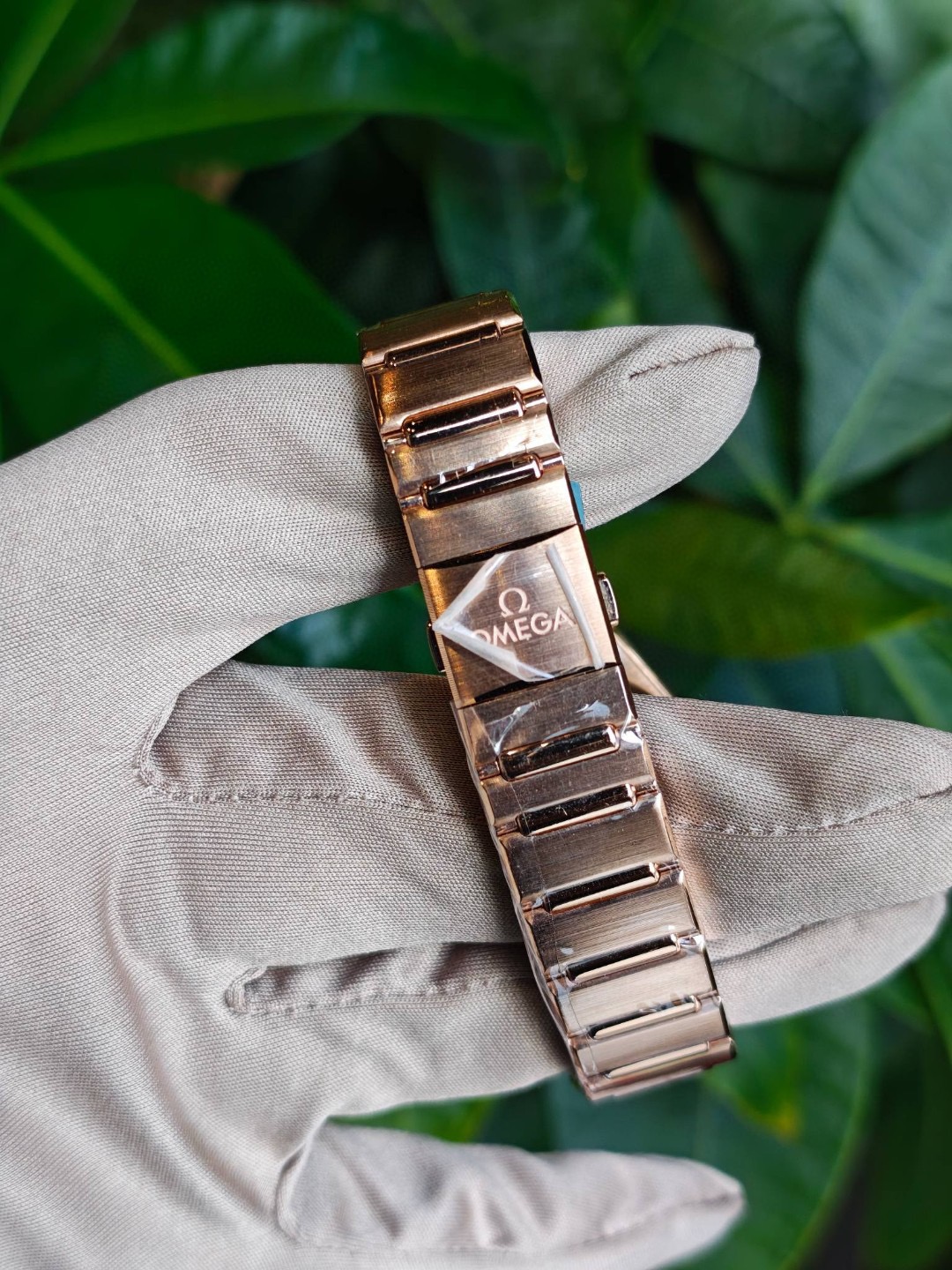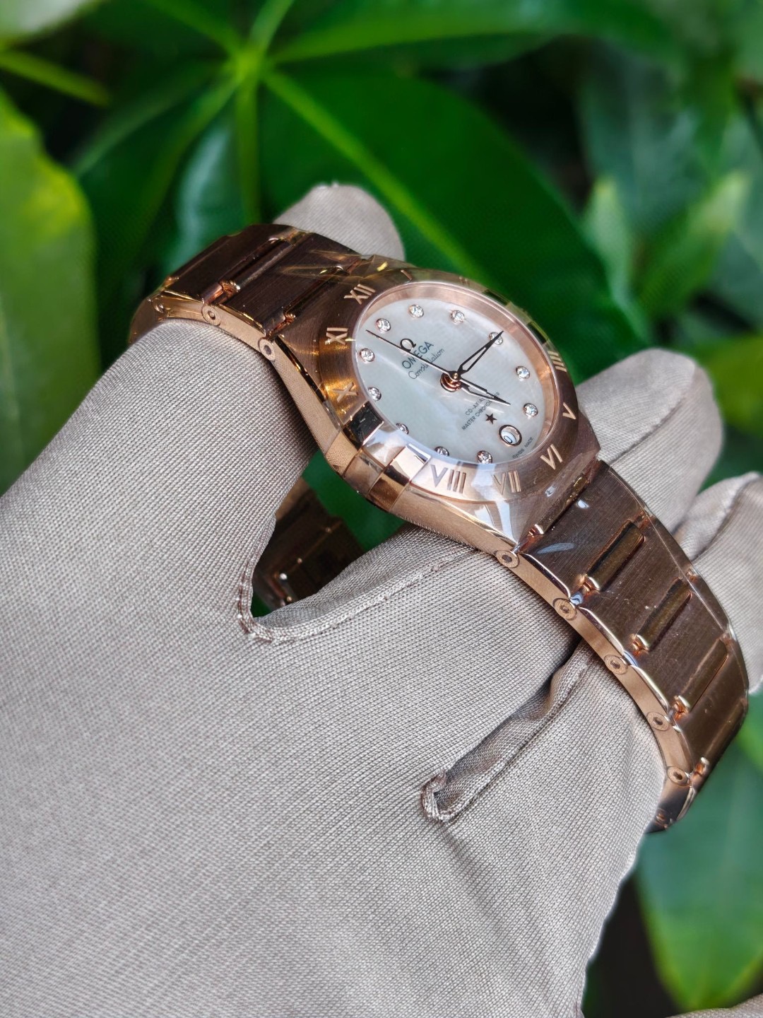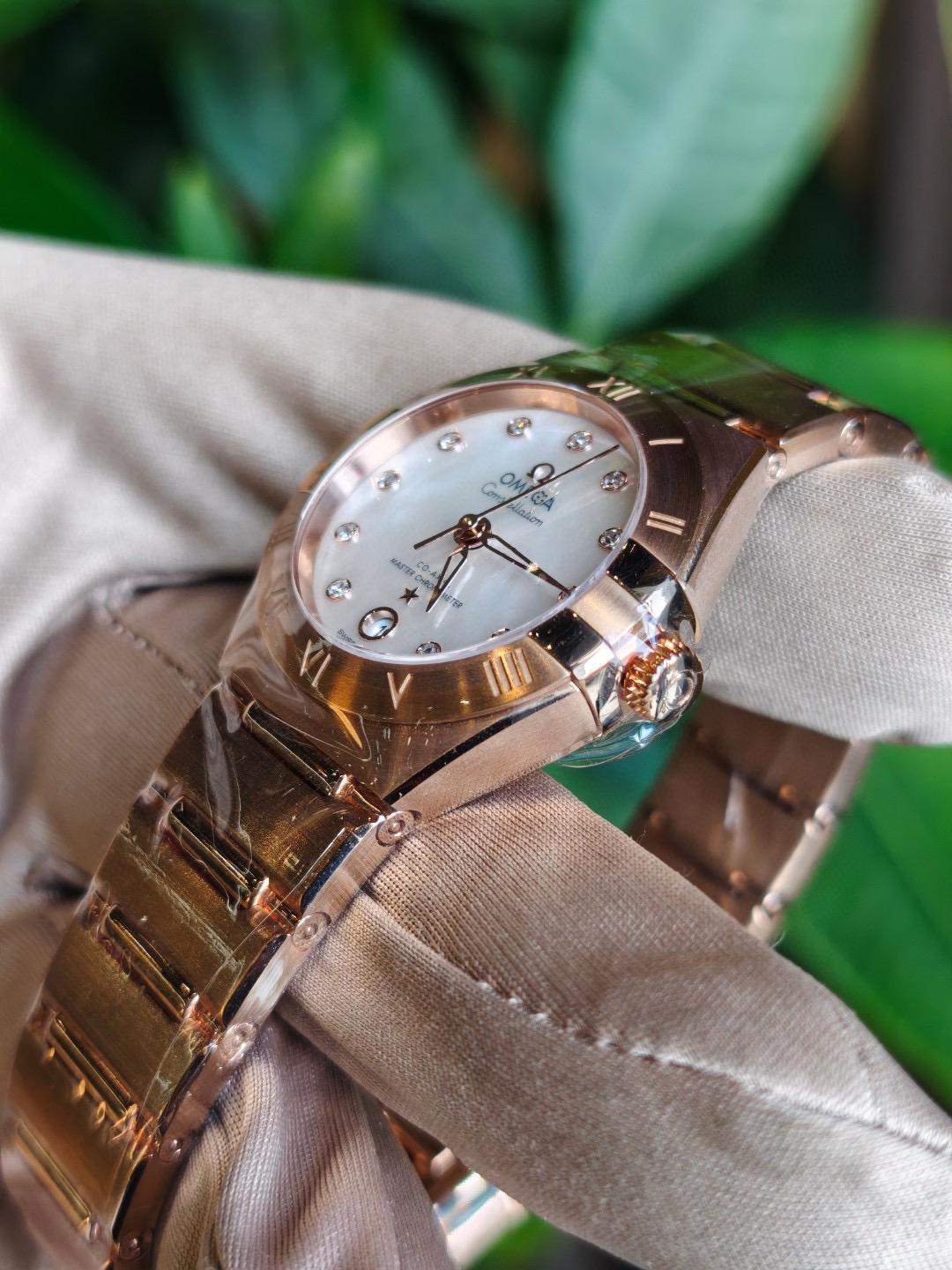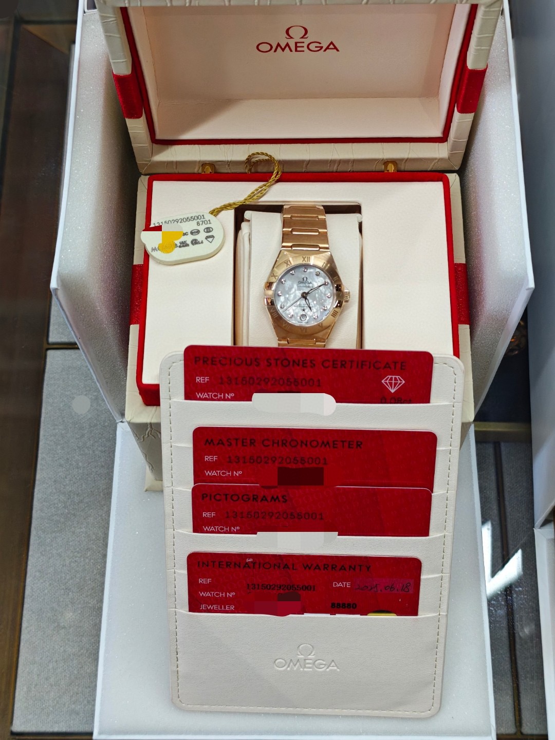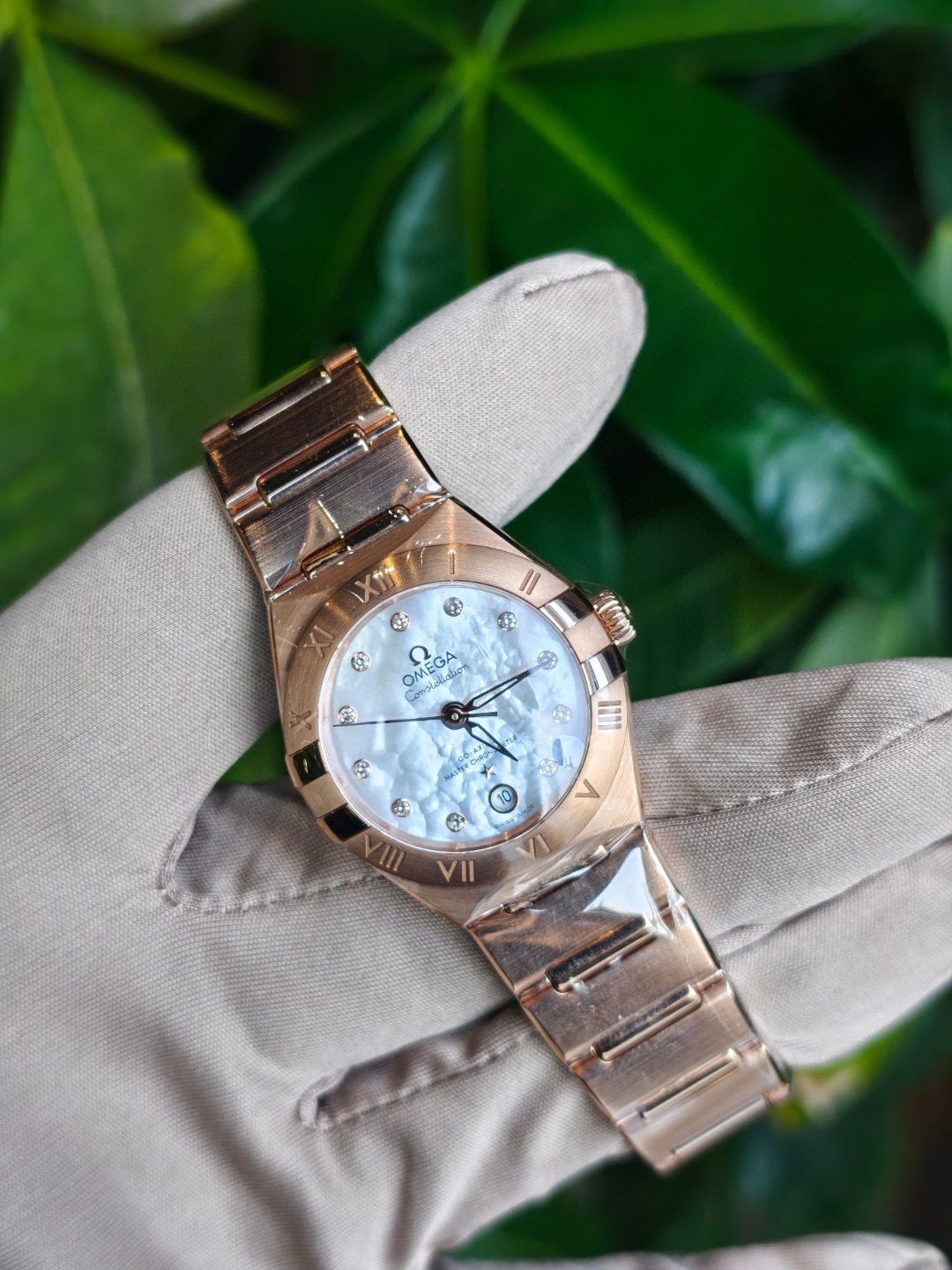 欧米茄星座系列131.50.29.20.55.001,29mm表径,白贝母表盘,钻刻时标,Sedna 18k金材质,日历显示/防磁功能,女士背透自动机械腕表,蝴蝶扣,国行25年6月卡,全新全套