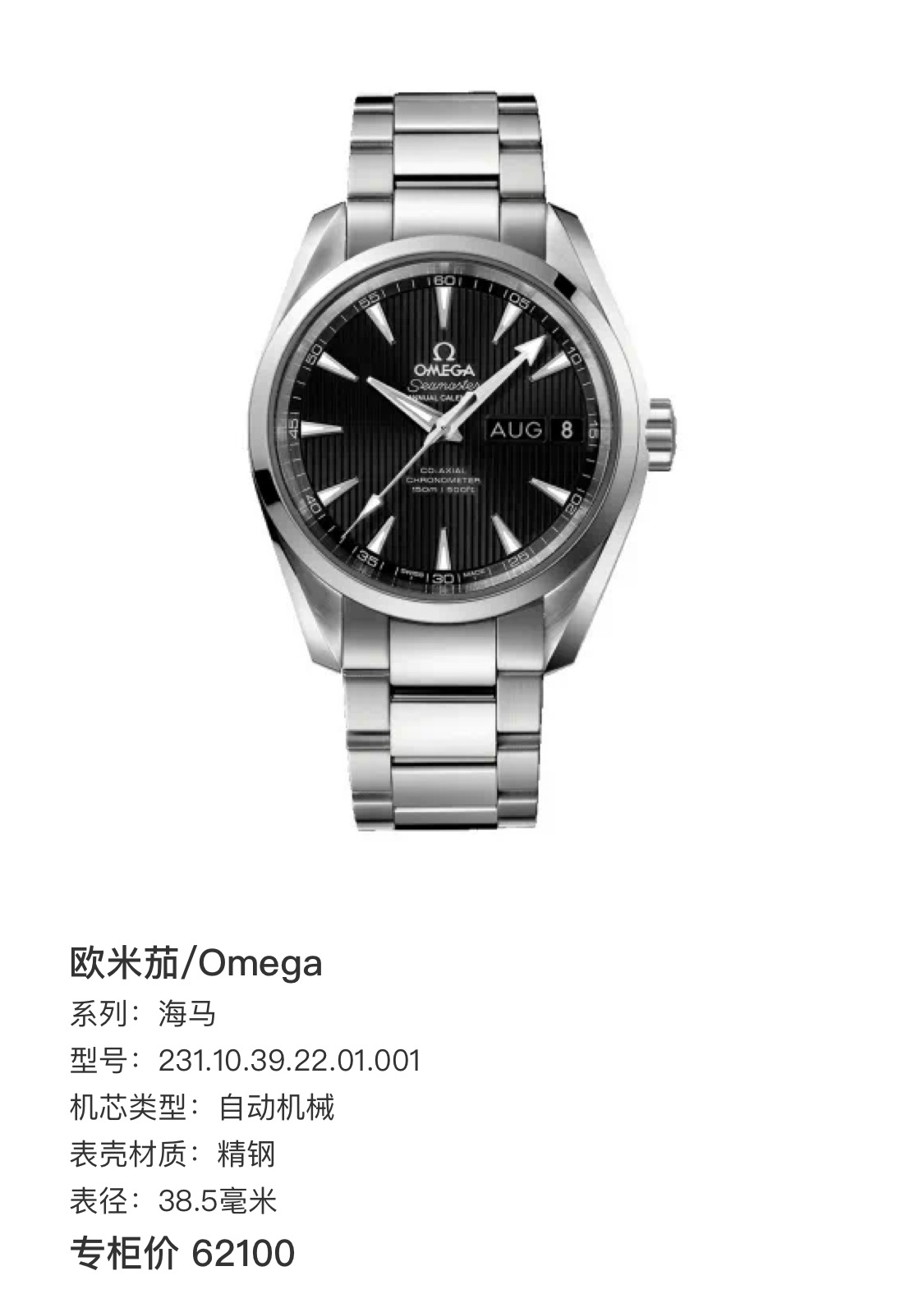 欧米茄/Omega Seamaster 海马系列 231.10.39.22.01.001 全新未使用 自动机械机芯 精钢 38.5 毫米 专柜价 62100