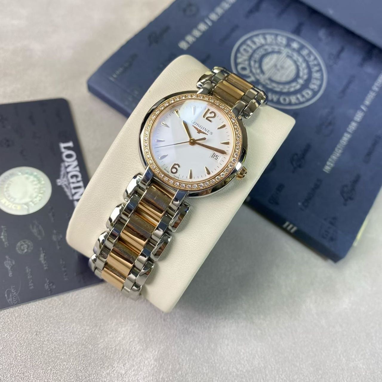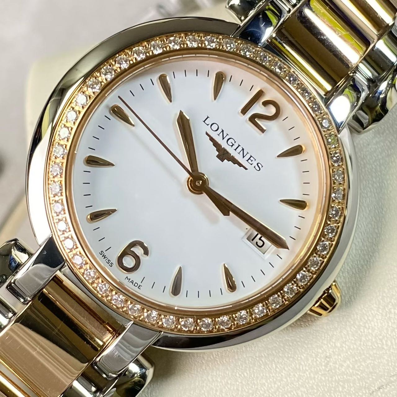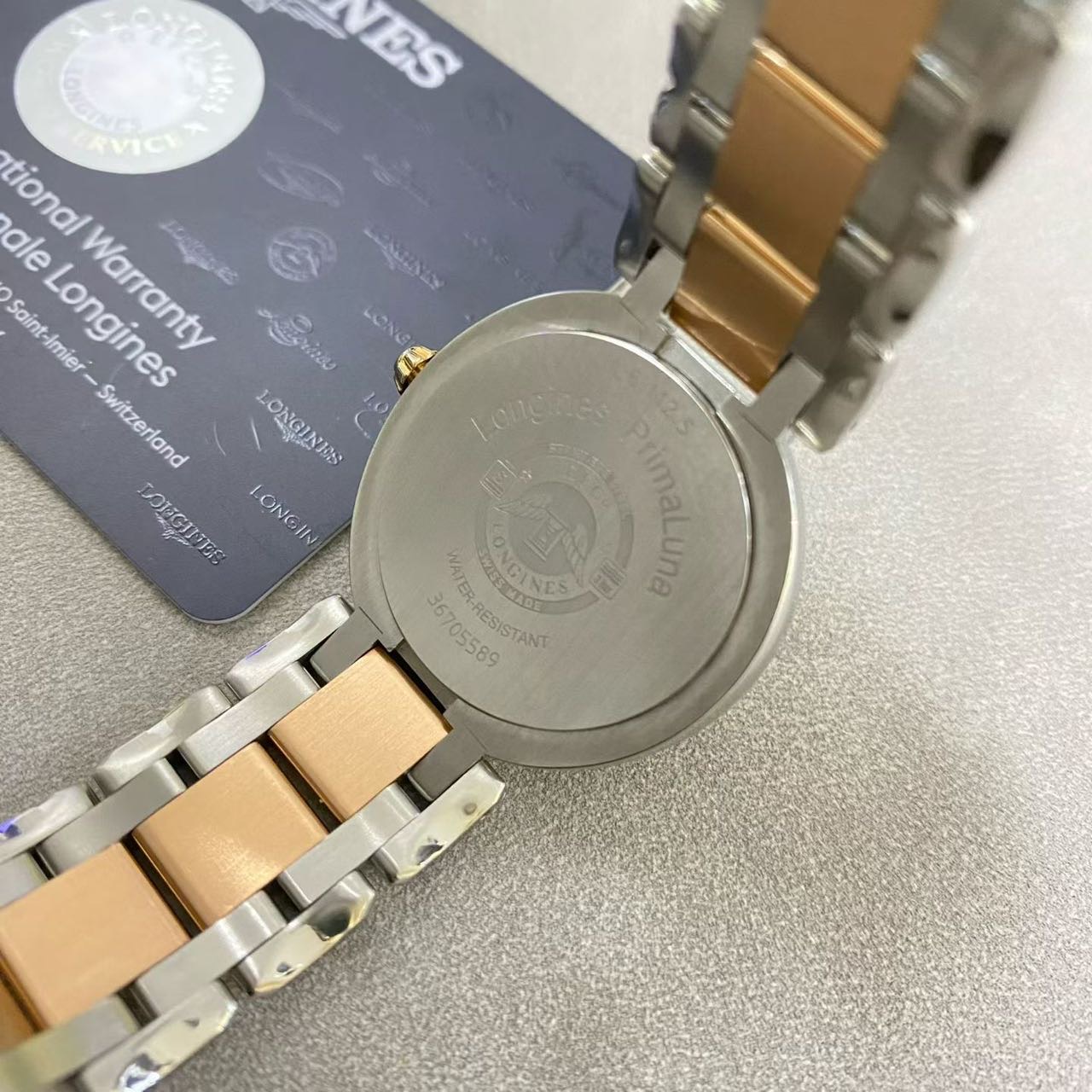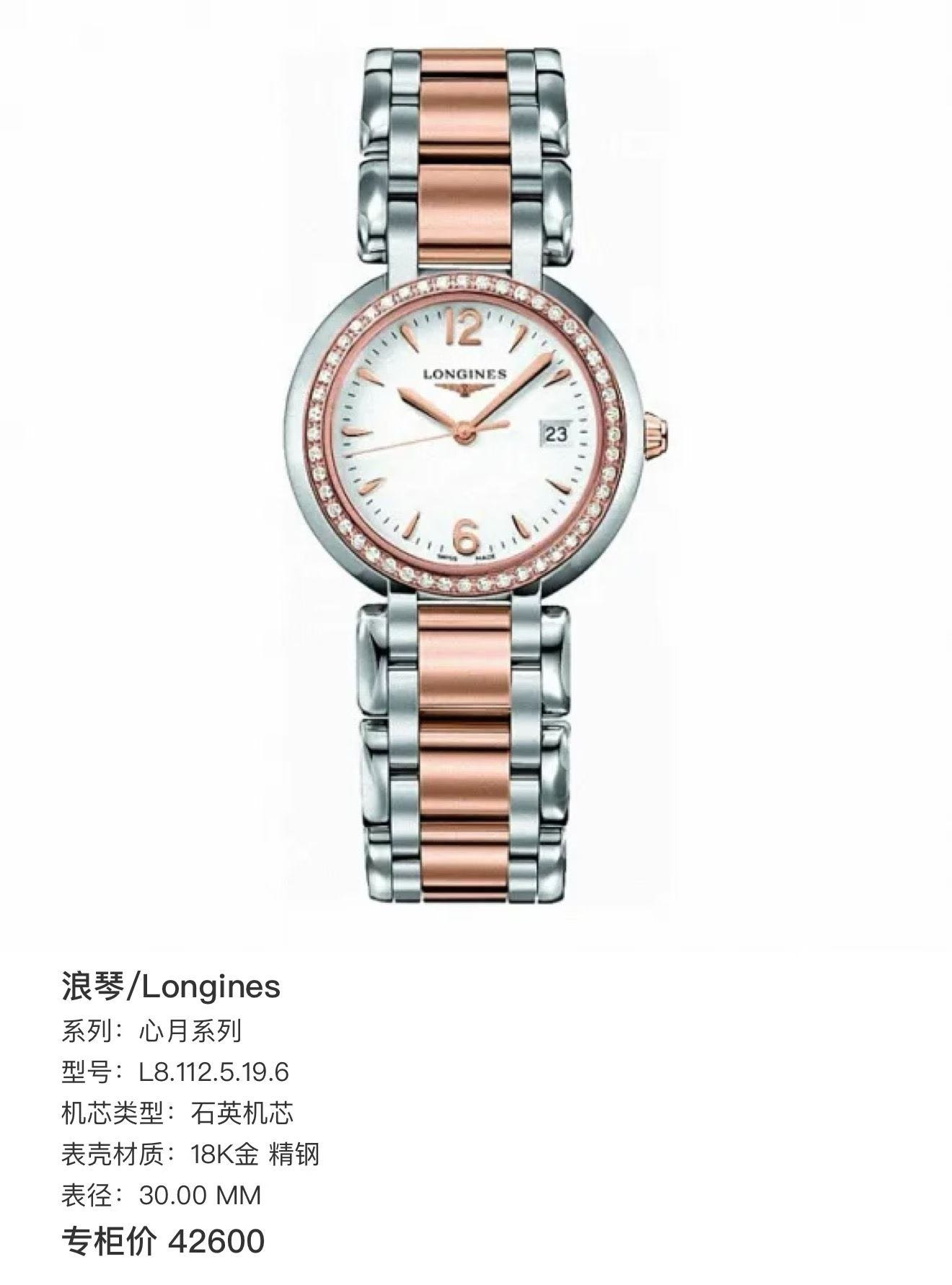 浪琴心月112系列,公价4.26万,表径30mm,全套附件齐全,整表18K玫瑰金相间,简约白盘 水滴刻度,外圈原钻镶嵌。