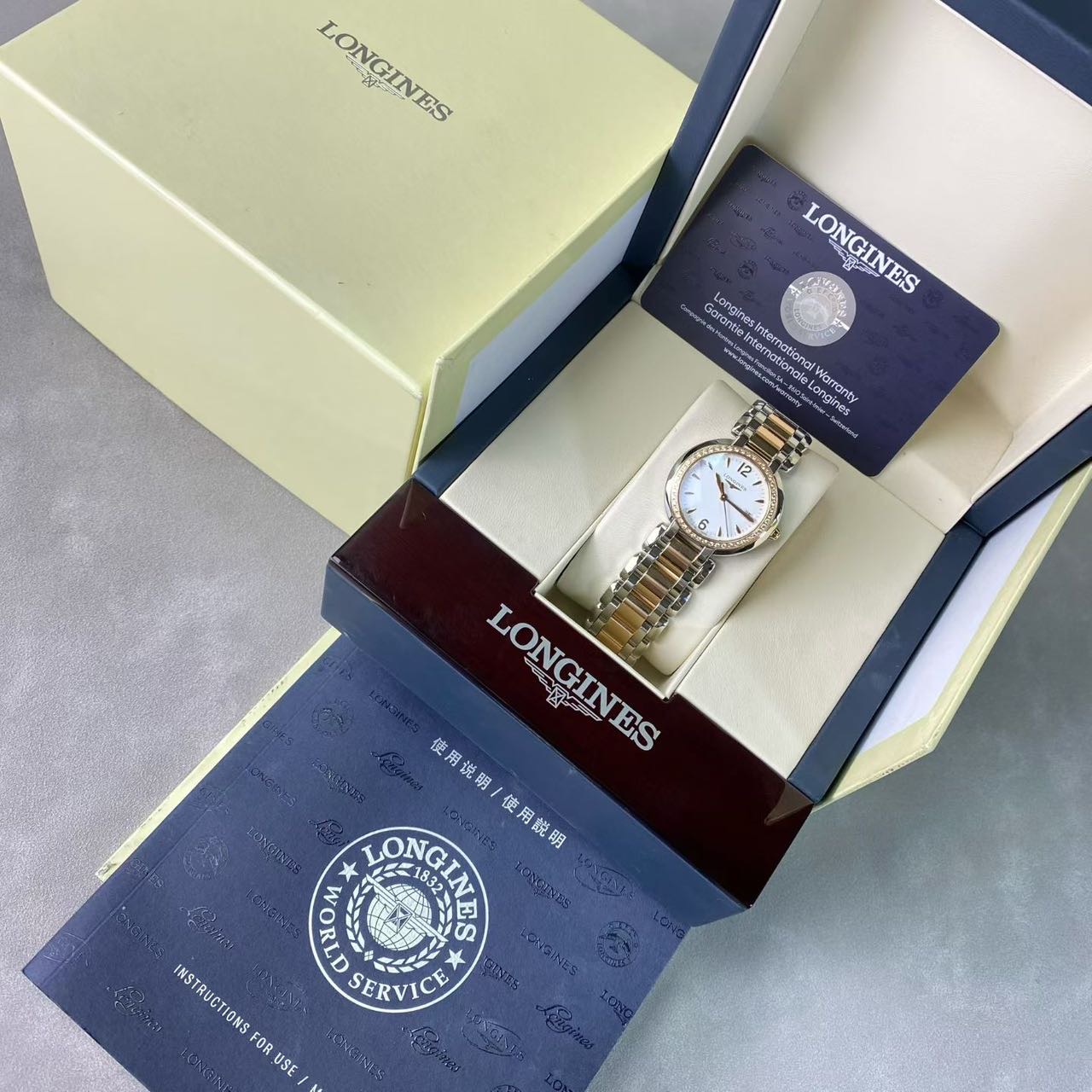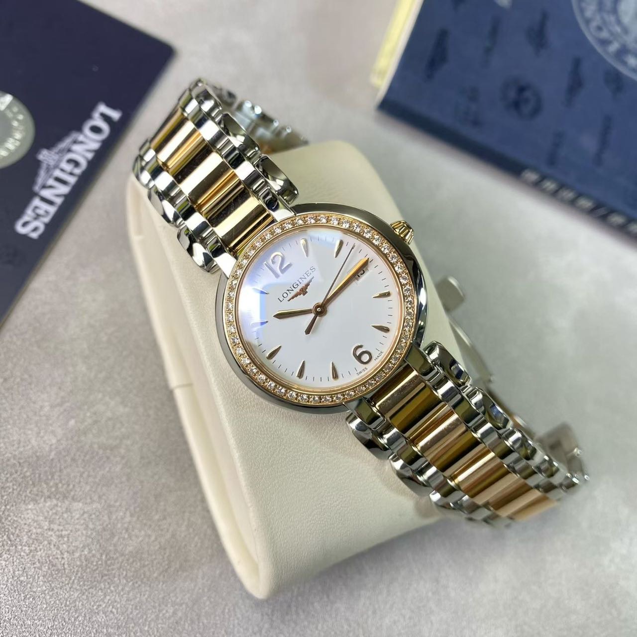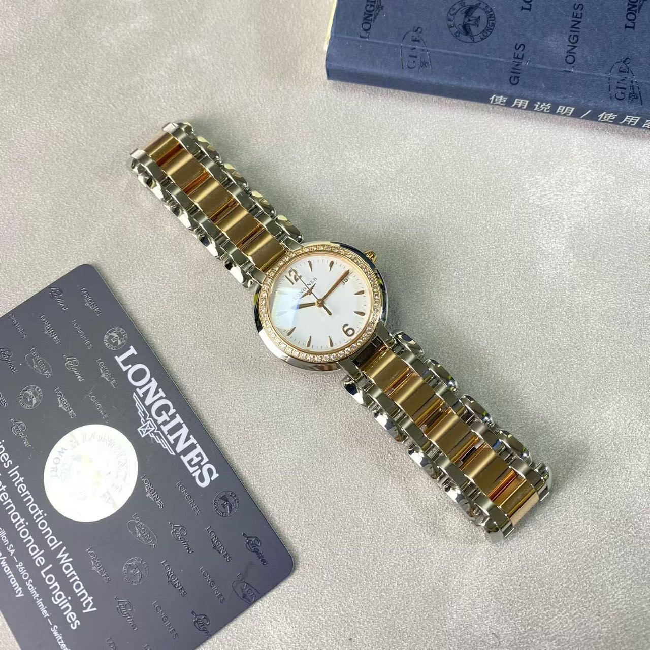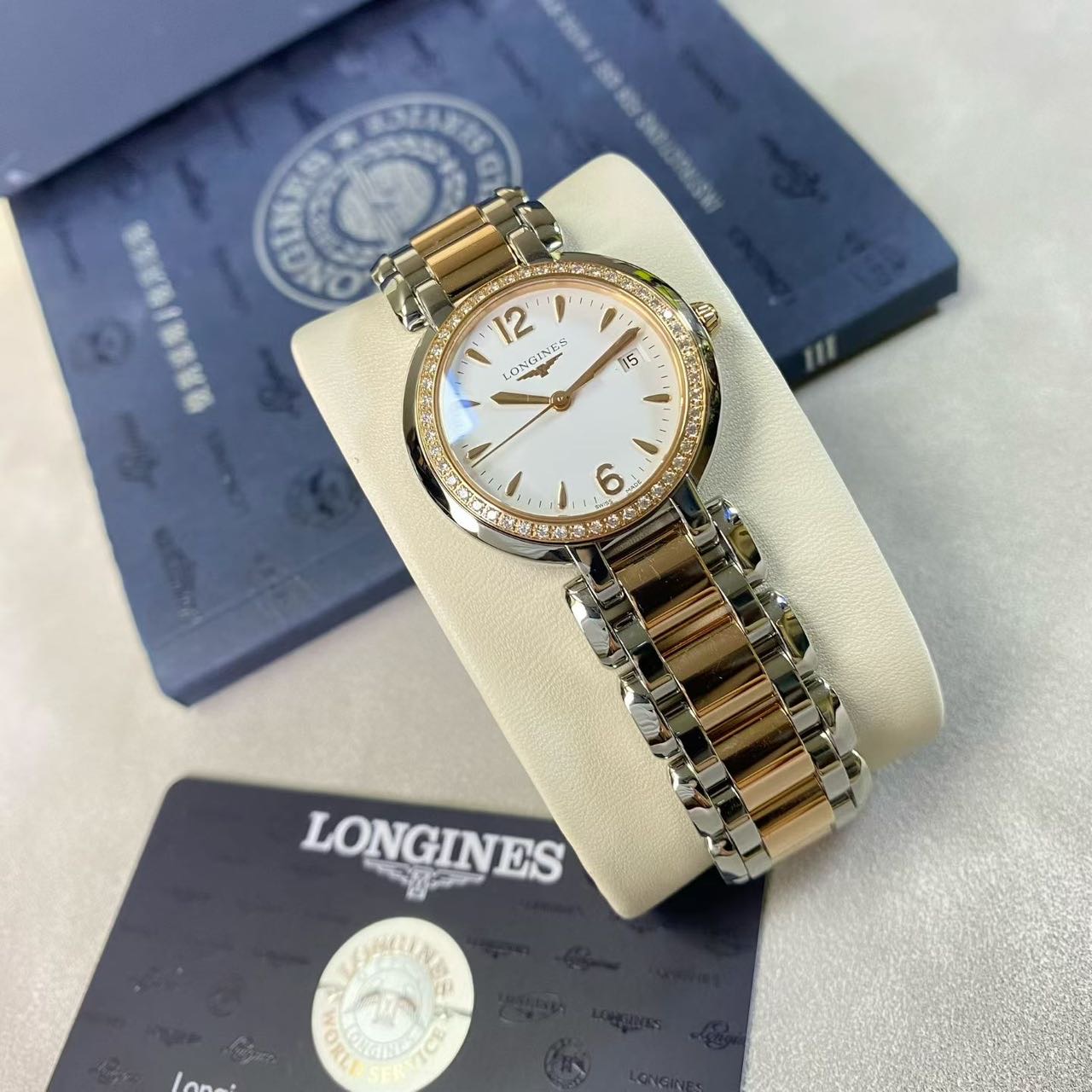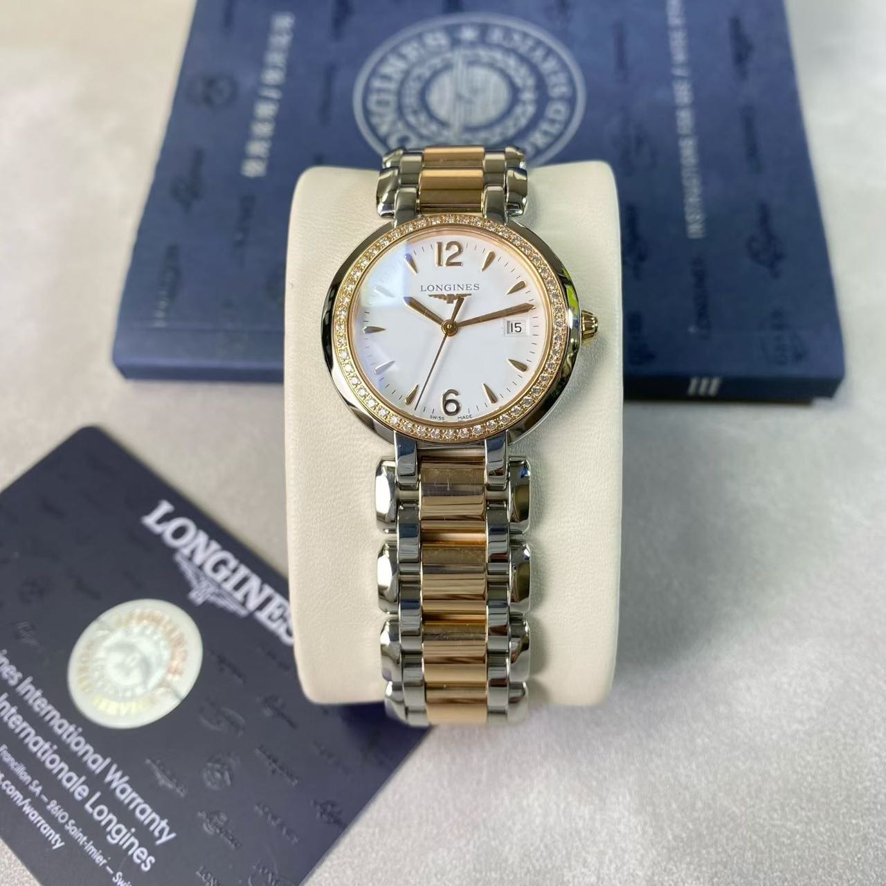 浪琴心月112系列,公价4.26万,表径30mm,全套附件齐全,整表18K玫瑰金相间,简约白盘 水滴刻度,外圈原钻镶嵌。