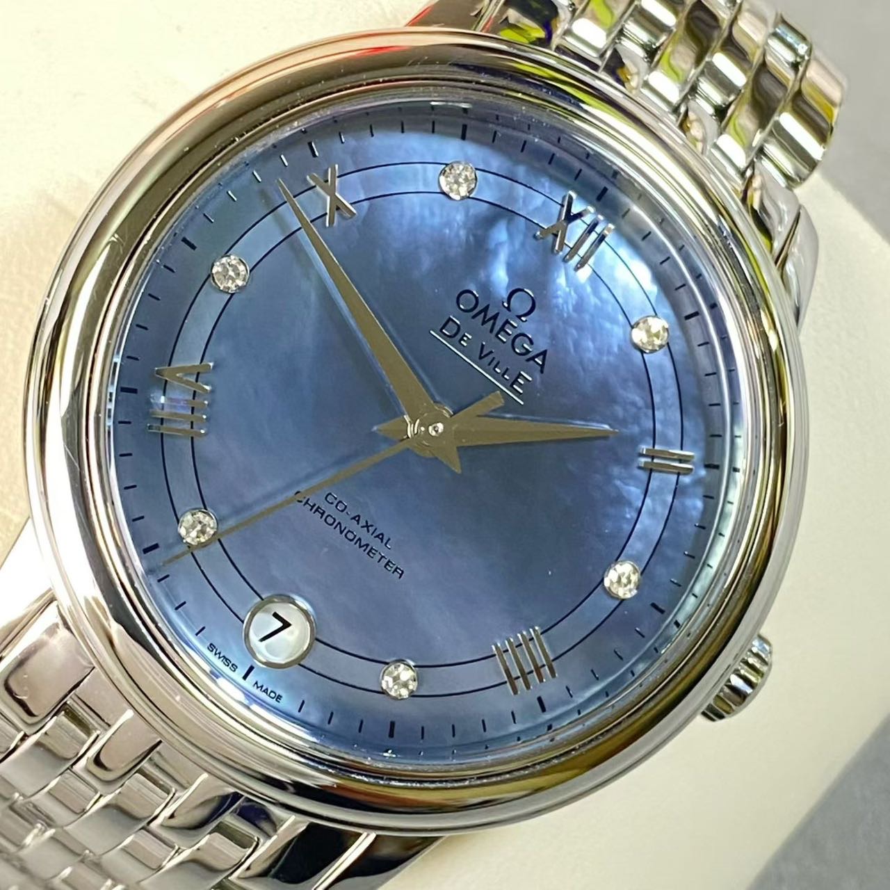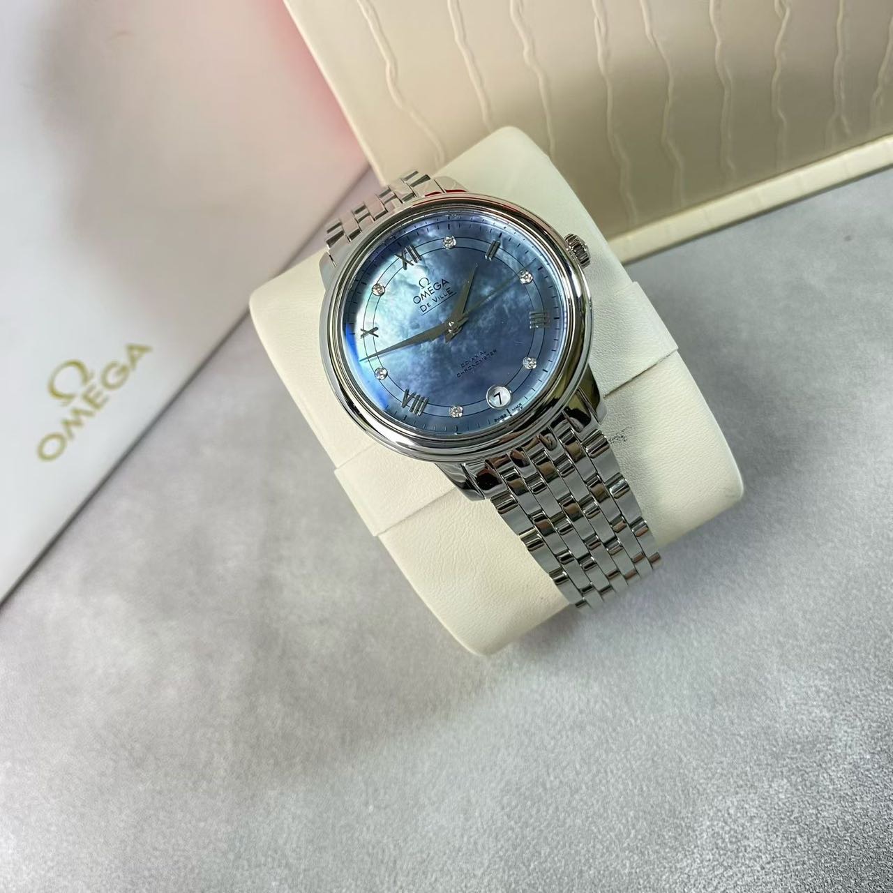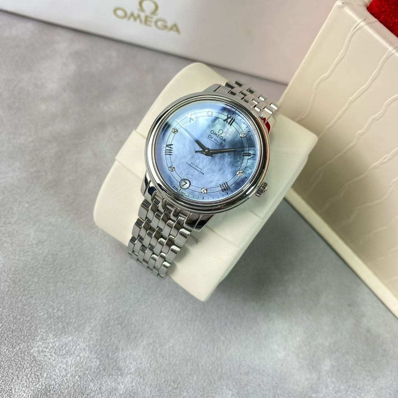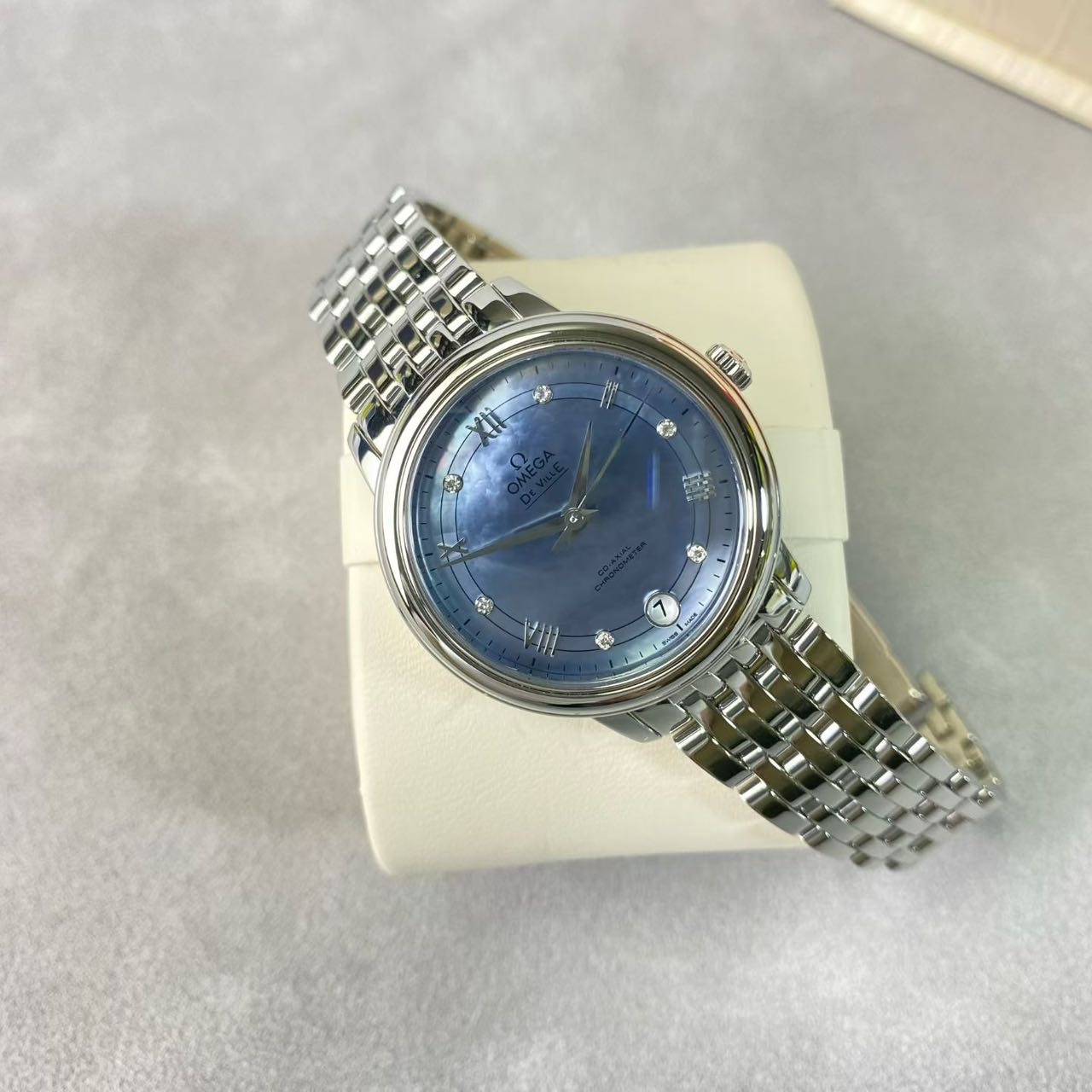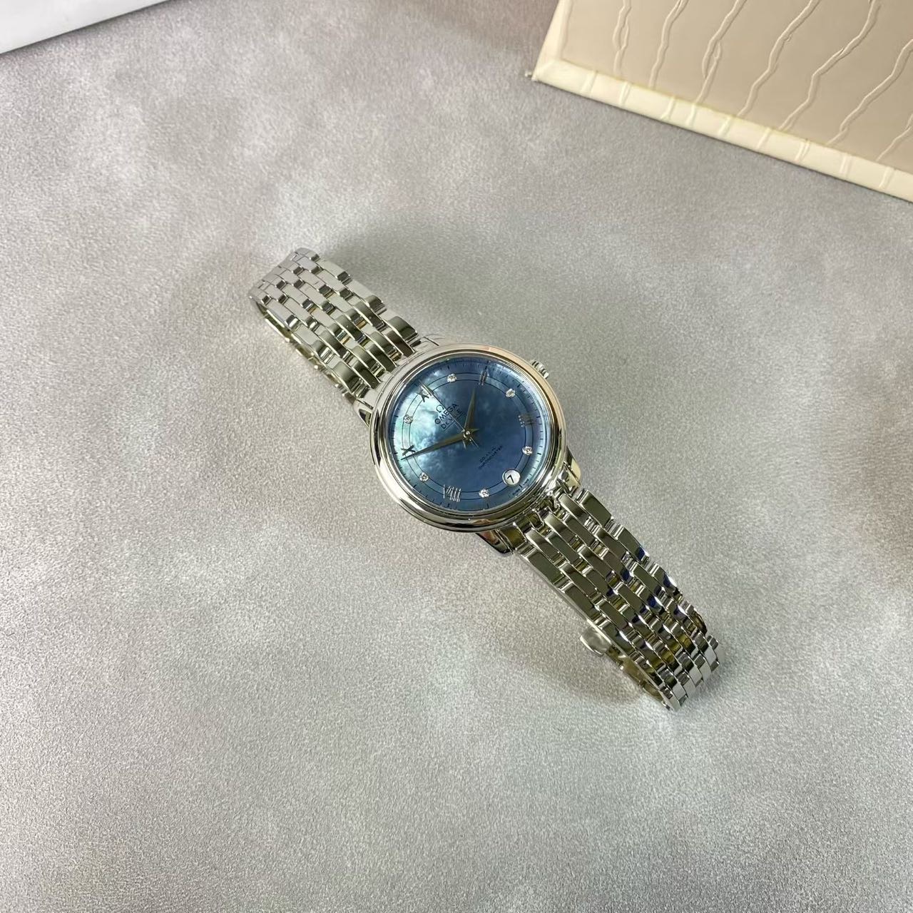 欧米茄碟飞系列机械女表,公价3.68万,表径33mm,单表,靓丽蓝贝母面表盘,钻石刻度镶嵌。