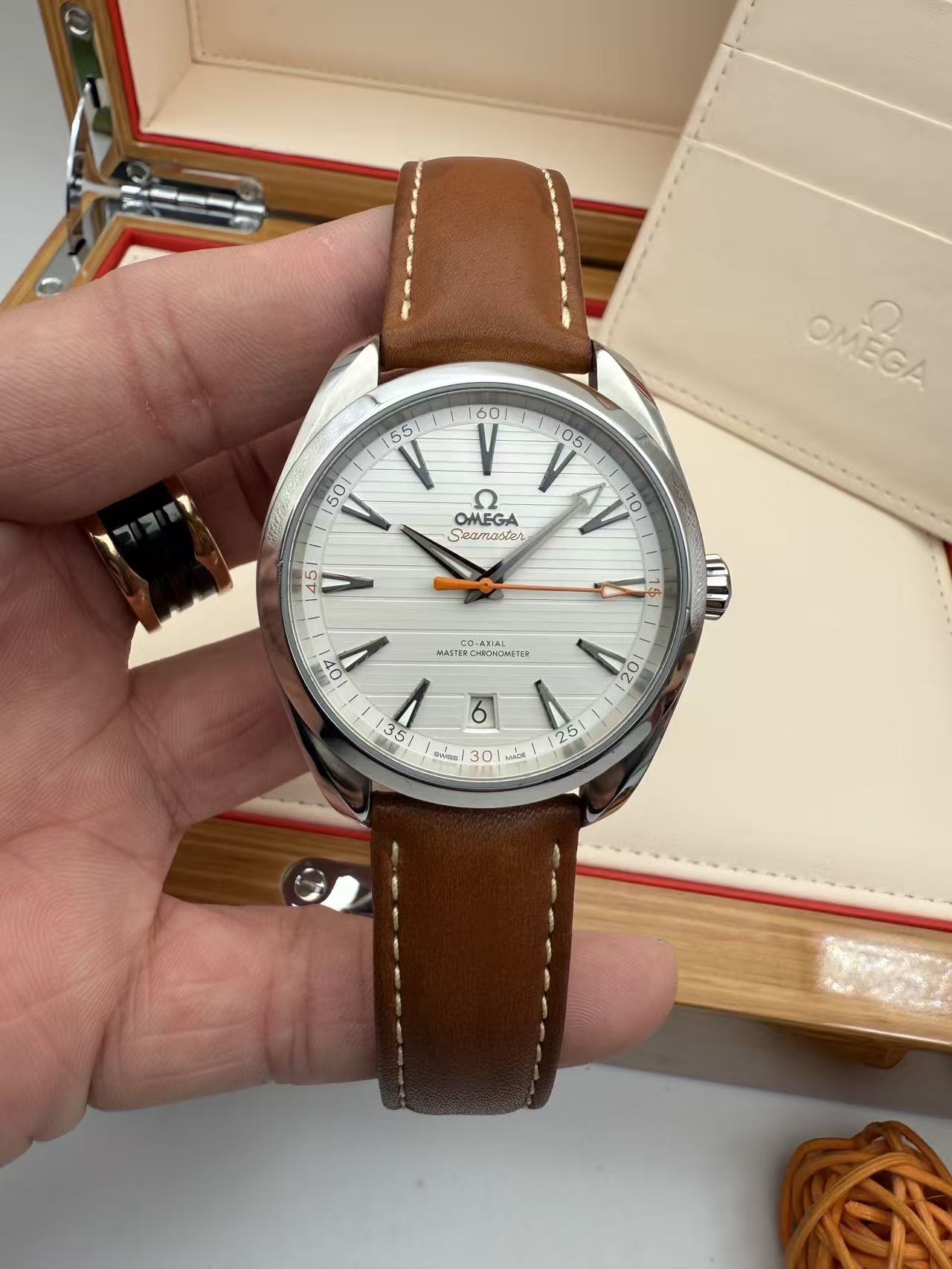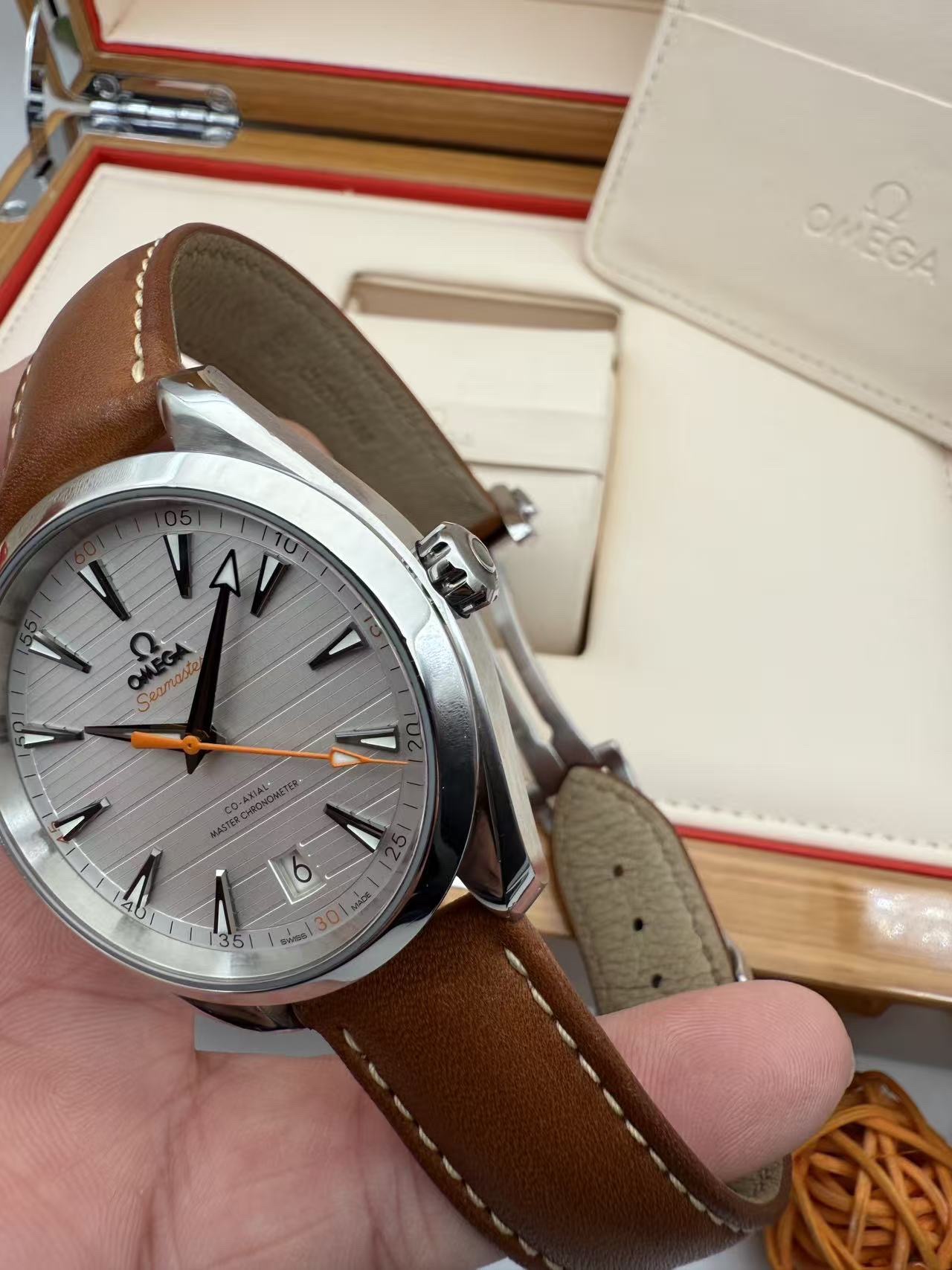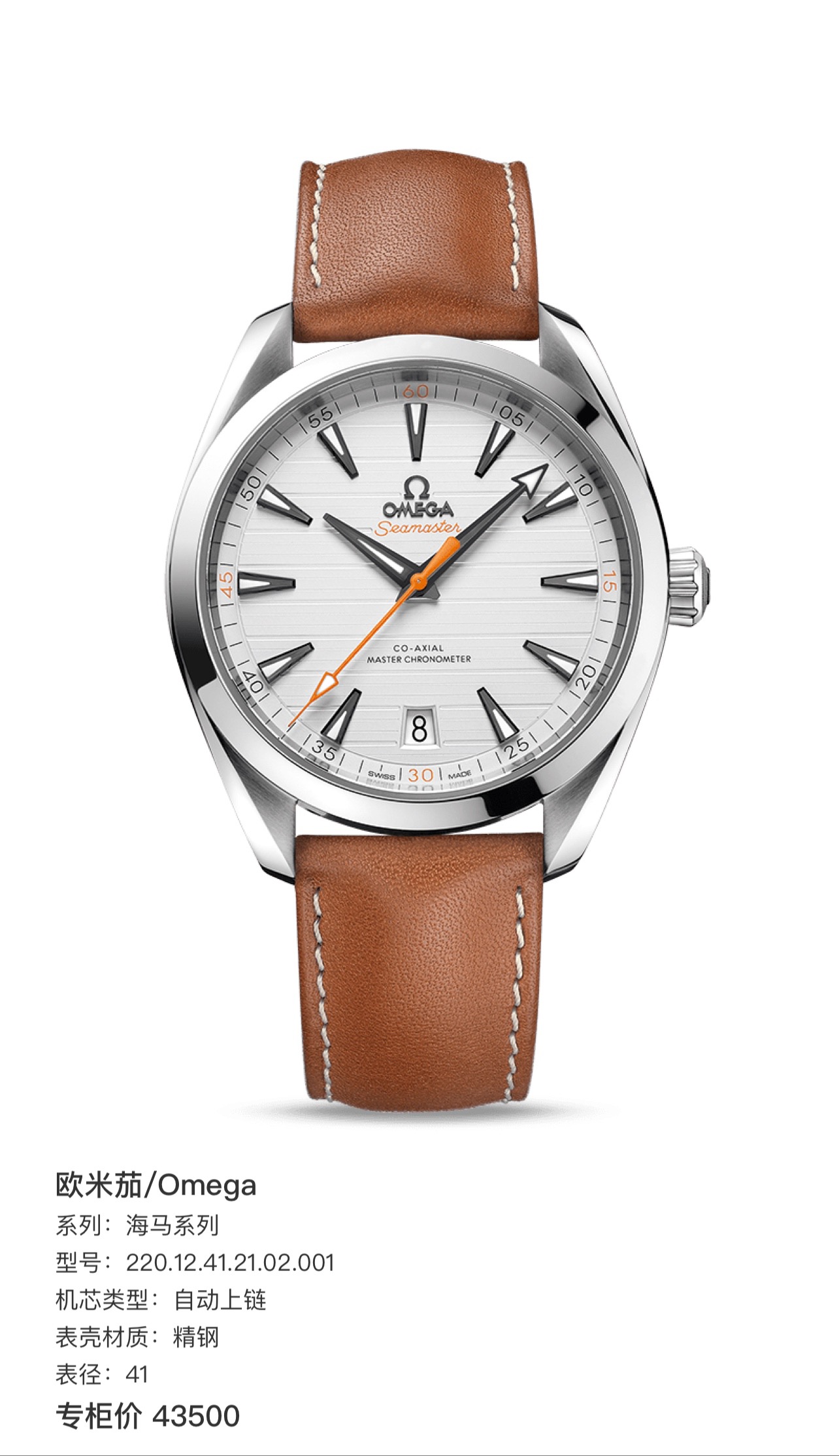 欧米茄/OMEGA 海马系列 牛皮表带 自动机械 男表220.12.41.21.02.001 表径41MM 厚度13.2MM 银白色表盘 指针刻度均带有夜光显示 6点位设有日历窗 旋入式表冠 搭载至臻天文台认证Cal.8900机芯 60小时动力储备 防水深度150M 弧拱形双面防反光耐磨损蓝宝石水晶镜面 全套