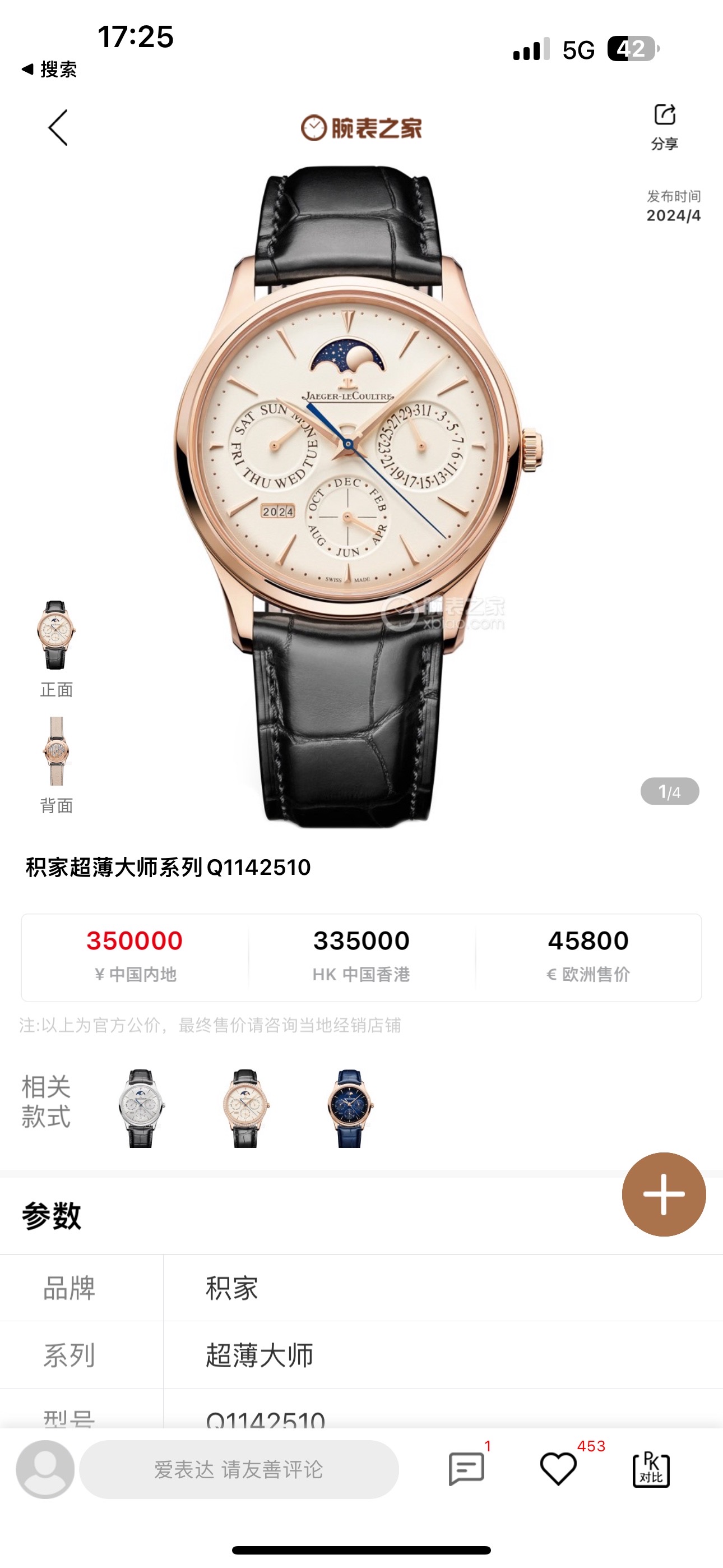 未使用 新款 万年历 积家/Jaeger LeCoultre 大师 Q1142510 自动机械 18k玫瑰金 39毫米 专柜价350000