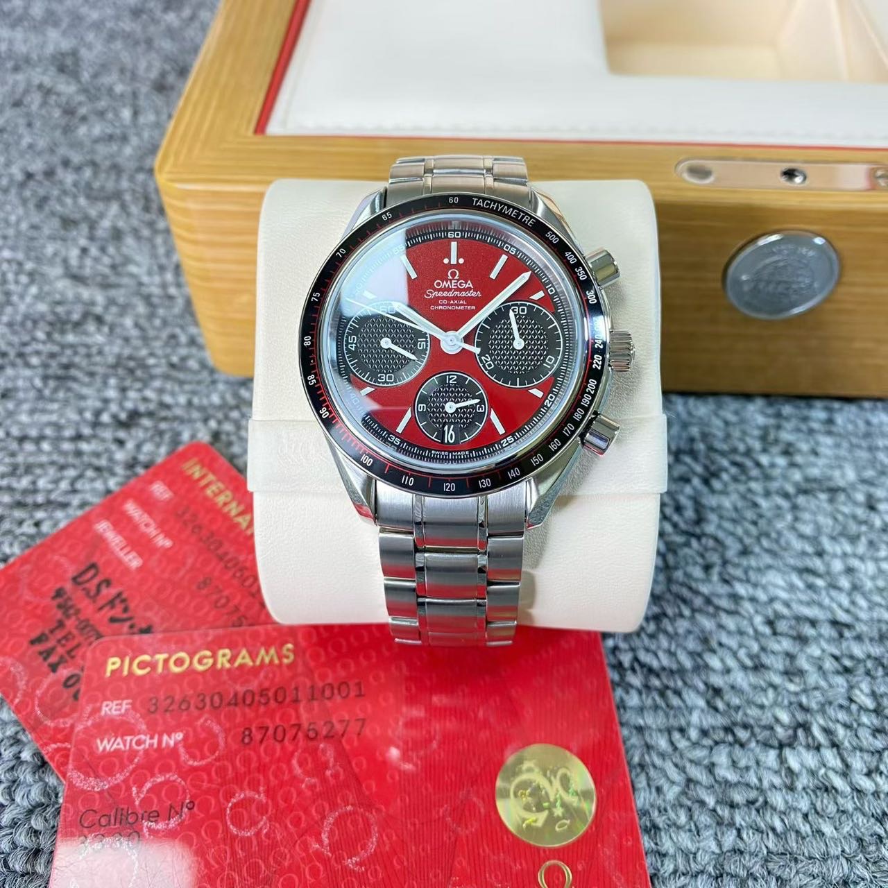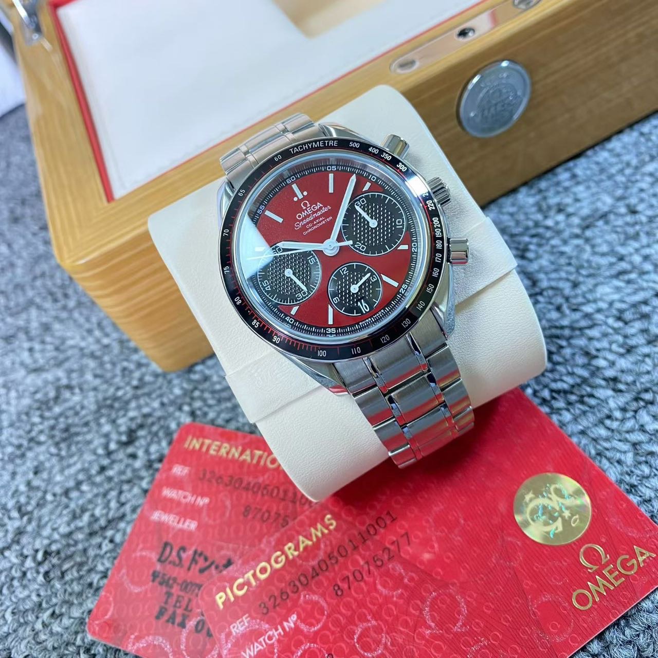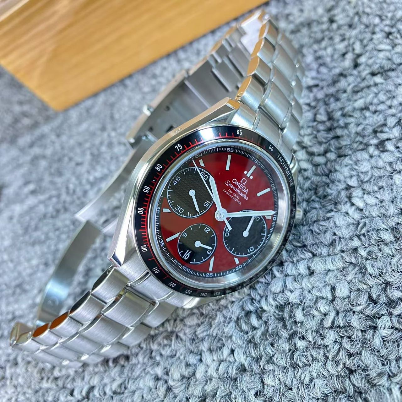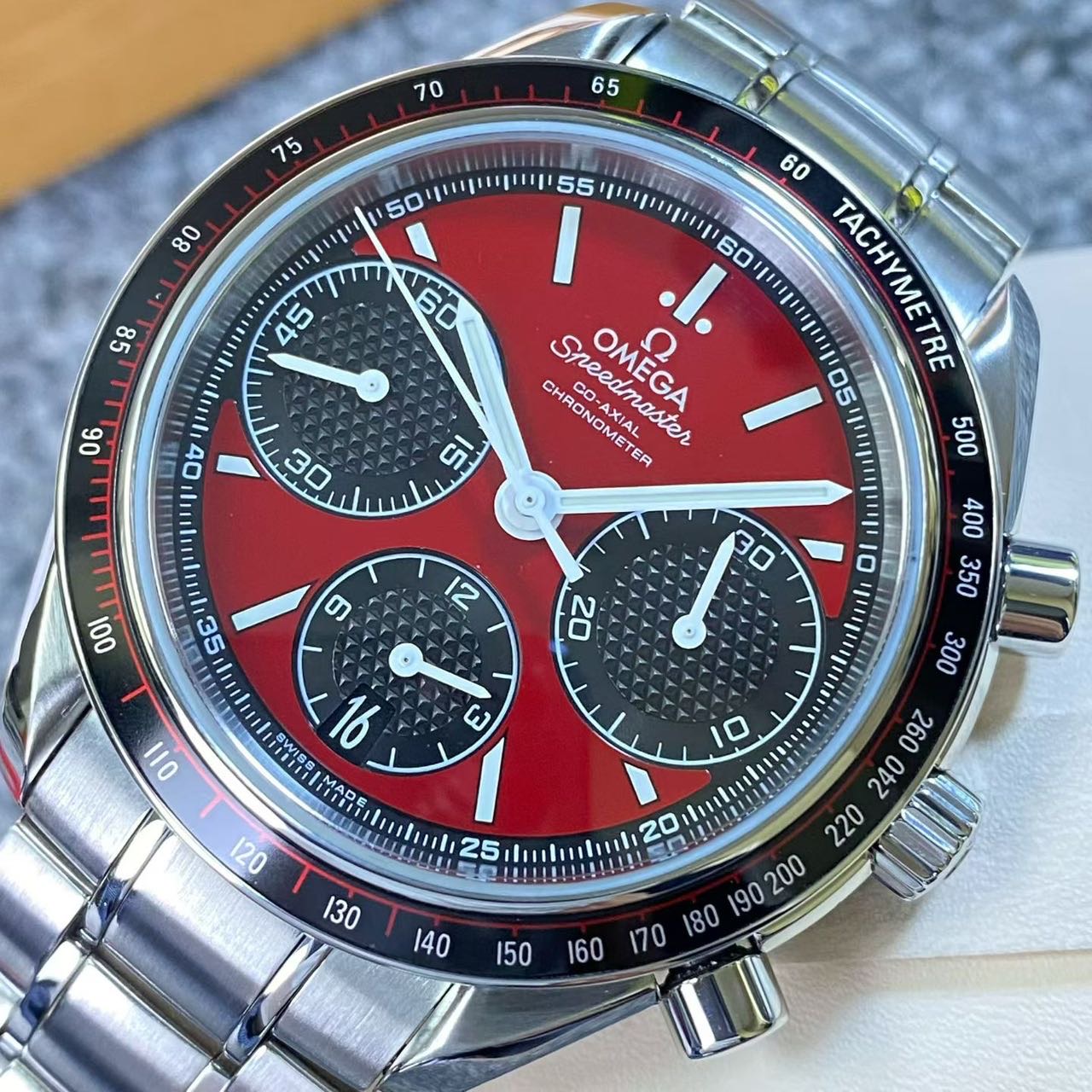 欧米茄超霸王系列赛车款,公价3.35万,表径40mm,全套附件齐全,稀有红黑配色,,经典三眼计时布局,搭载同轴天文台3330机芯,热门款。