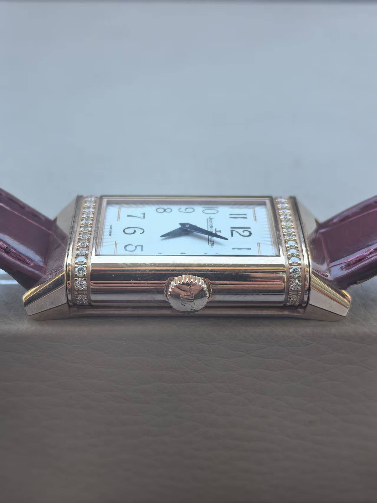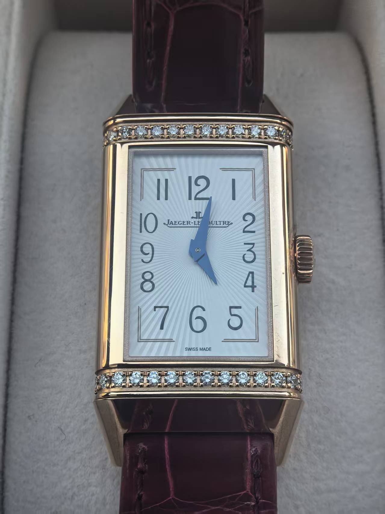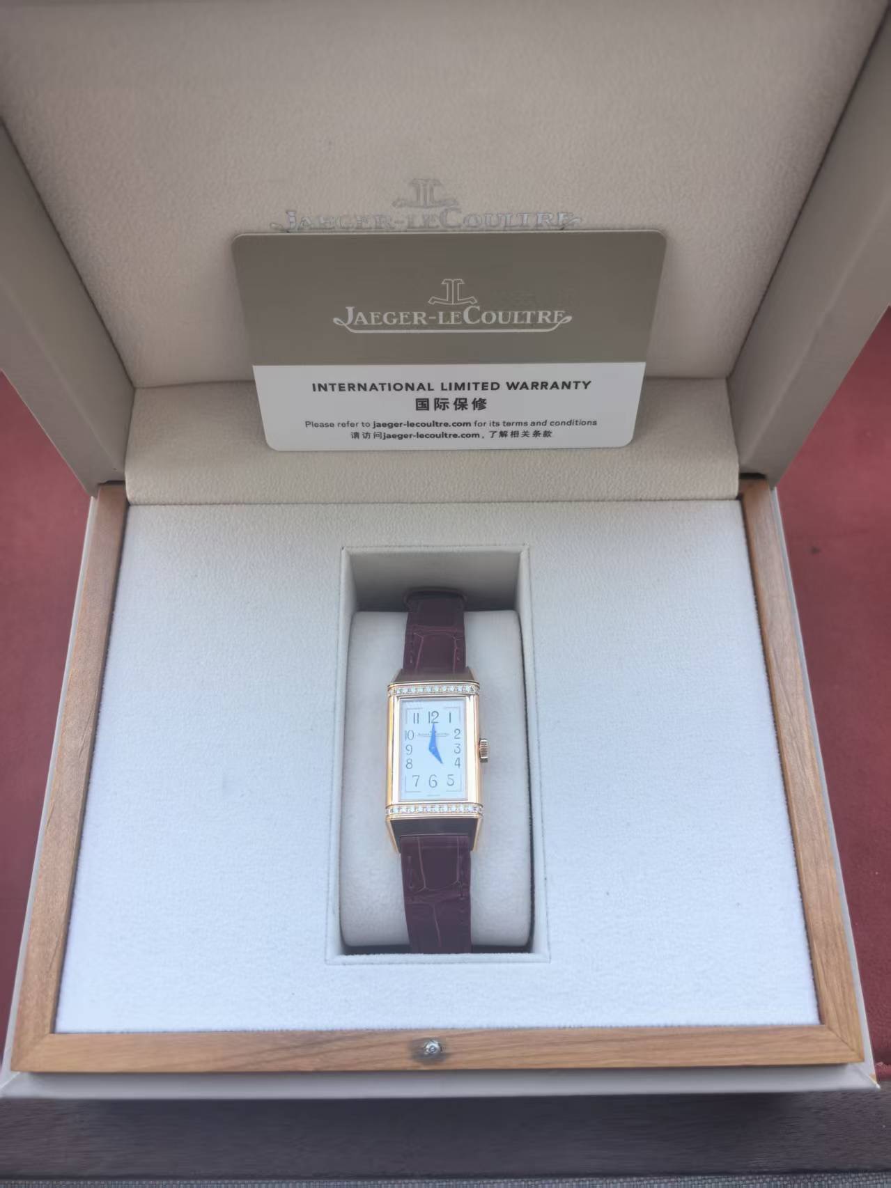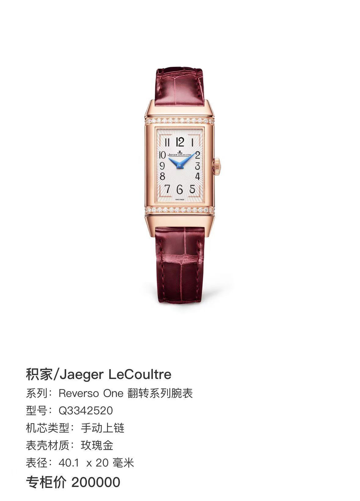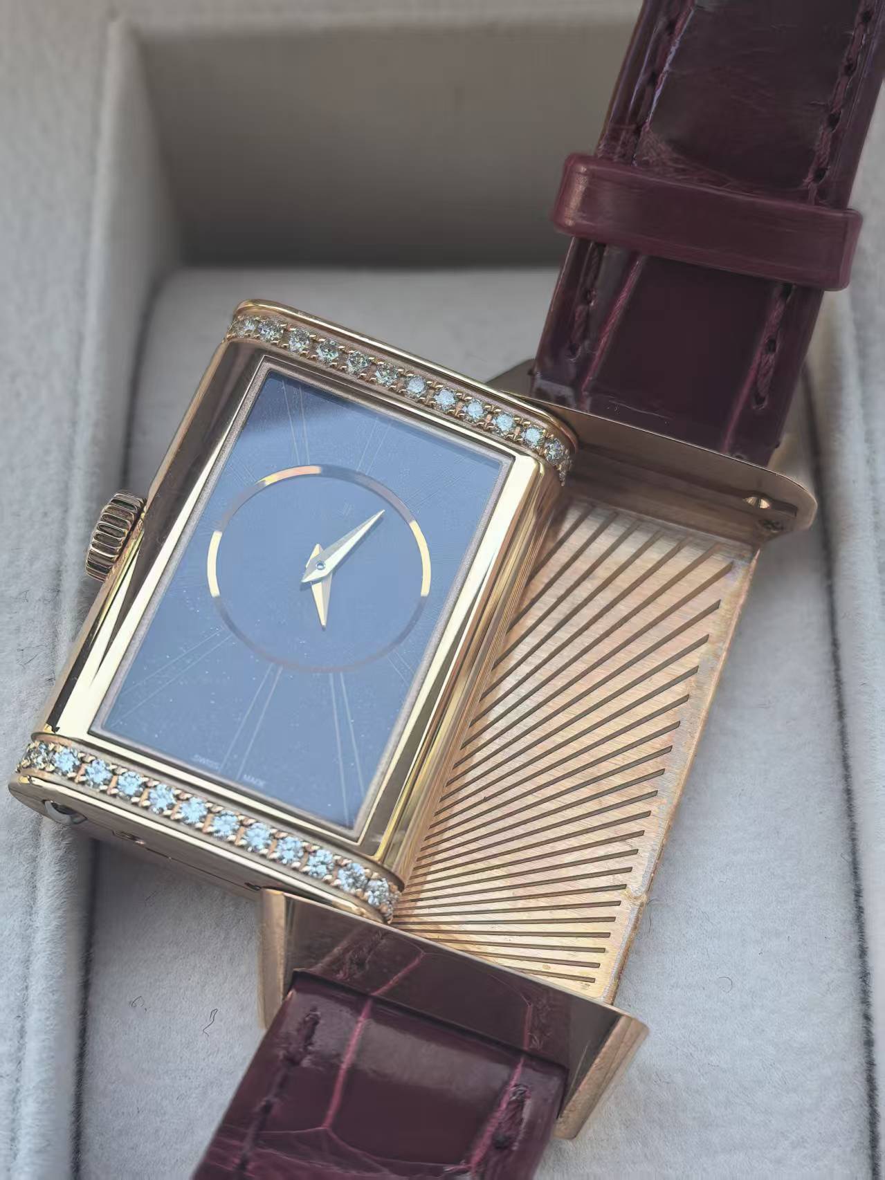 积家翻转系列Q3342520女士手动腕表,18k玫瑰金材质, 40.1 x 20mm表径,一面浓烈、一面沉稳,这是品牌翻转系列腕表的特色。这款腕表表盘正面为银色,背面为暗红色,颜色浓烈,对比鲜明。正面配备太阳放射状玑镂饰纹的银色表盘,非常适于日间佩戴;背面勃艮第红漆面表盘则非常适合晚宴华服。采用Cal.844型手动机械机芯,上满一次链具有38小时左右的动力。19年全套附件,延保到27年,原始成色