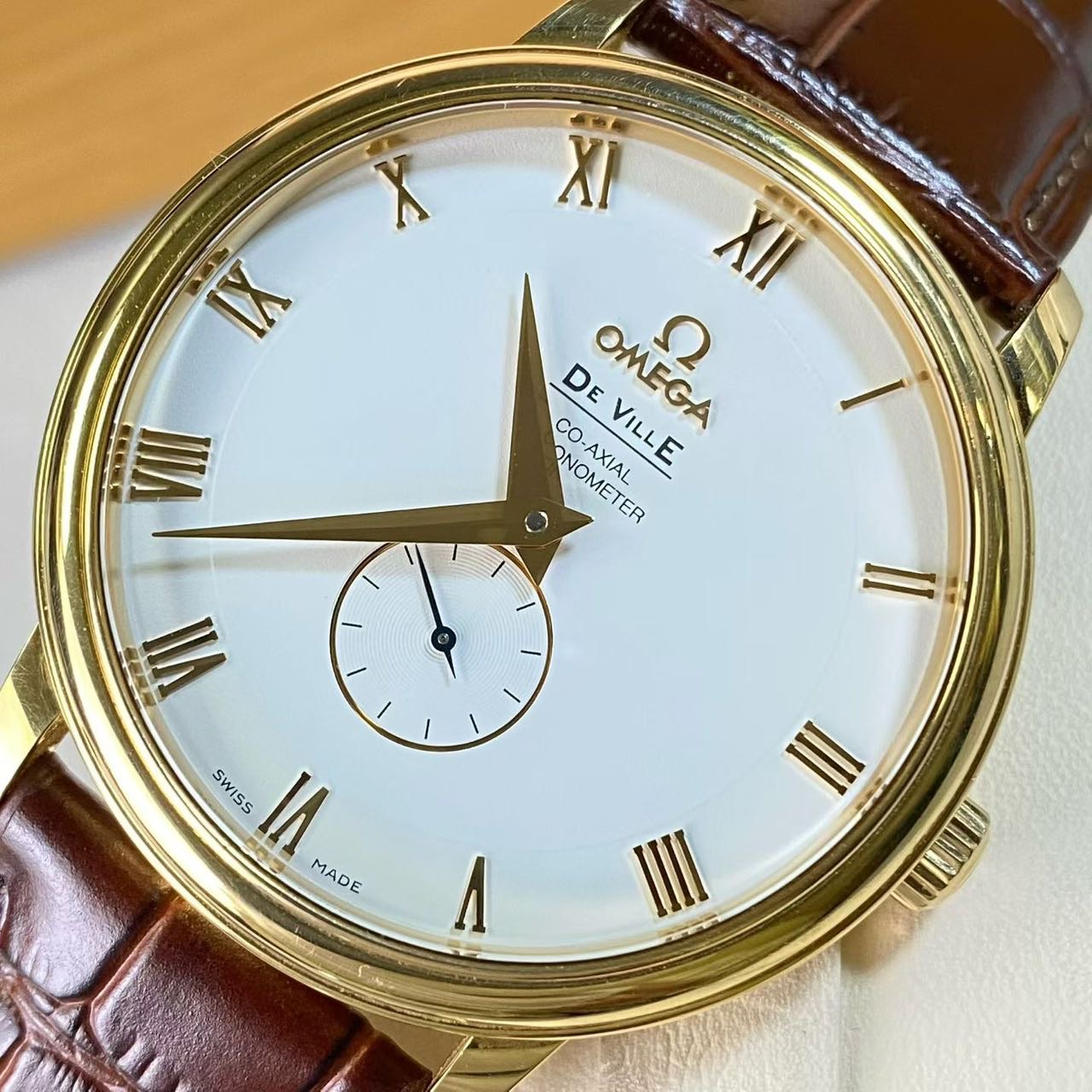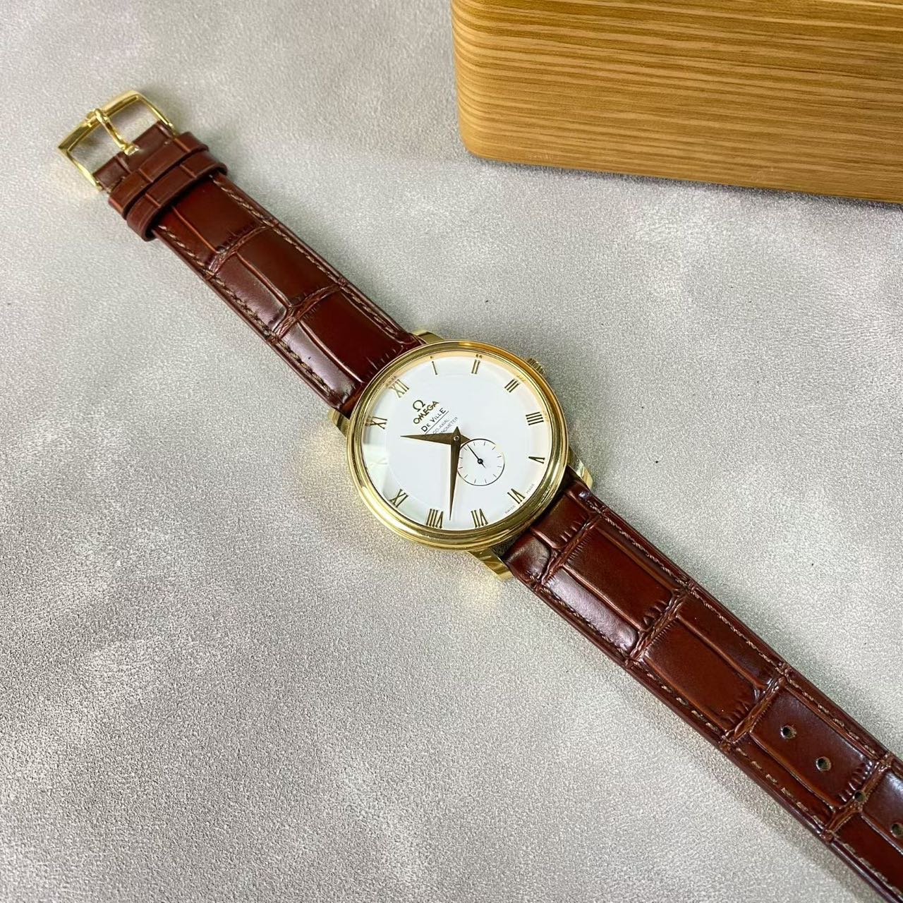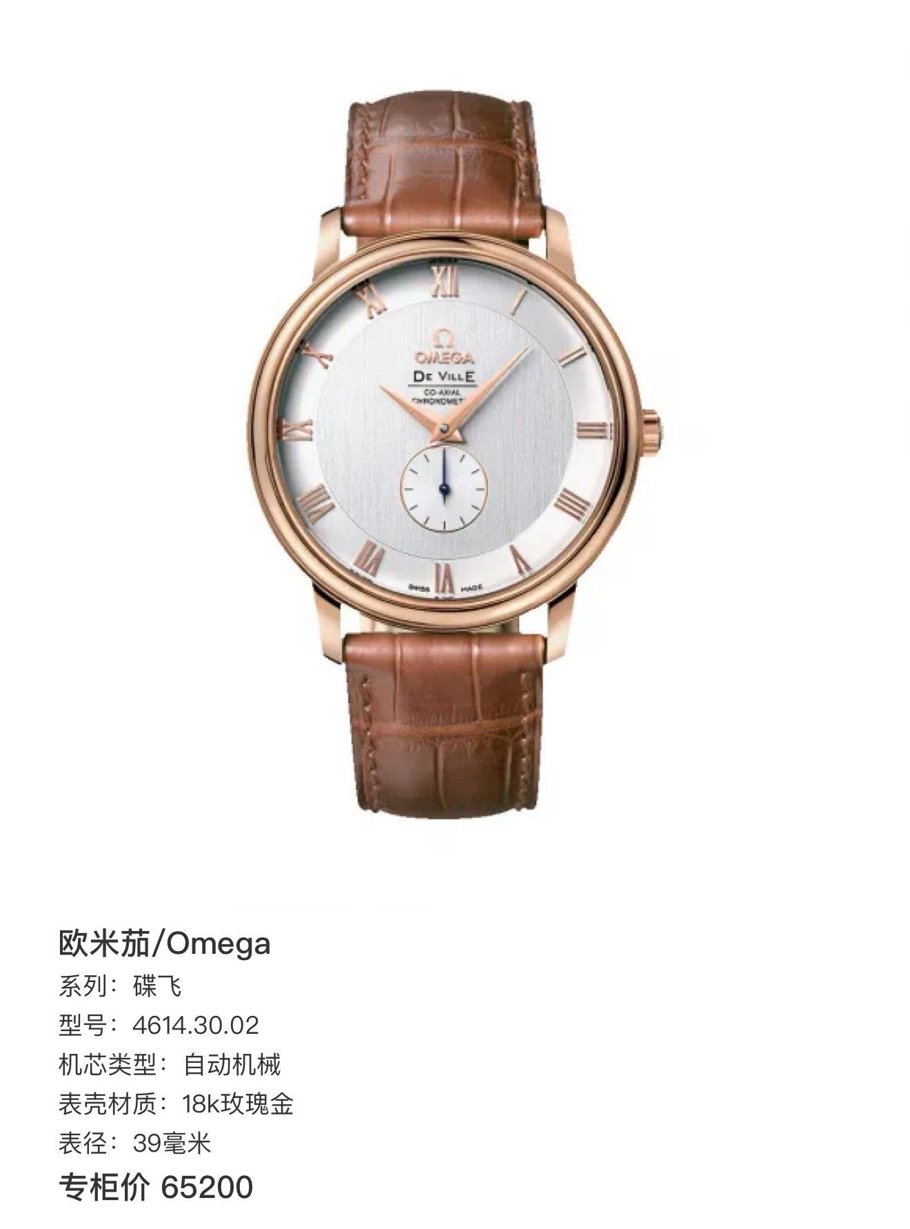 欧米茄碟飞系列,公价6.5万,表径39mm,单表,18K玫瑰金材质表壳 独立秒针设计。