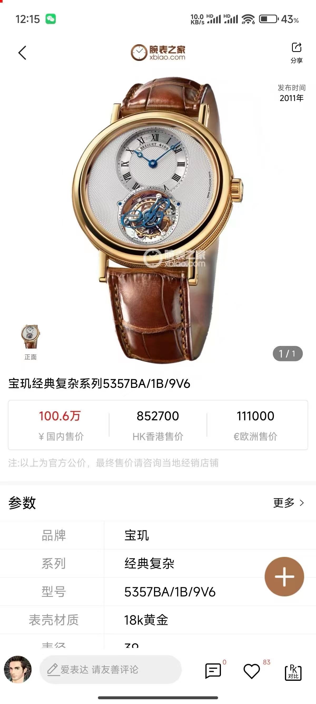 新收 宝玑经典复杂5357BA/1B/9V6 手动机械 18k黄金 39毫米 专柜价100.6万 单表好价