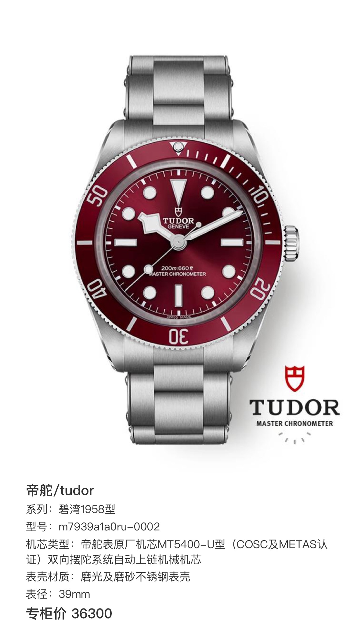 新收 帝舵碧湾1958型m7939a1a0ru-0002 自动上链机械机芯 磨光及磨砂不锈钢表壳 39mm 专柜价36300,全新全套好价。