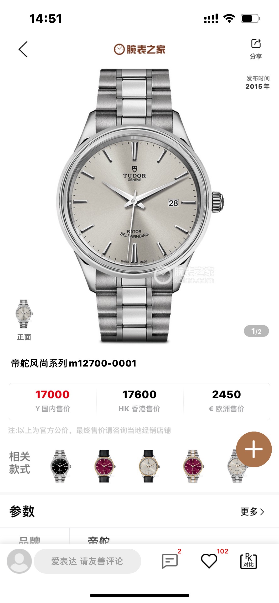 帝舵/Tudor 风尚系列 m12700-0001 自动上链 钢表壳 尺寸41毫米 专柜价17000,全新未使用2021年保卡