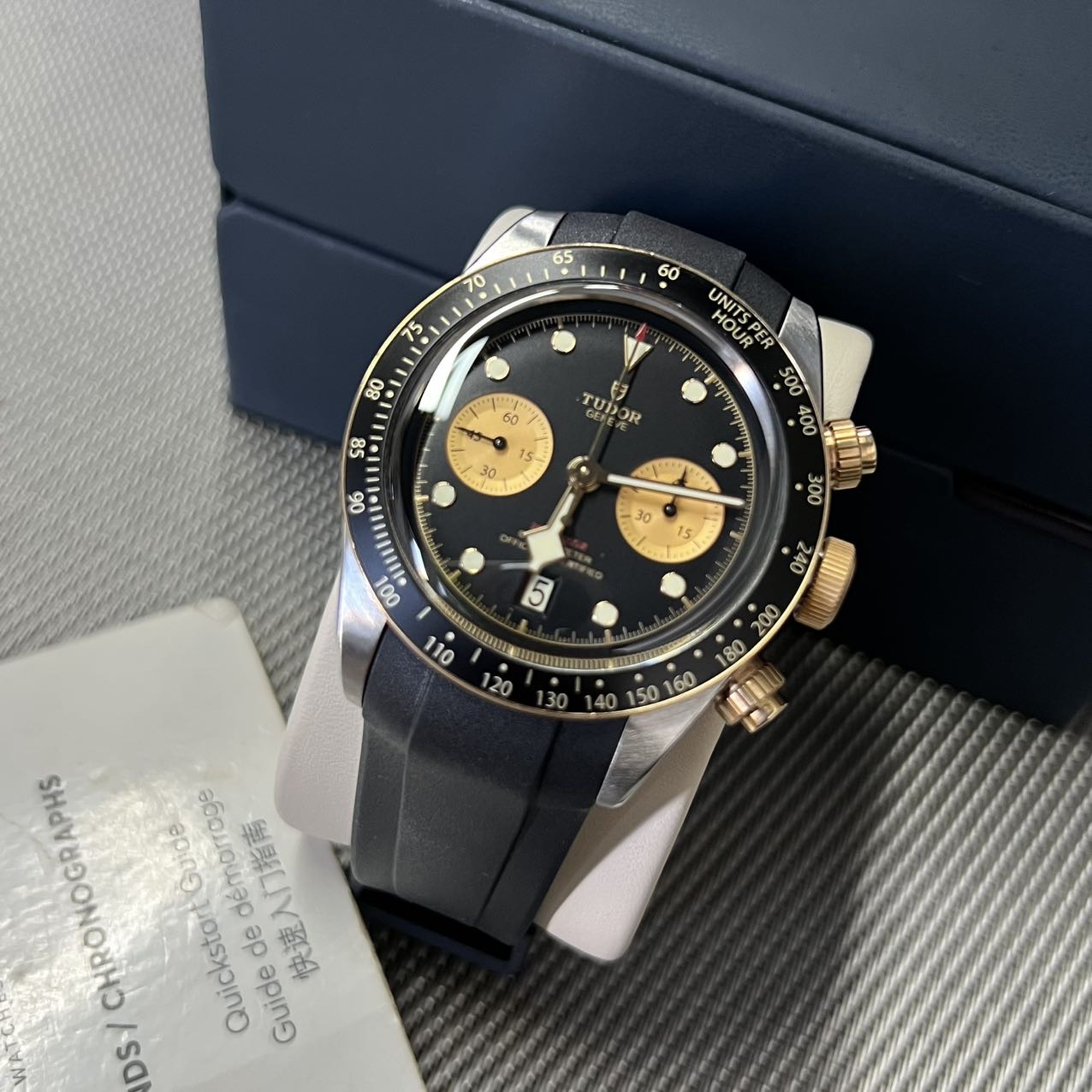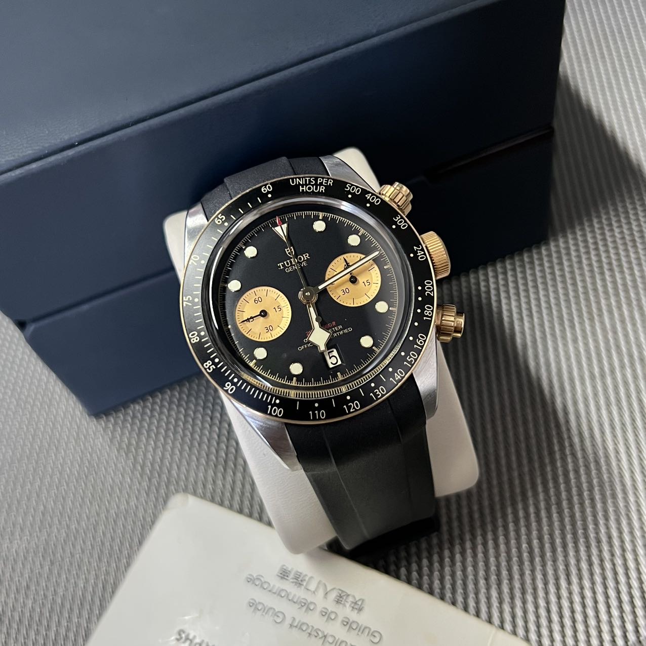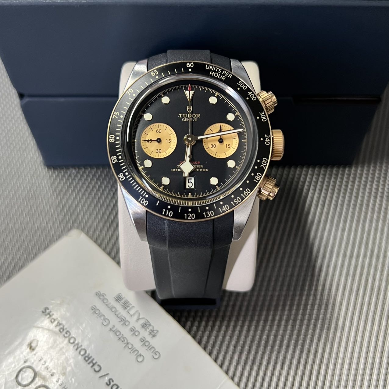 帝舵碧湾系列-79363,公价5.5万,表径41mm,全套附件齐全(2022年购买)新,18K黄金相间,金色双眼计时,搭载自产MT5813机芯 70小时长动力 天文台,原厂皮带,后配钢带。