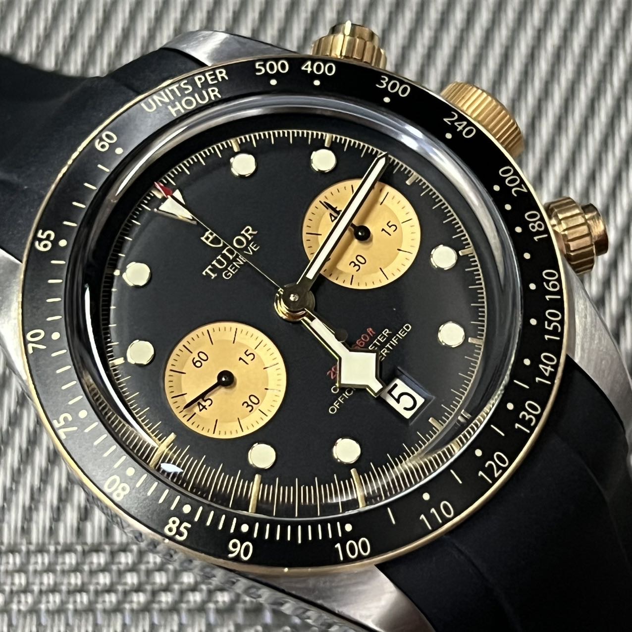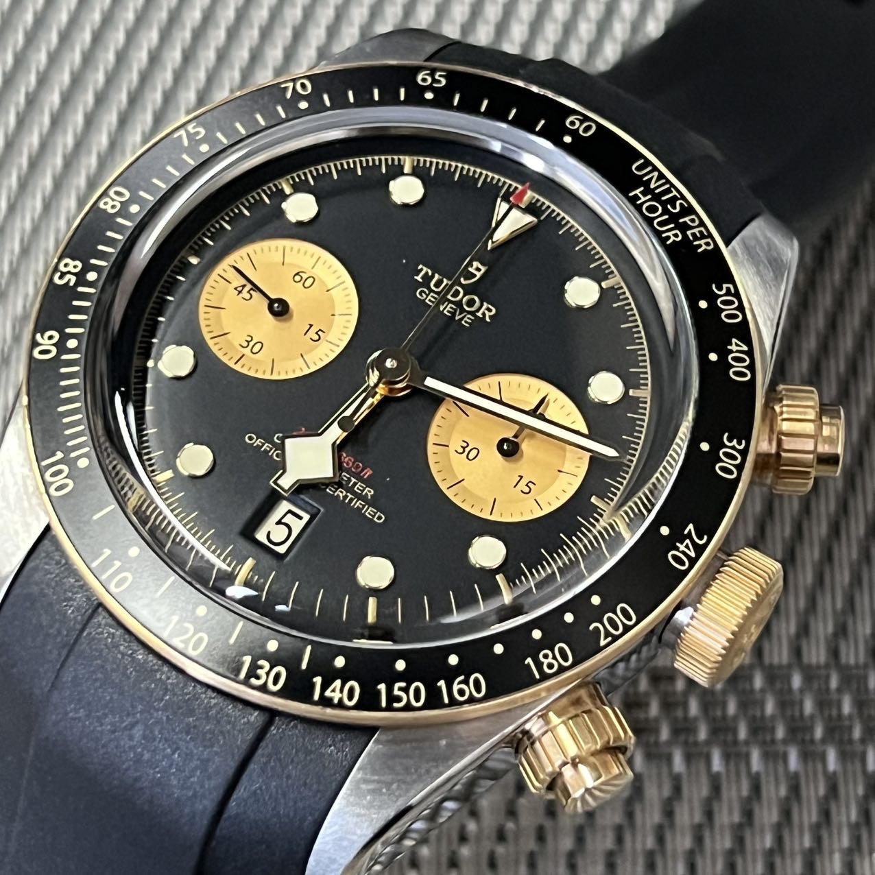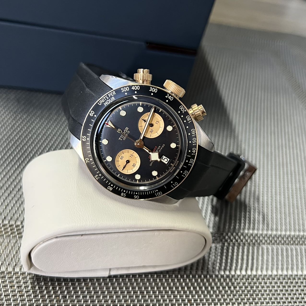 帝舵碧湾系列-79363,公价5.5万,表径41mm,全套附件齐全(2022年购买)新,18K黄金相间,金色双眼计时,搭载自产MT5813机芯 70小时长动力 天文台,原厂皮带,后配钢带。