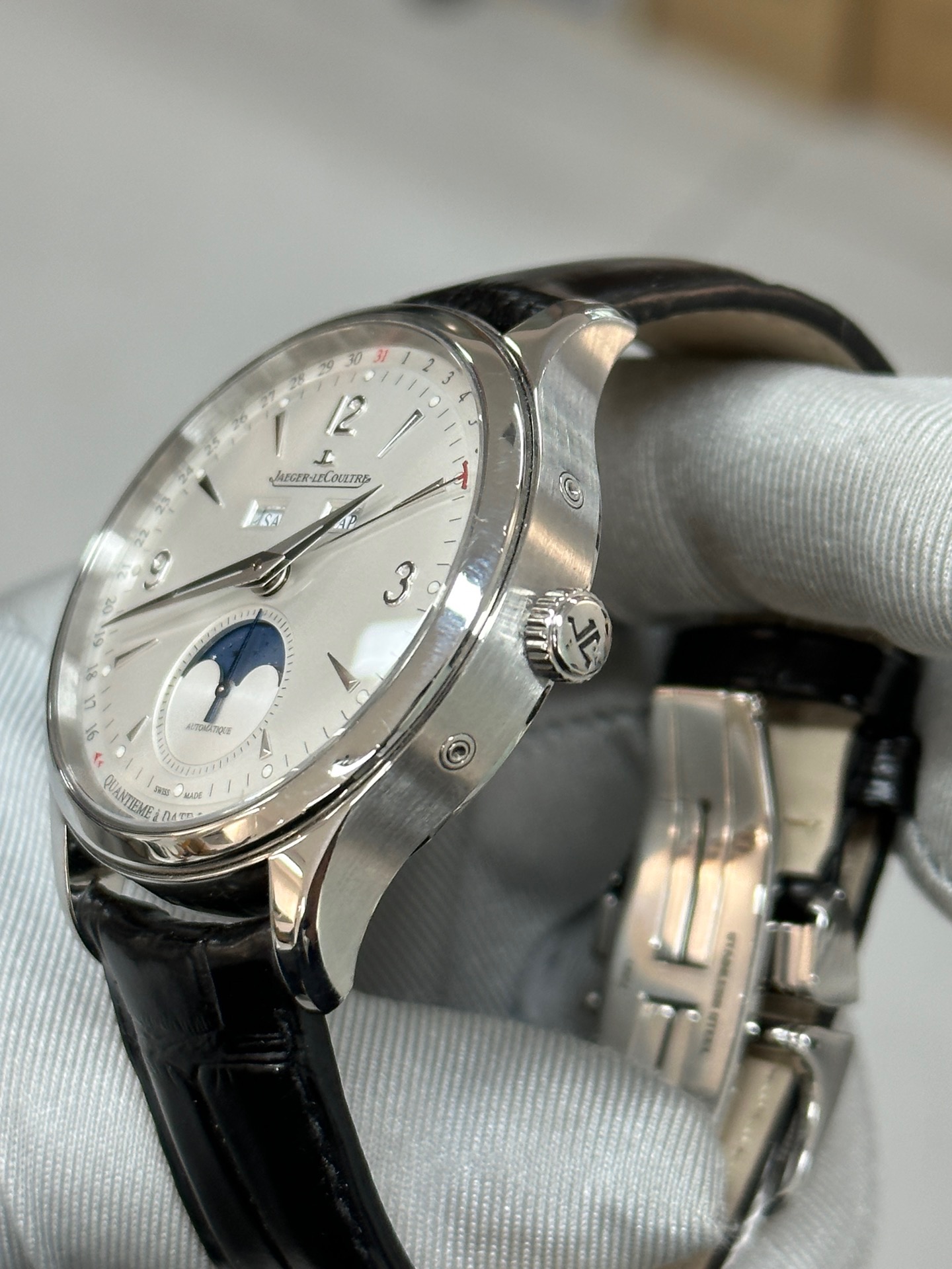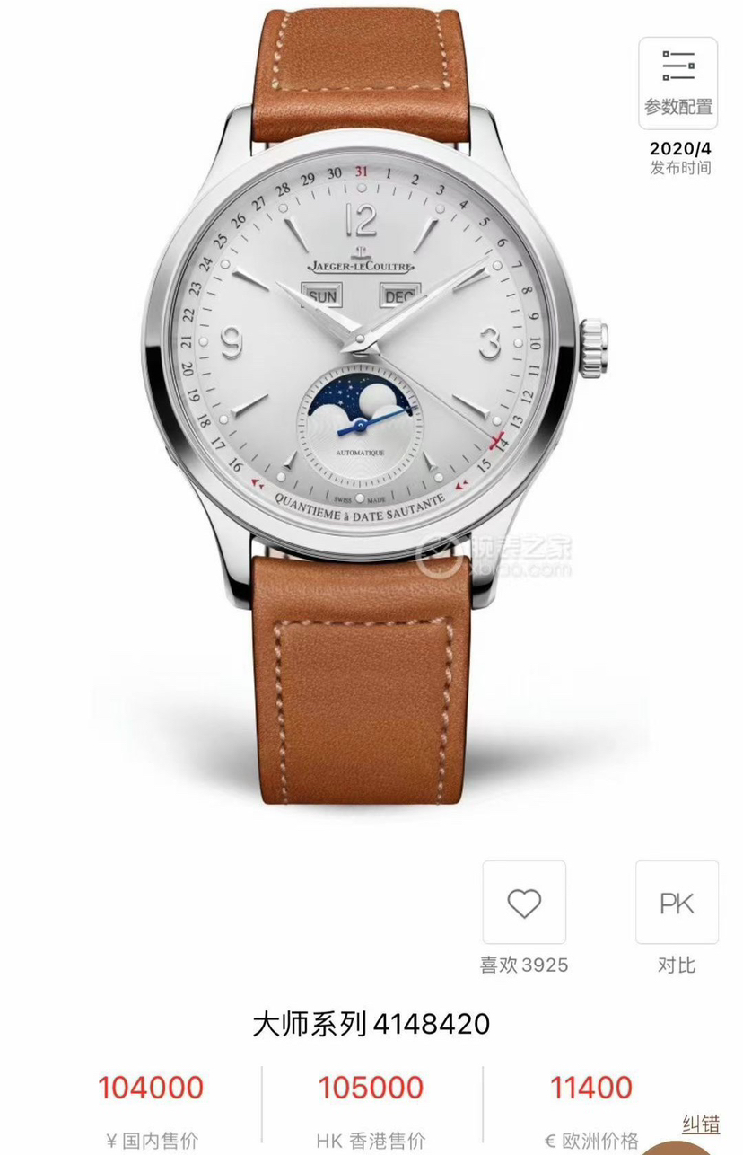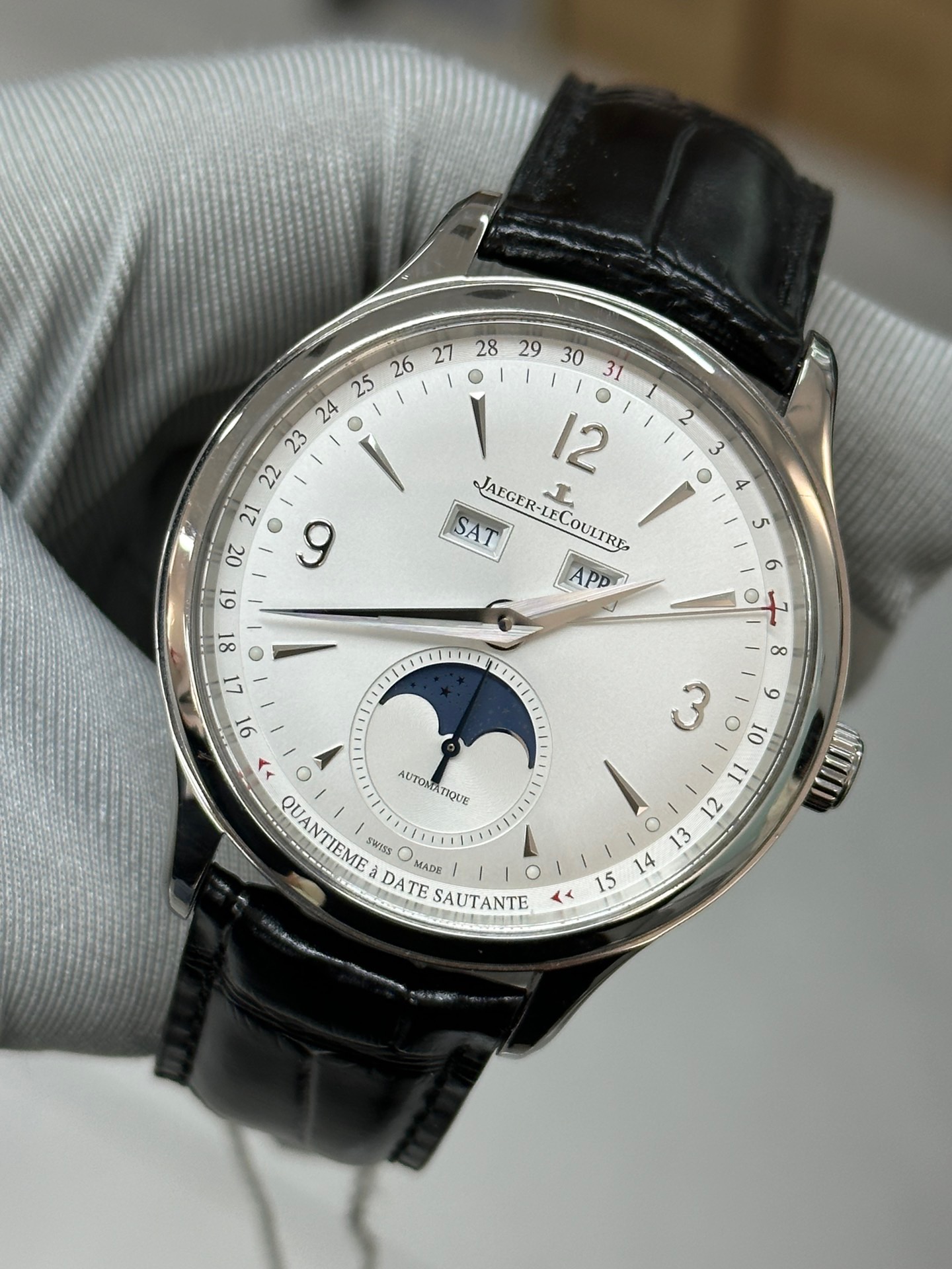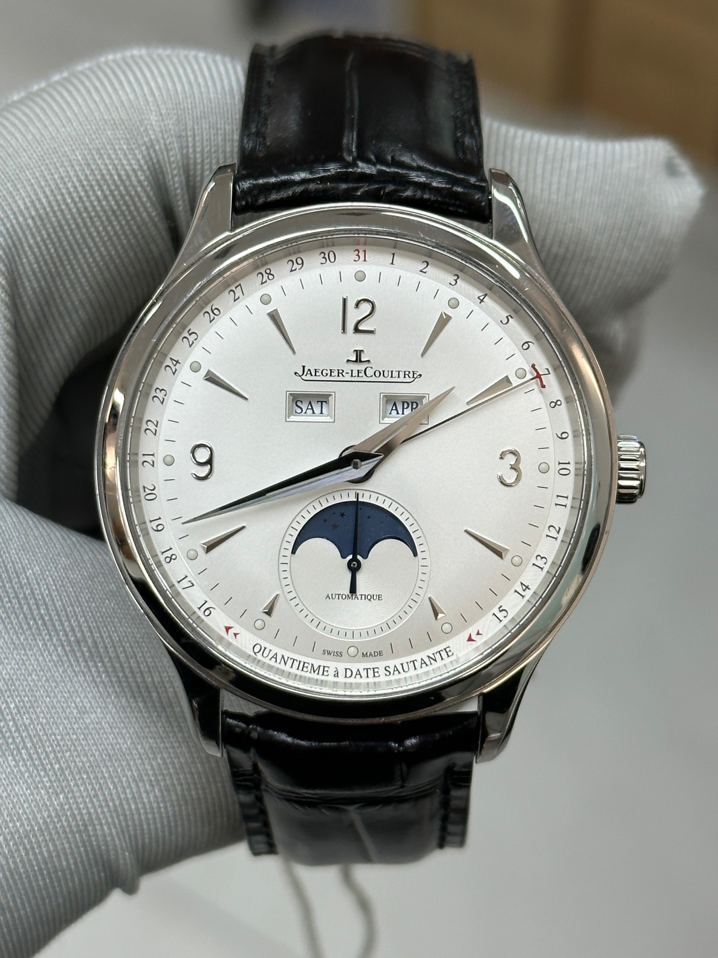 全套积家大师系列 型号:4148420男士自动机械腕表 经典大师全历月相,表径40mm 白色表盘,银色刻度指针,复杂功能全历显示,6点位超美星空月相 折叠表扣 公价113000 现好价