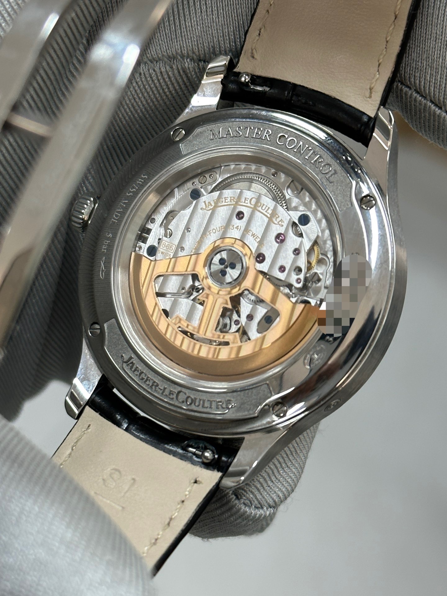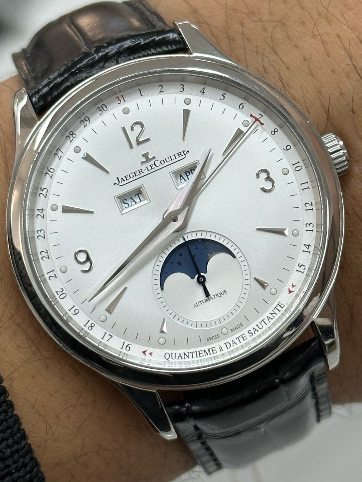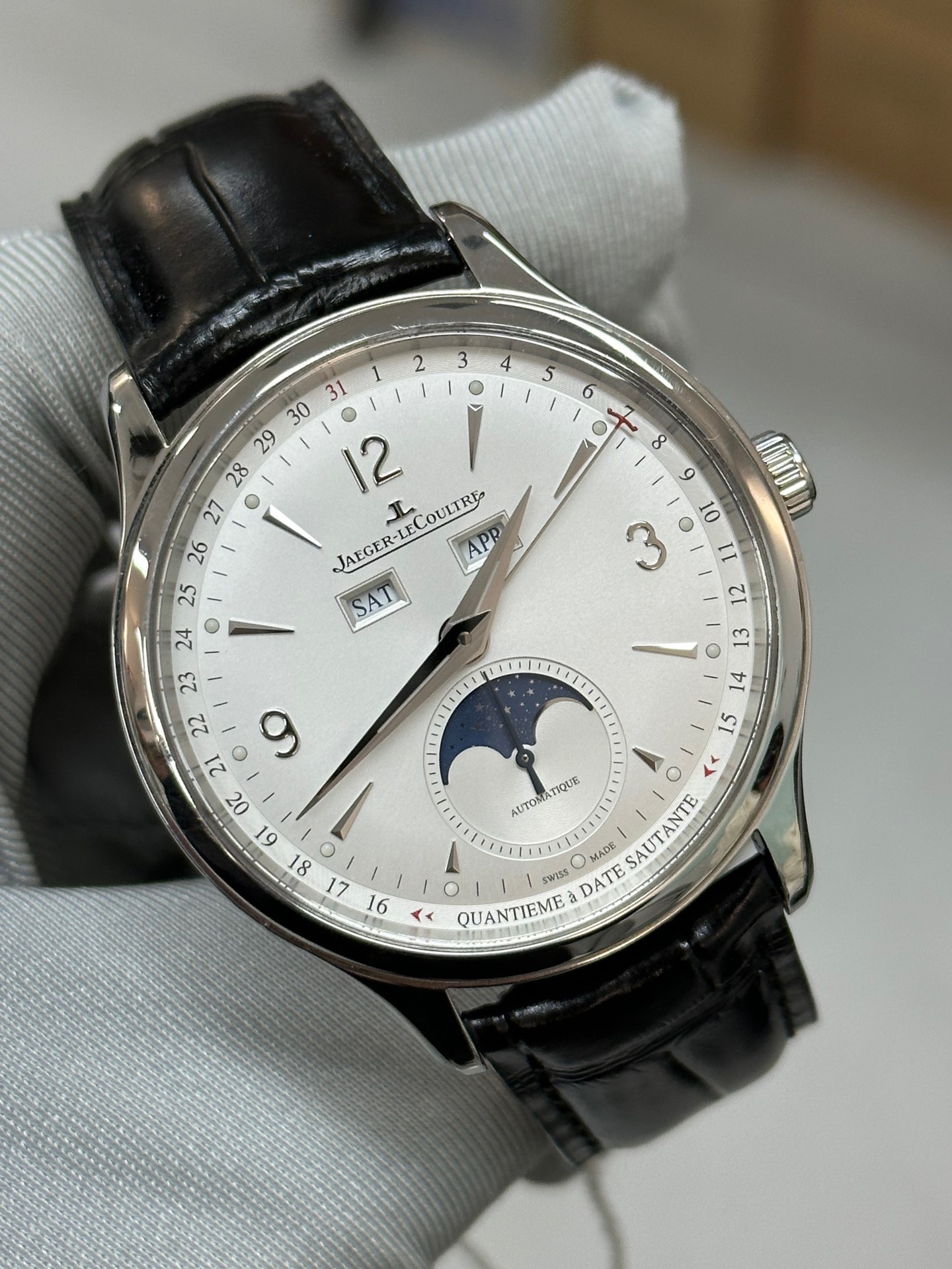 全套积家大师系列 型号:4148420男士自动机械腕表 经典大师全历月相,表径40mm 白色表盘,银色刻度指针,复杂功能全历显示,6点位超美星空月相 折叠表扣 公价113000 现好价
