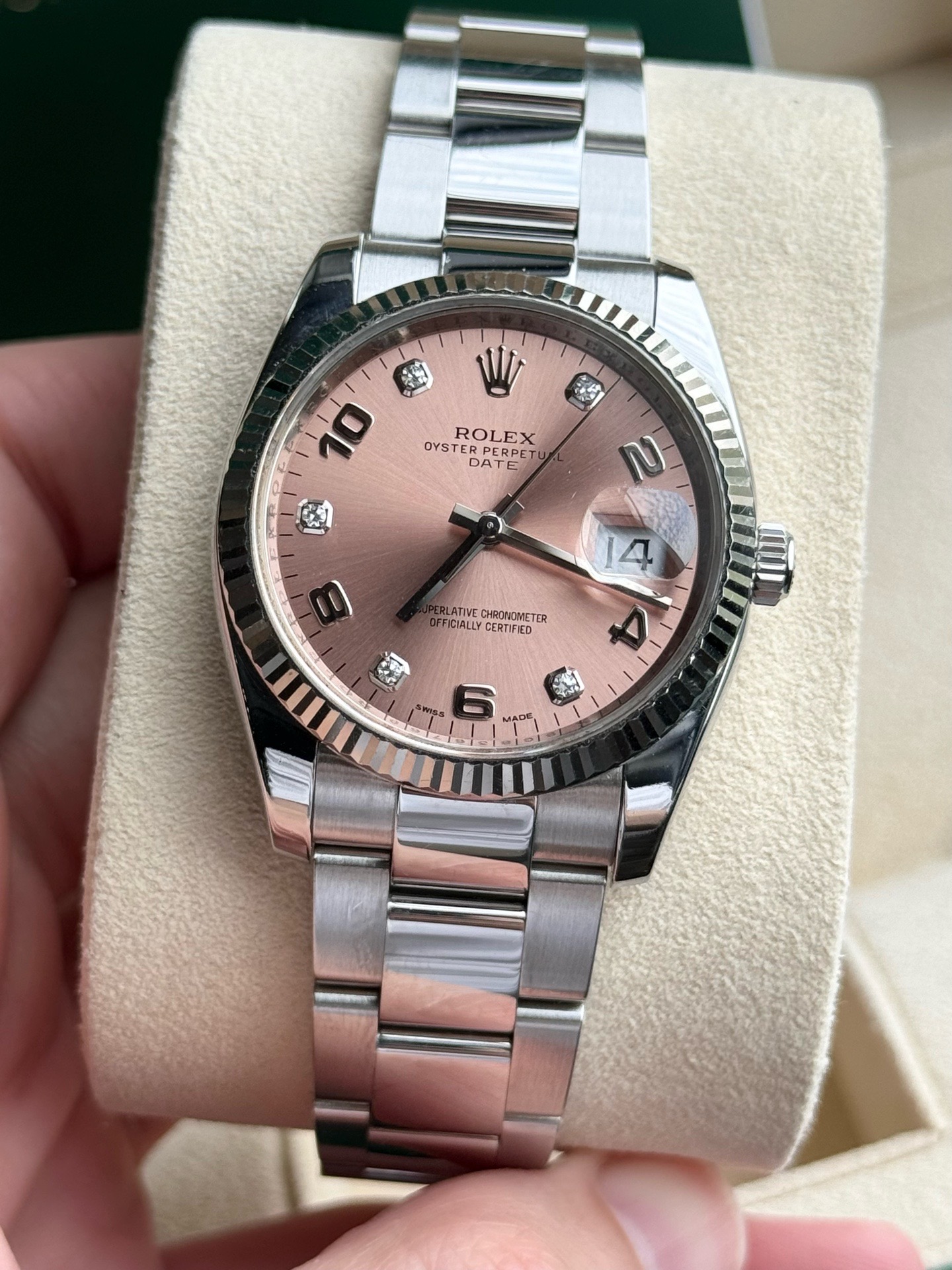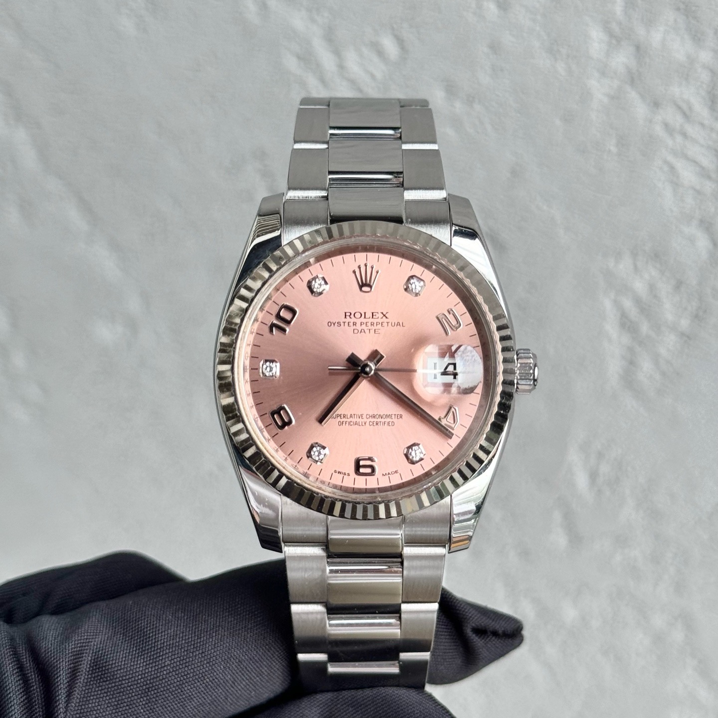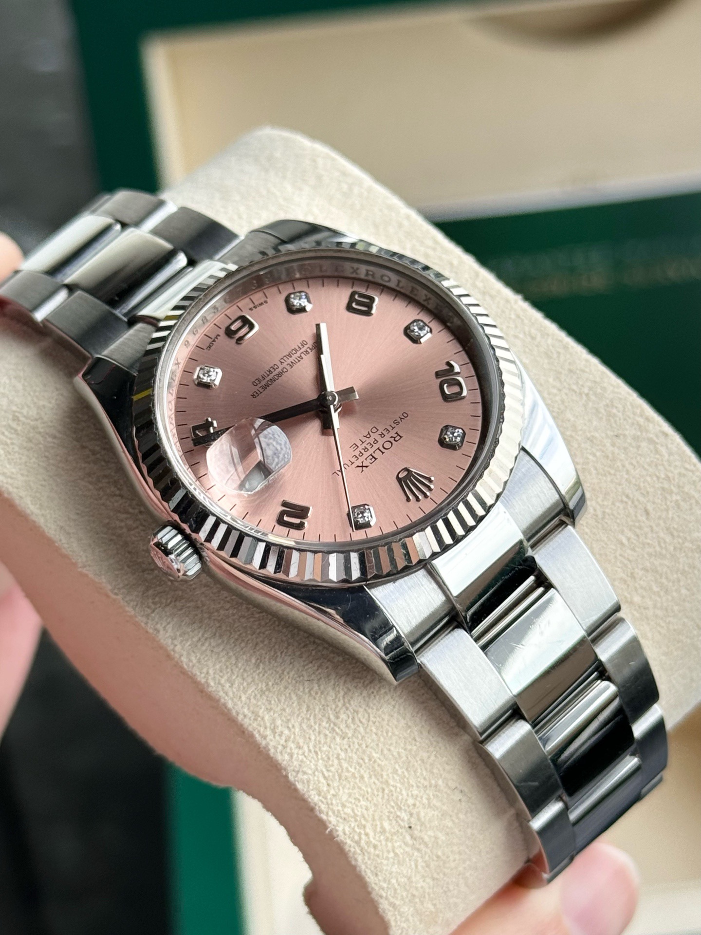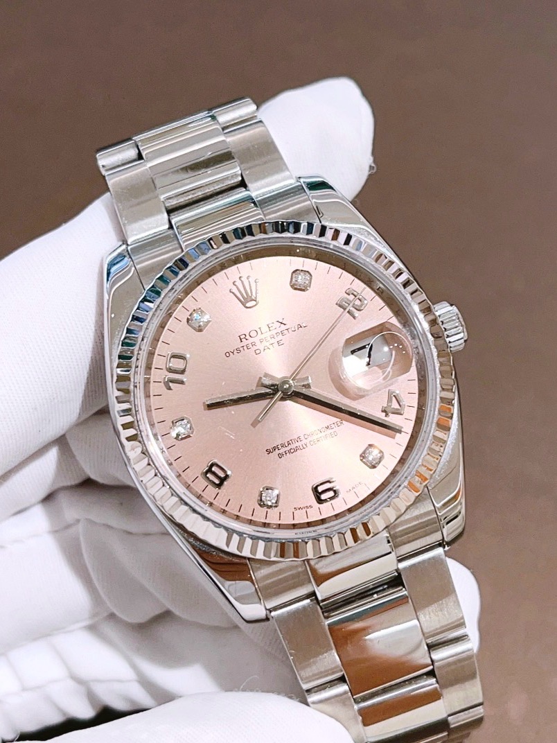 Rolex劳力士蚝式恒动型号115234 日志女士自动机械腕表 表径34mm粉盘间数字钻刻板链