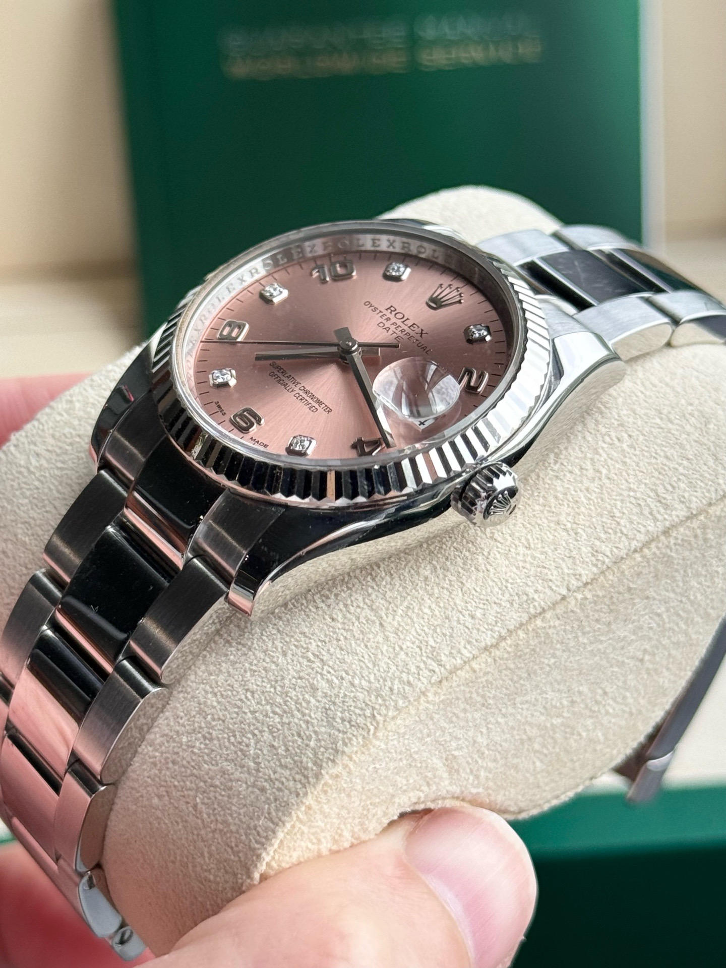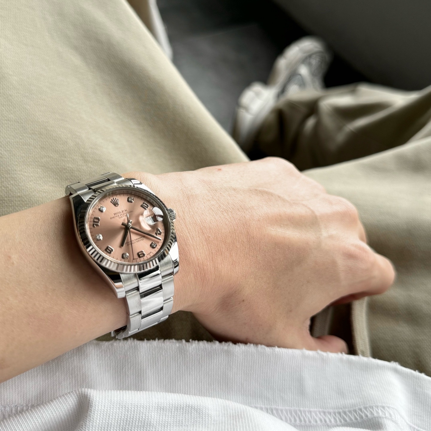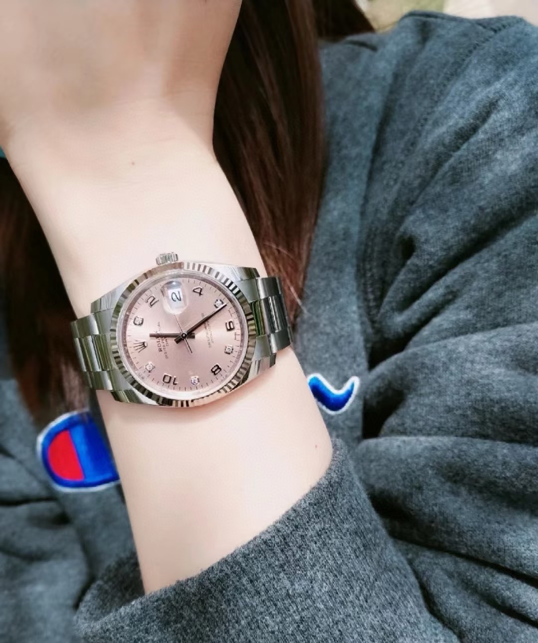 Rolex劳力士蚝式恒动型号115234 日志女士自动机械腕表 表径34mm粉盘间数字钻刻板链
