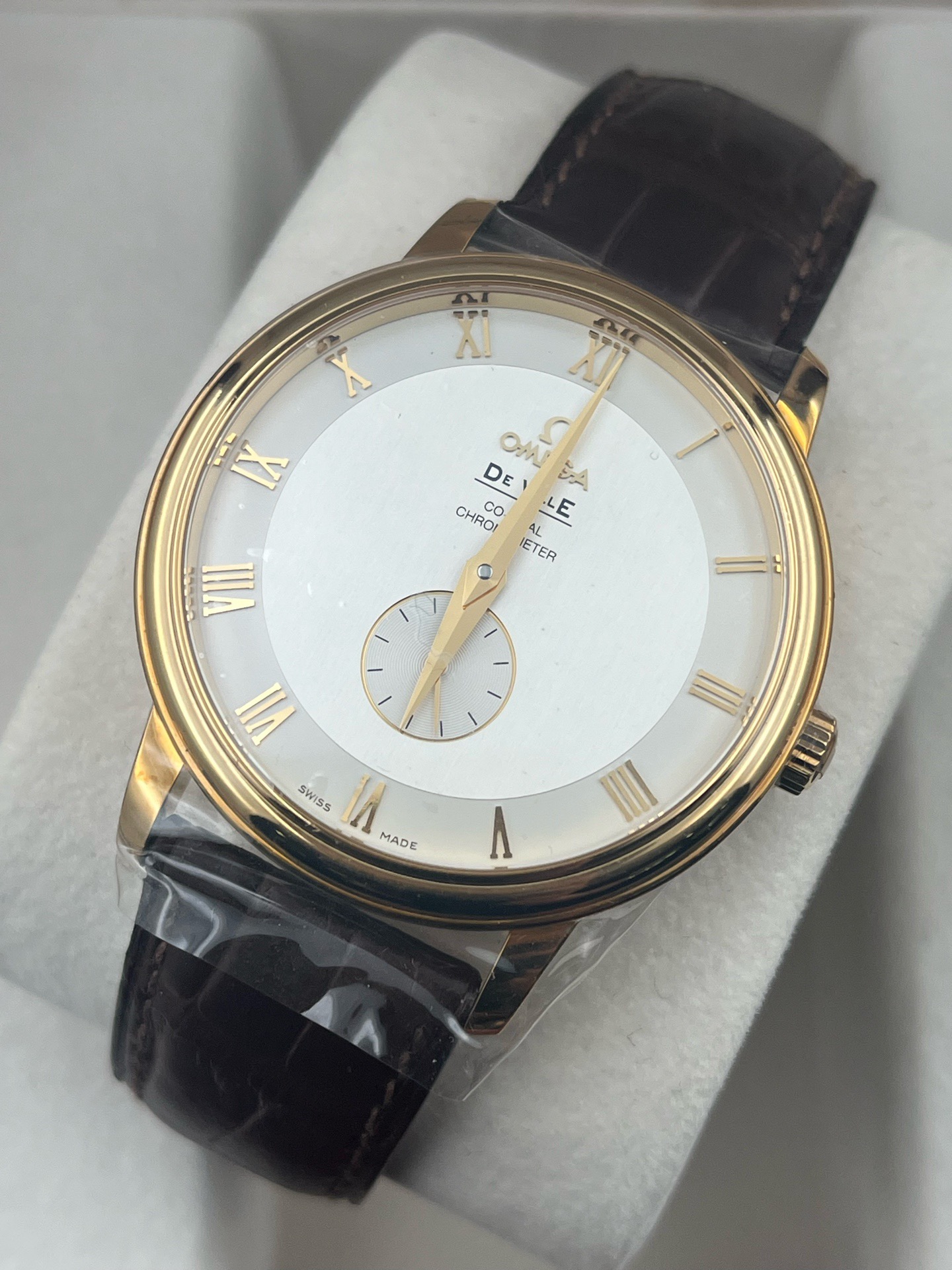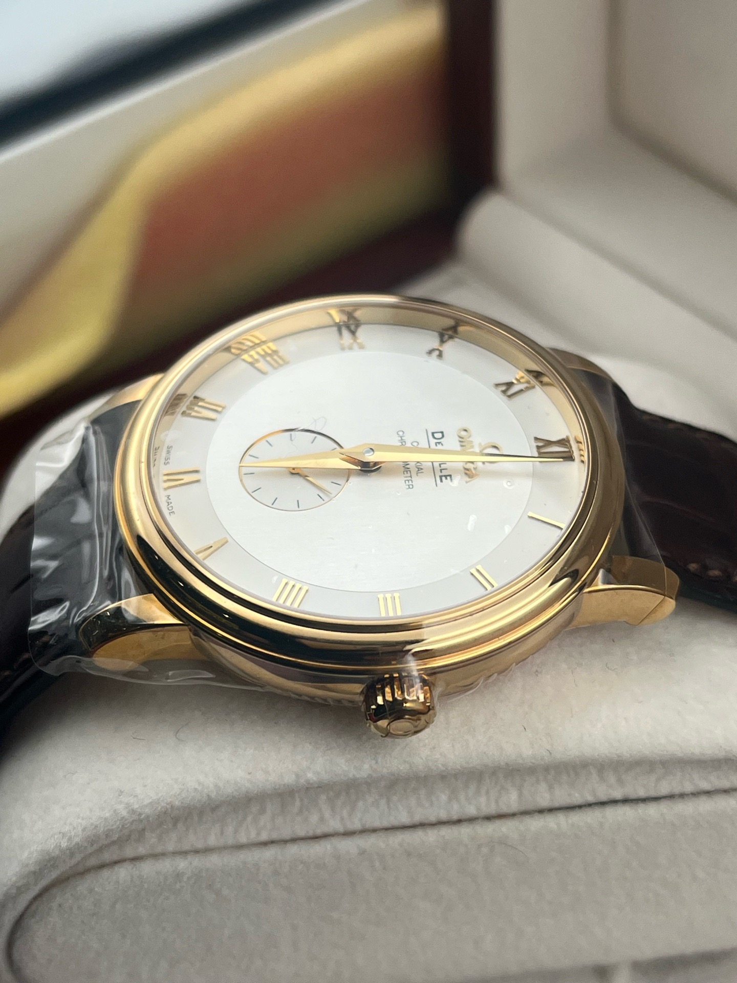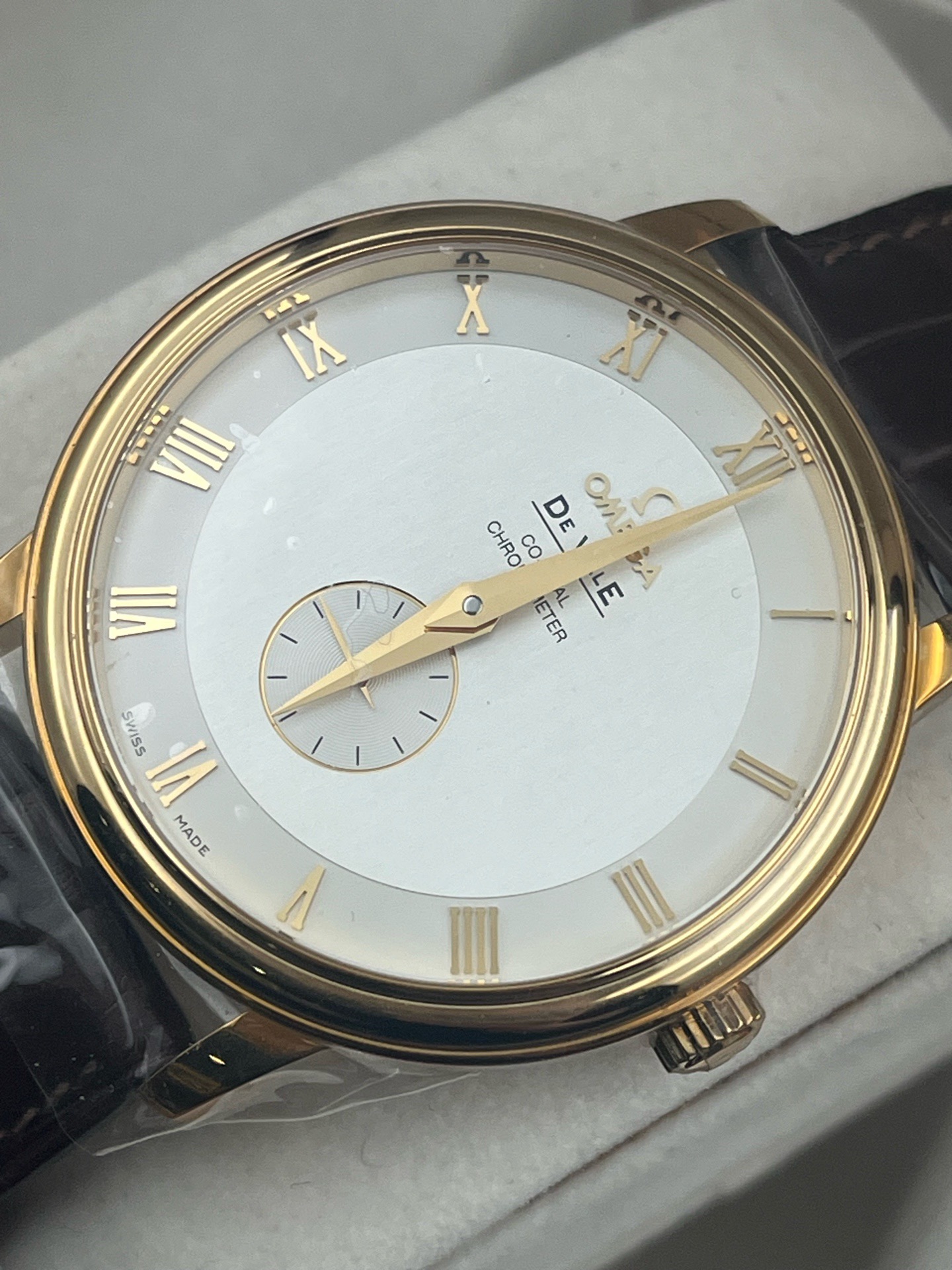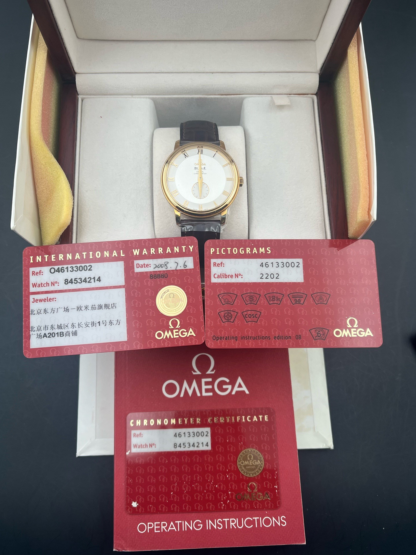 欧米茄碟飞系列4613.30.02、男士自动机械腕表、表径:39mm、材质:18k黄金/皮带、银灰色盘面、罗马数字刻度、独立小秒针、全套附件、整表全新未使用品、原价:65200