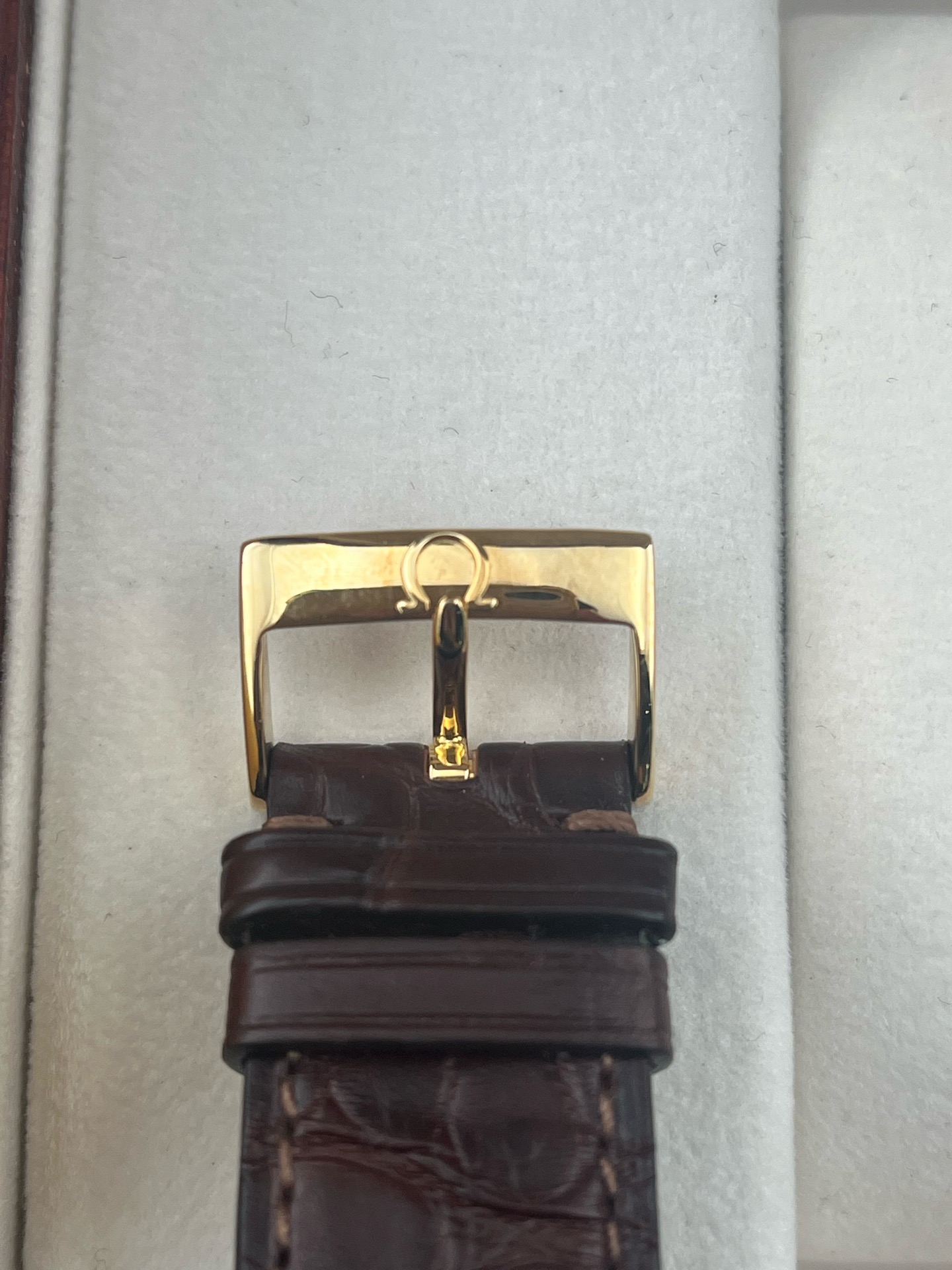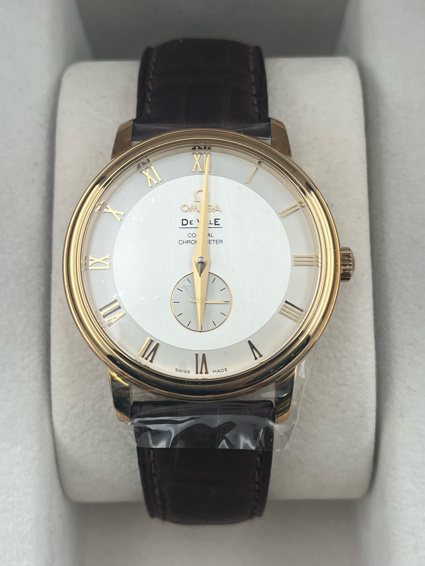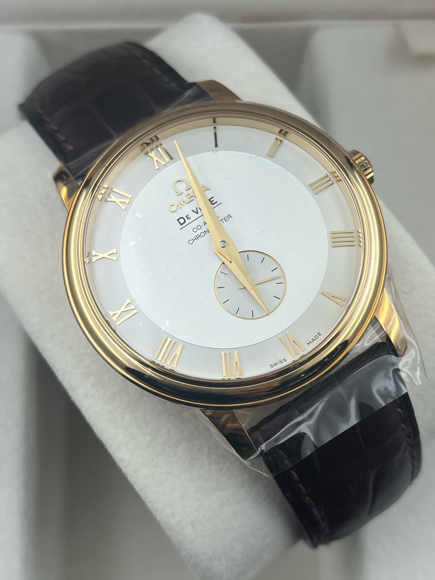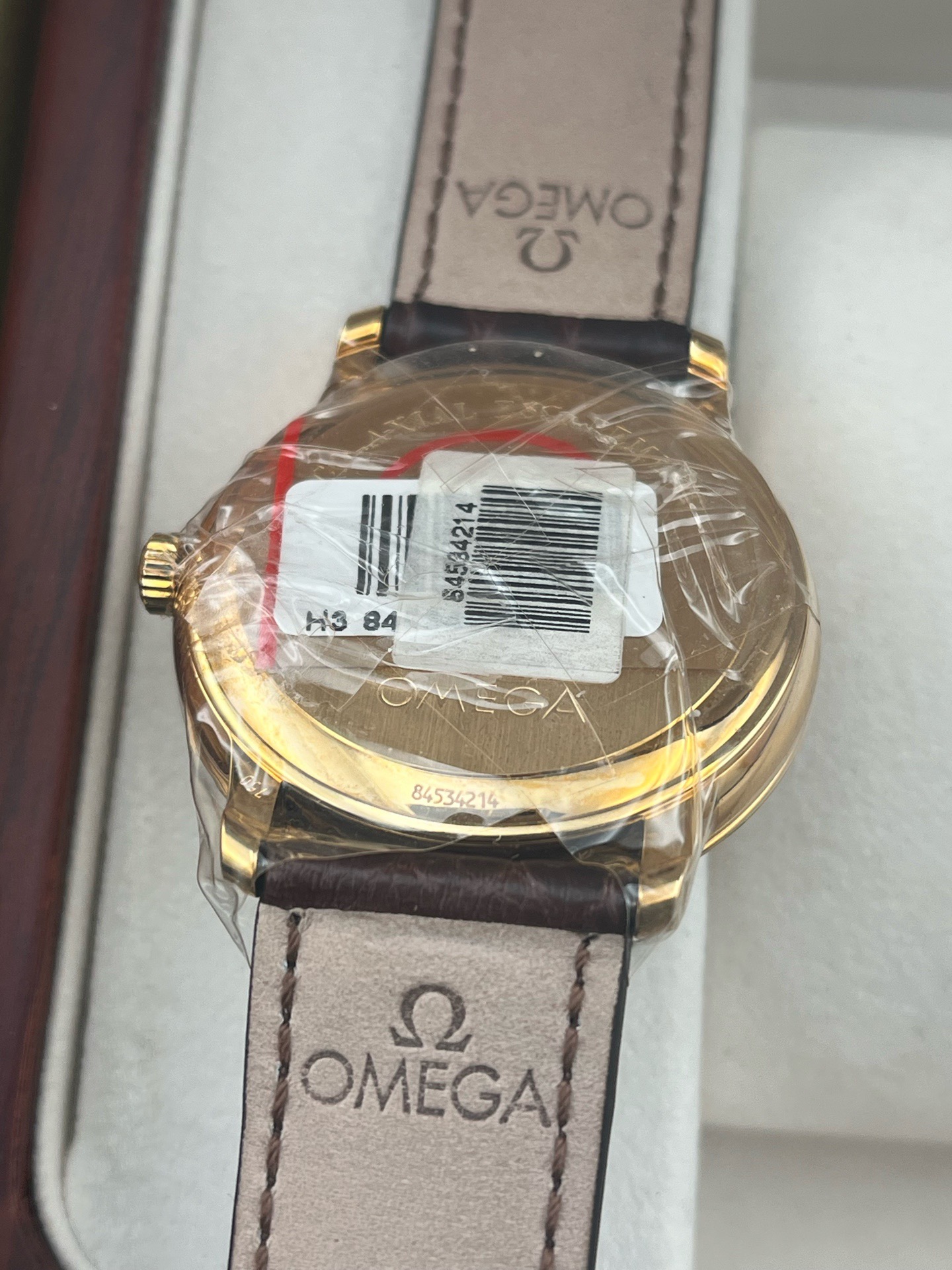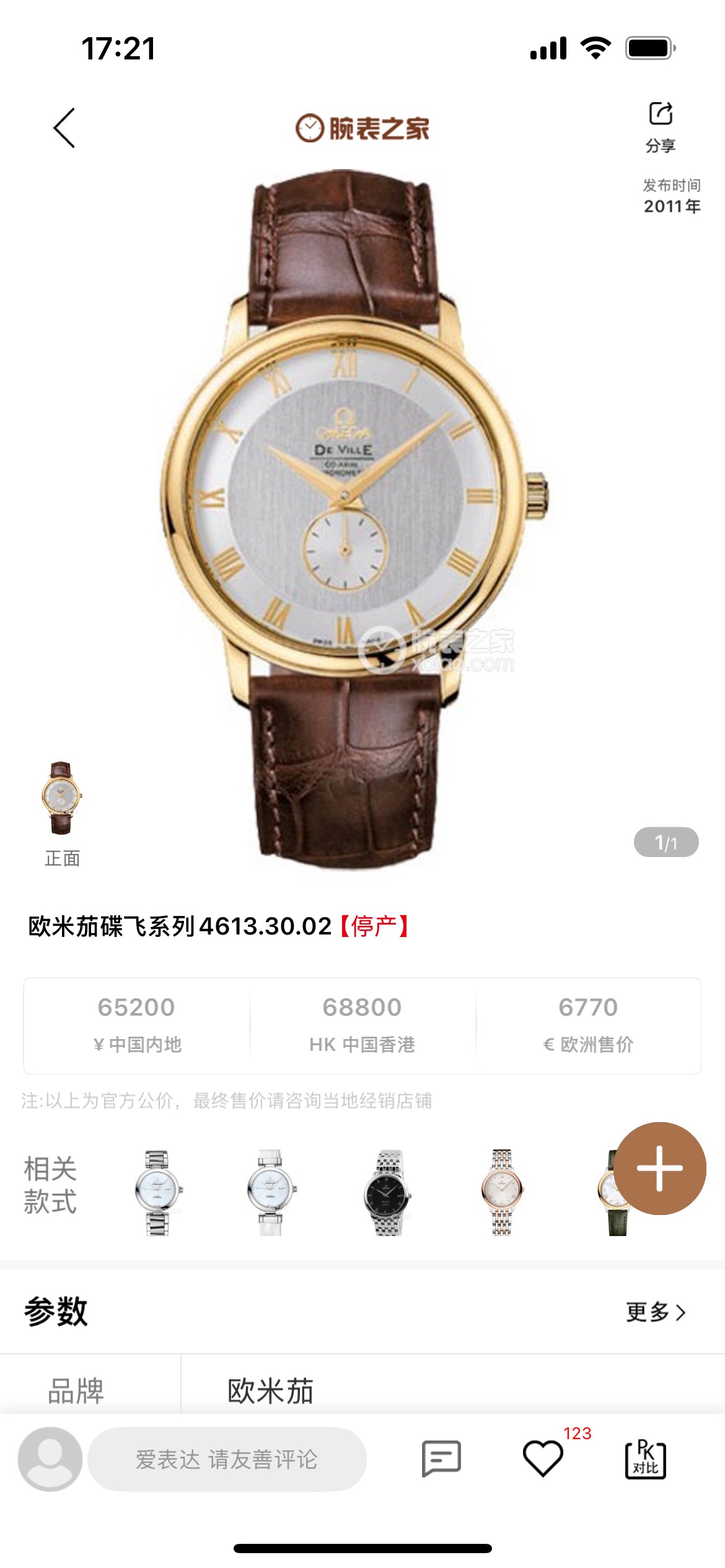 欧米茄碟飞系列4613.30.02、男士自动机械腕表、表径:39mm、材质:18k黄金/皮带、银灰色盘面、罗马数字刻度、独立小秒针、全套附件、整表全新未使用品、原价:65200