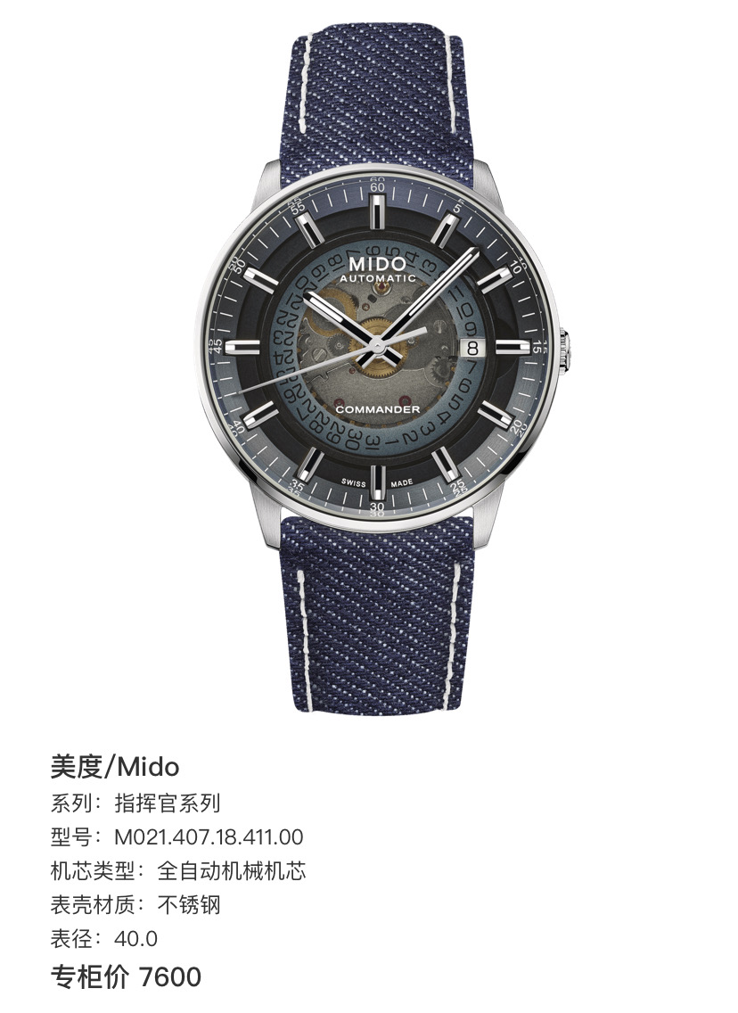 美度/Mido 指挥官系列 M021.407.18.411.00 全自动机械机芯 不锈钢 40.0 专柜价7600