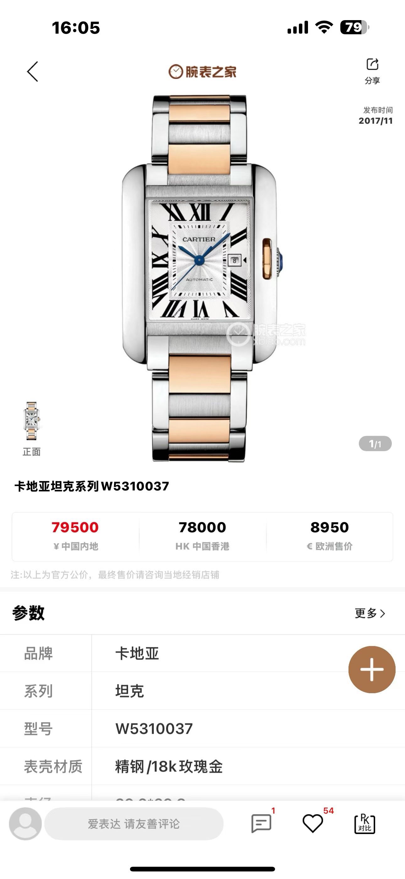 Cartier 卡地亚 坦克系列间金中性表,型号:W5310037,自动机械机芯,表径39.2x29.8,公价79500,。