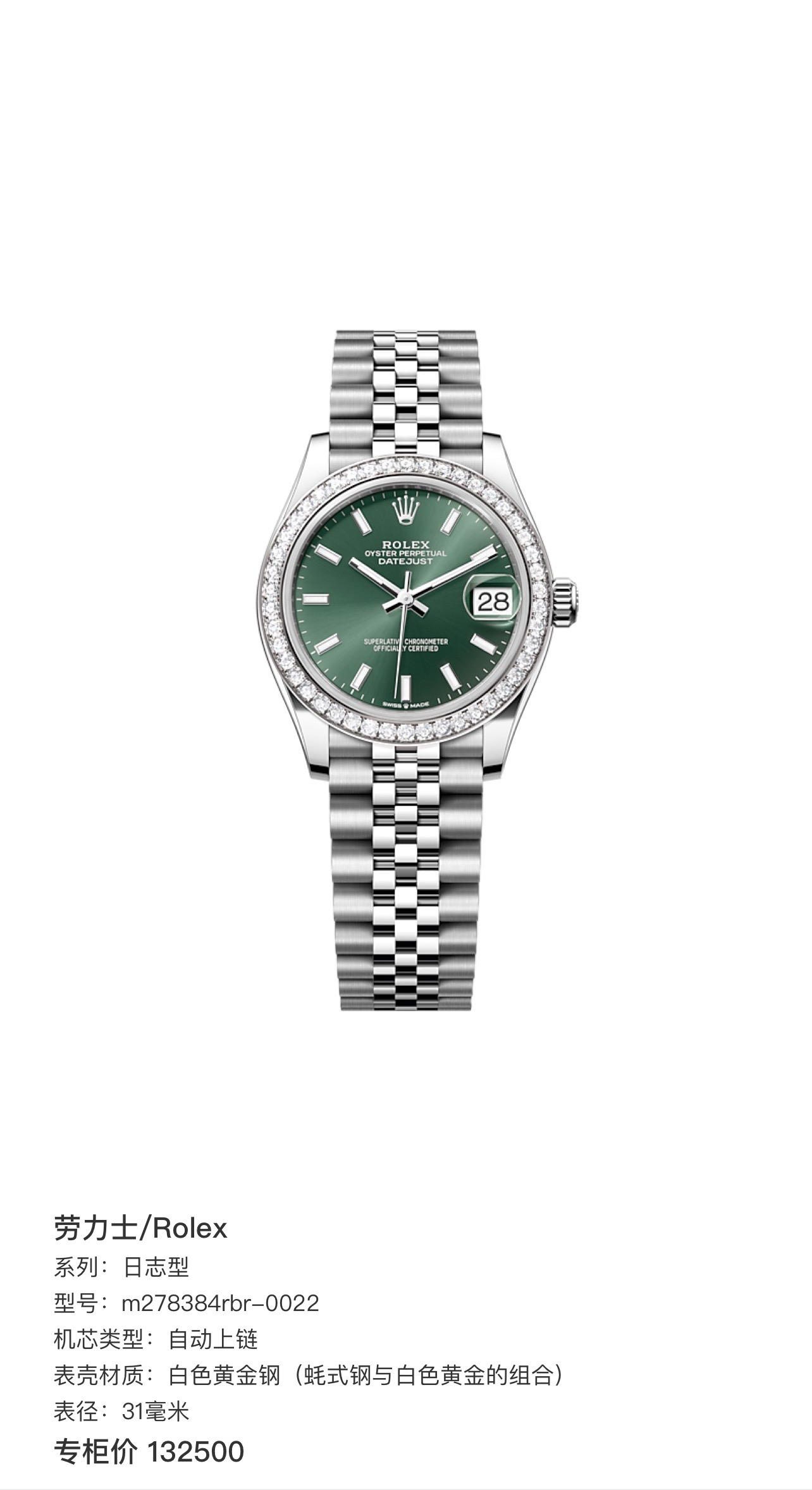 劳力士/Rolex 日志型 m278384rbr-0022 自动上链 白色黄金钢(蚝式钢与白色黄金的组合) 31毫米 专柜价132500、