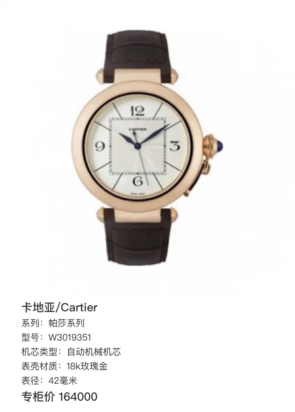 卡地亚/Cartier 帕莎系列 W3019351 自动机械机芯 18k玫瑰金 42mm表径专柜价164000