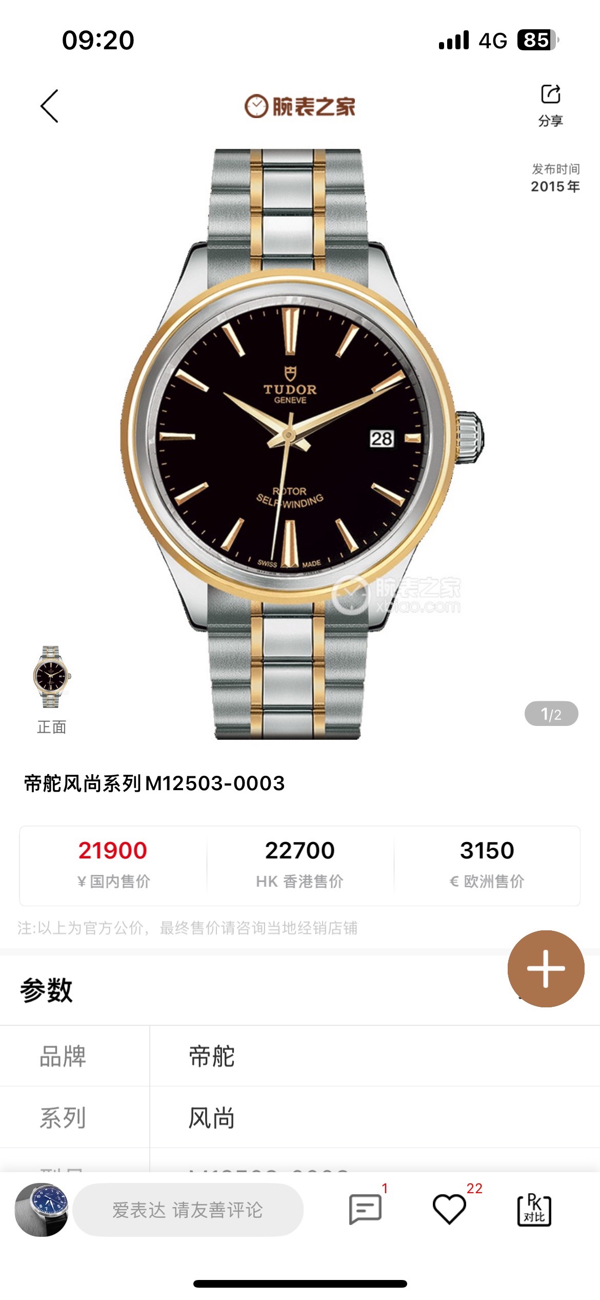 帝舵风尚12503-0003,间金黑盘,国行全新全套