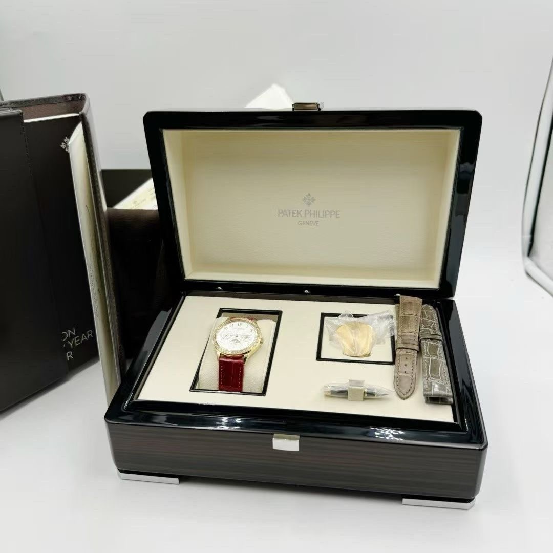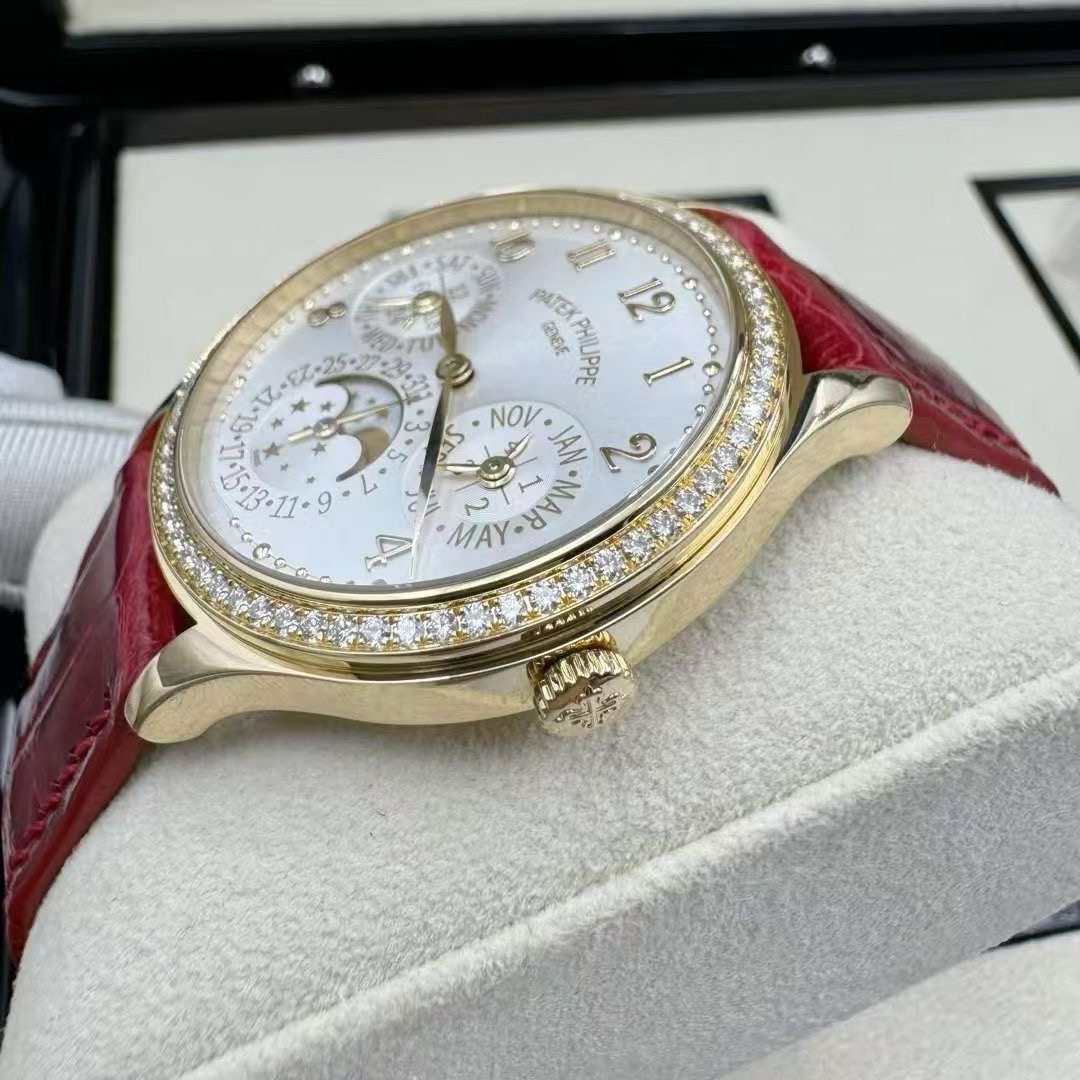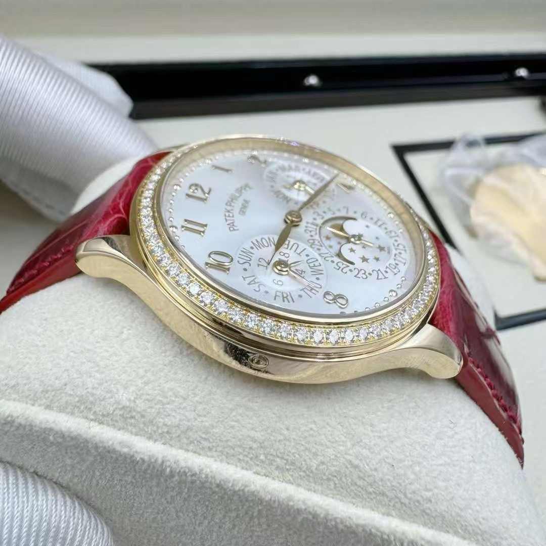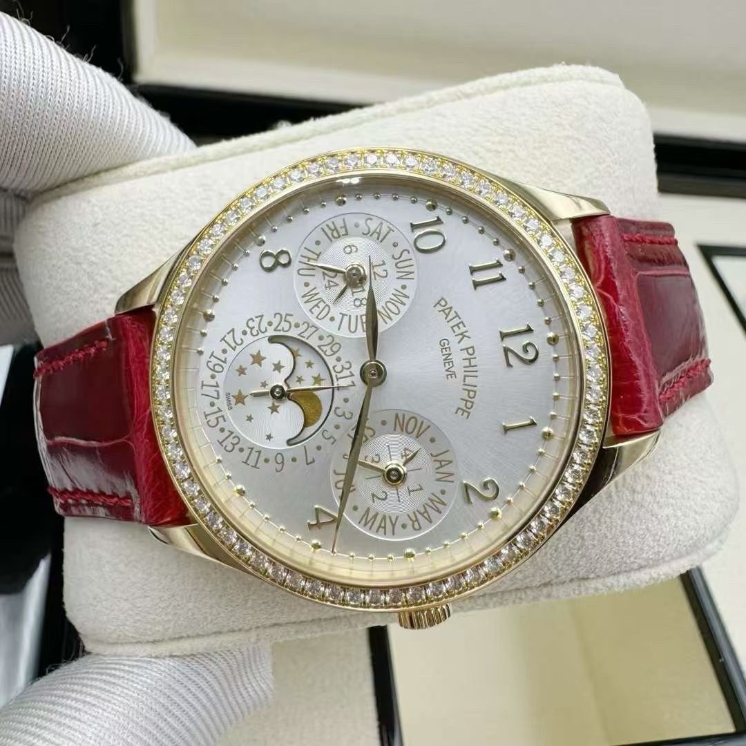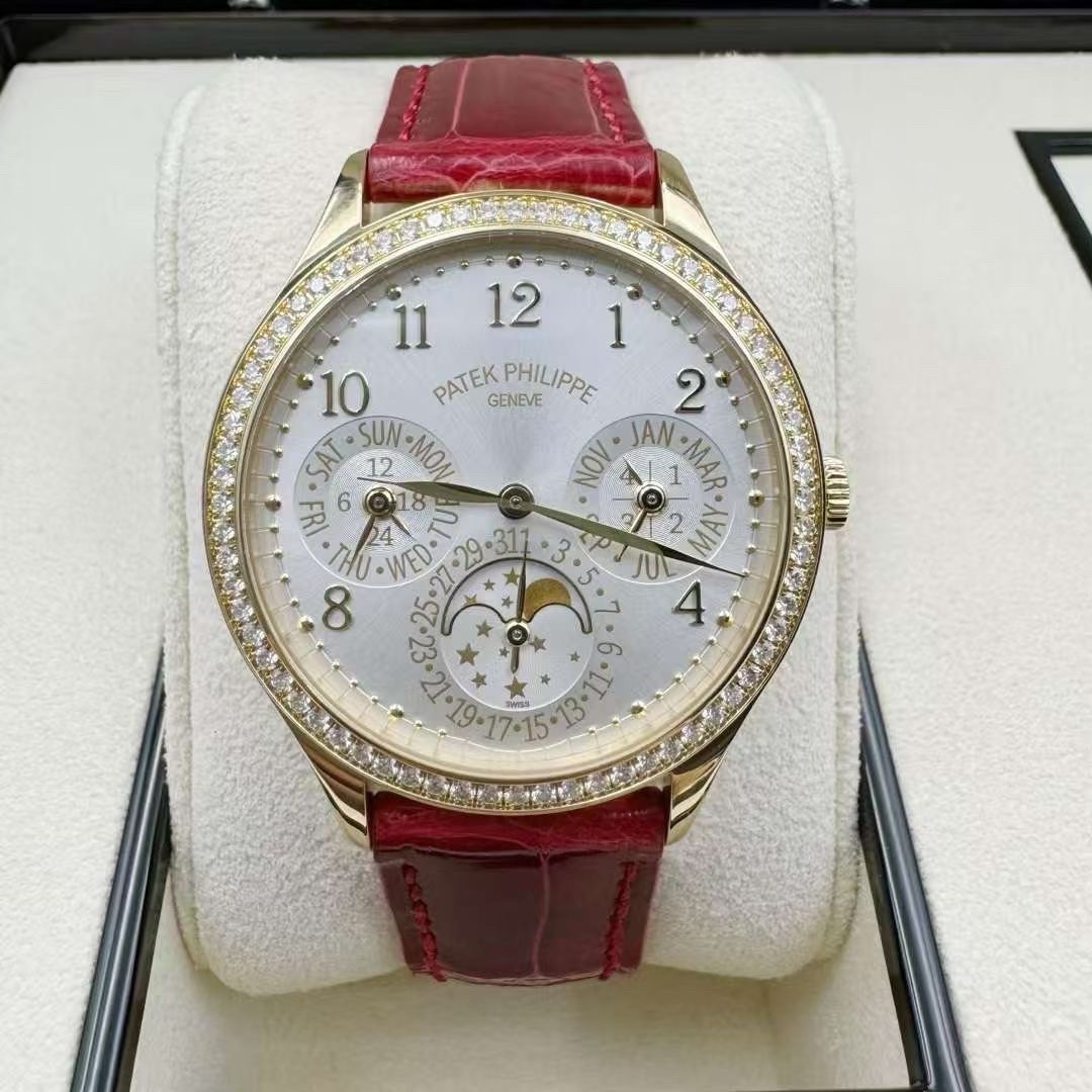 百达翡丽pp7140R-001新款万年历 专柜在售款 18k玫瑰金 全自动机械 背透机芯 35.1表经 日历 星期 月份 年历 月相 万年历 外圈原钻 表扣钻石 专柜100万附件 极品全套