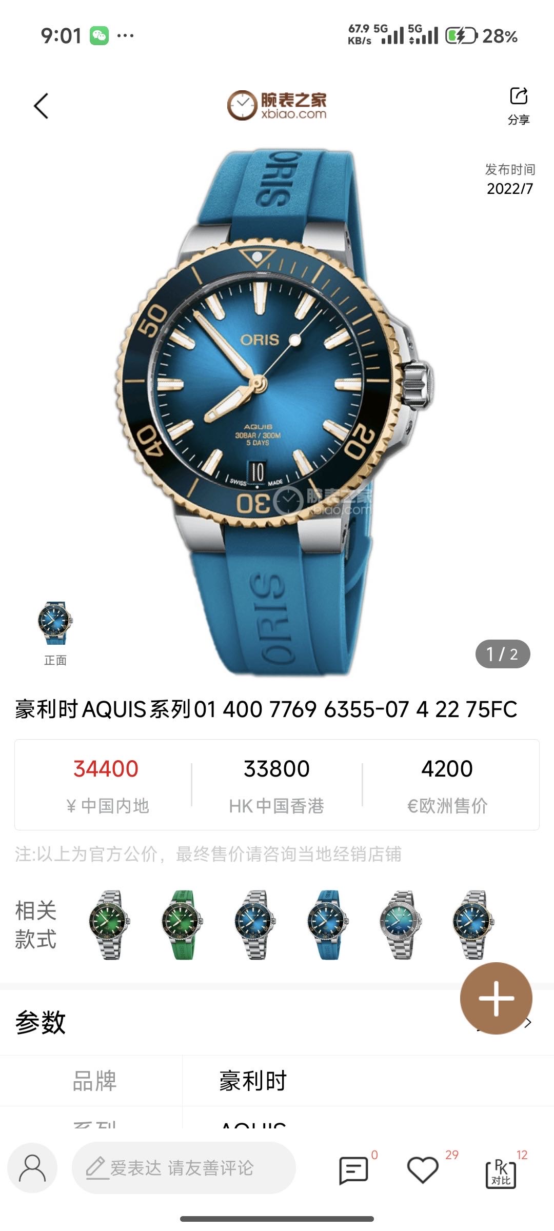 豪利时/Oris 01-400-7769-6355-07-4-22-75FC 自动上链 多片式不锈钢,分钟刻度陶瓷顶圈 41.50 MM 专柜价31500元 国行全新未使用品25年12月卡