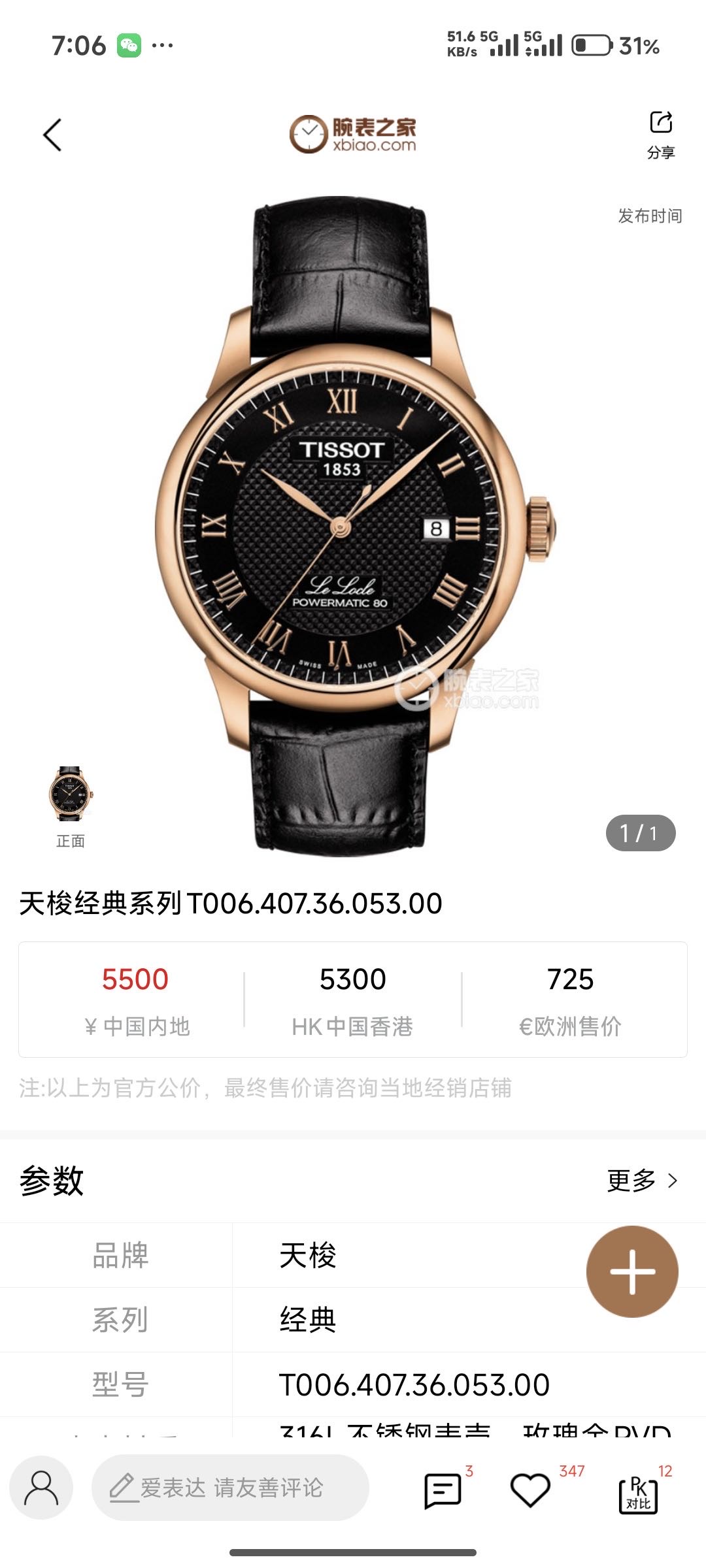 天梭/Tissot 经典 T006.407.36.053.00 自动机械 316L不锈钢表壳,玫瑰金PVD涂层 39.3毫米 专柜价5500元 国行全新未使用25年12月卡