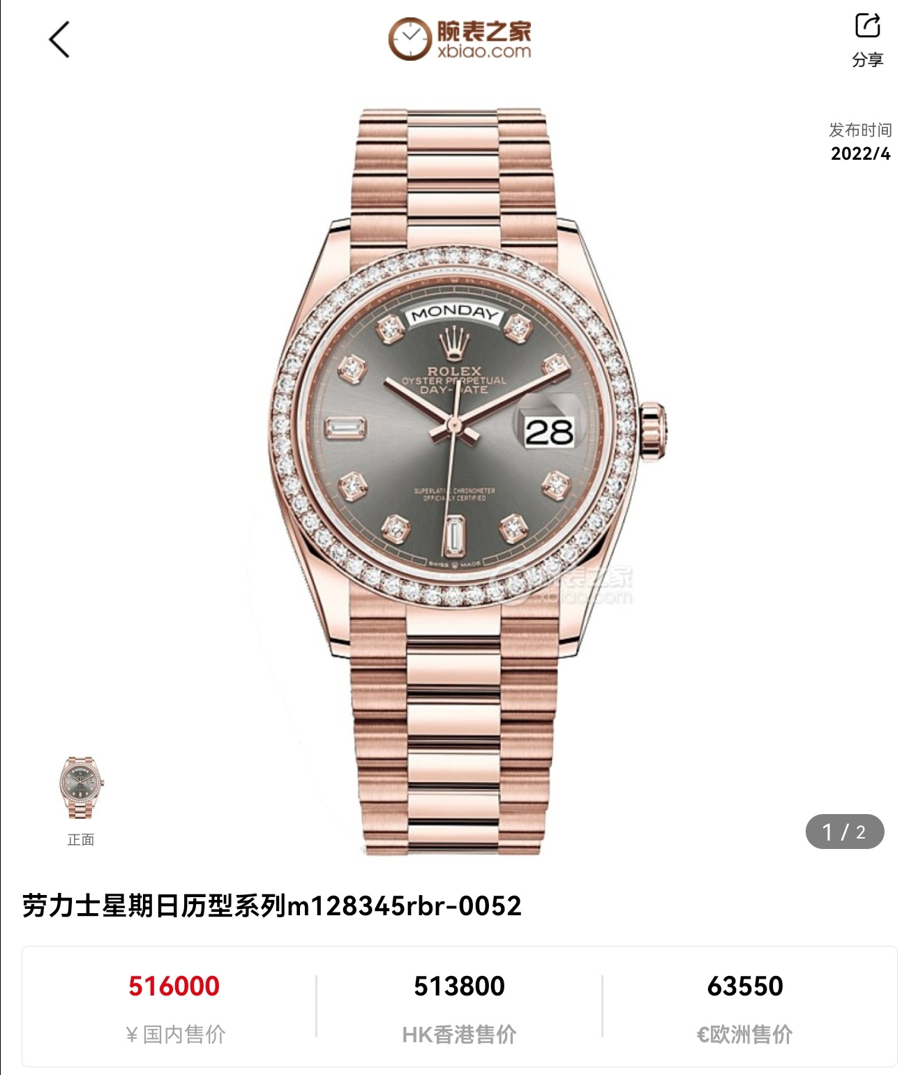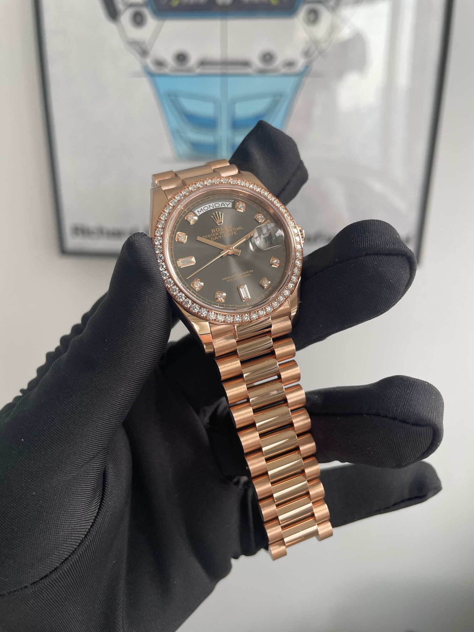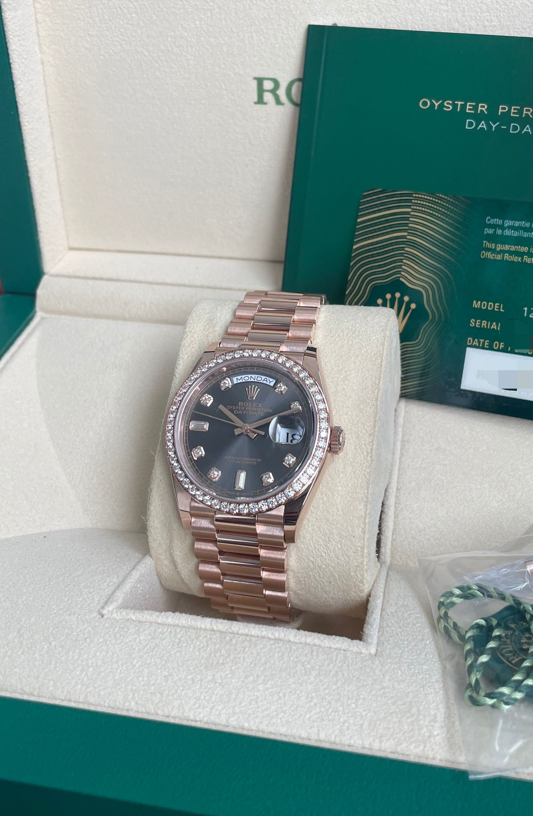 【6月卡灰钻DD】劳力士128345-0052星期日历型,圈钻灰钻DD,18k玫瑰金材质,外圈钻+方钻刻度,36mm表径,2025年6月卡全套,未使用品,公价516000,现好价