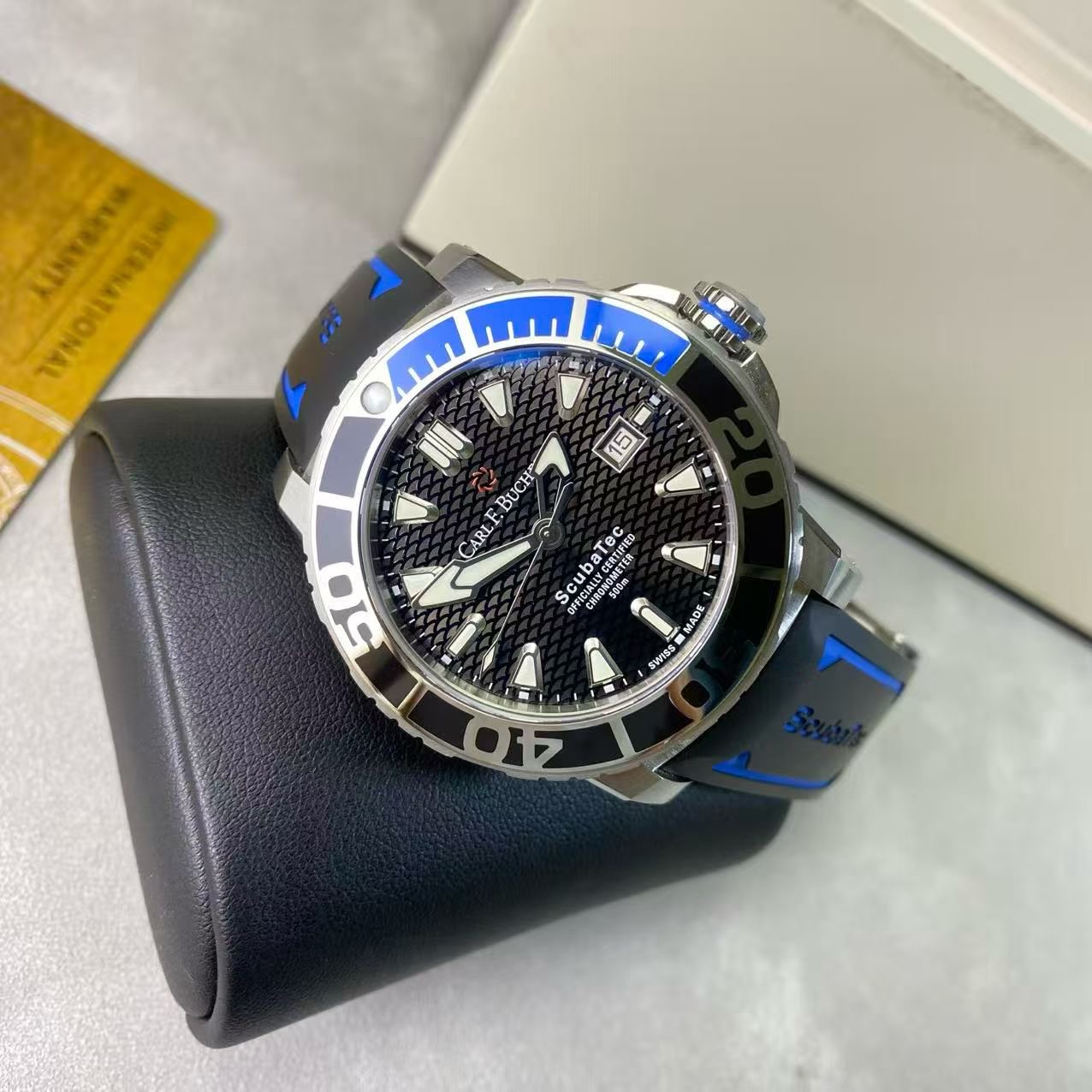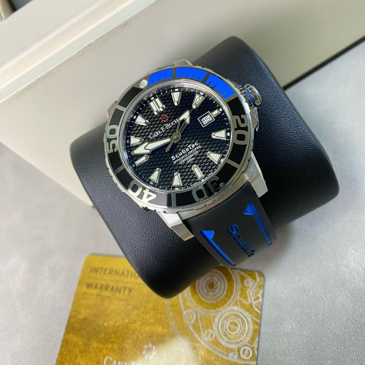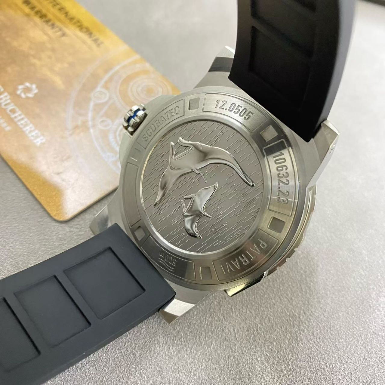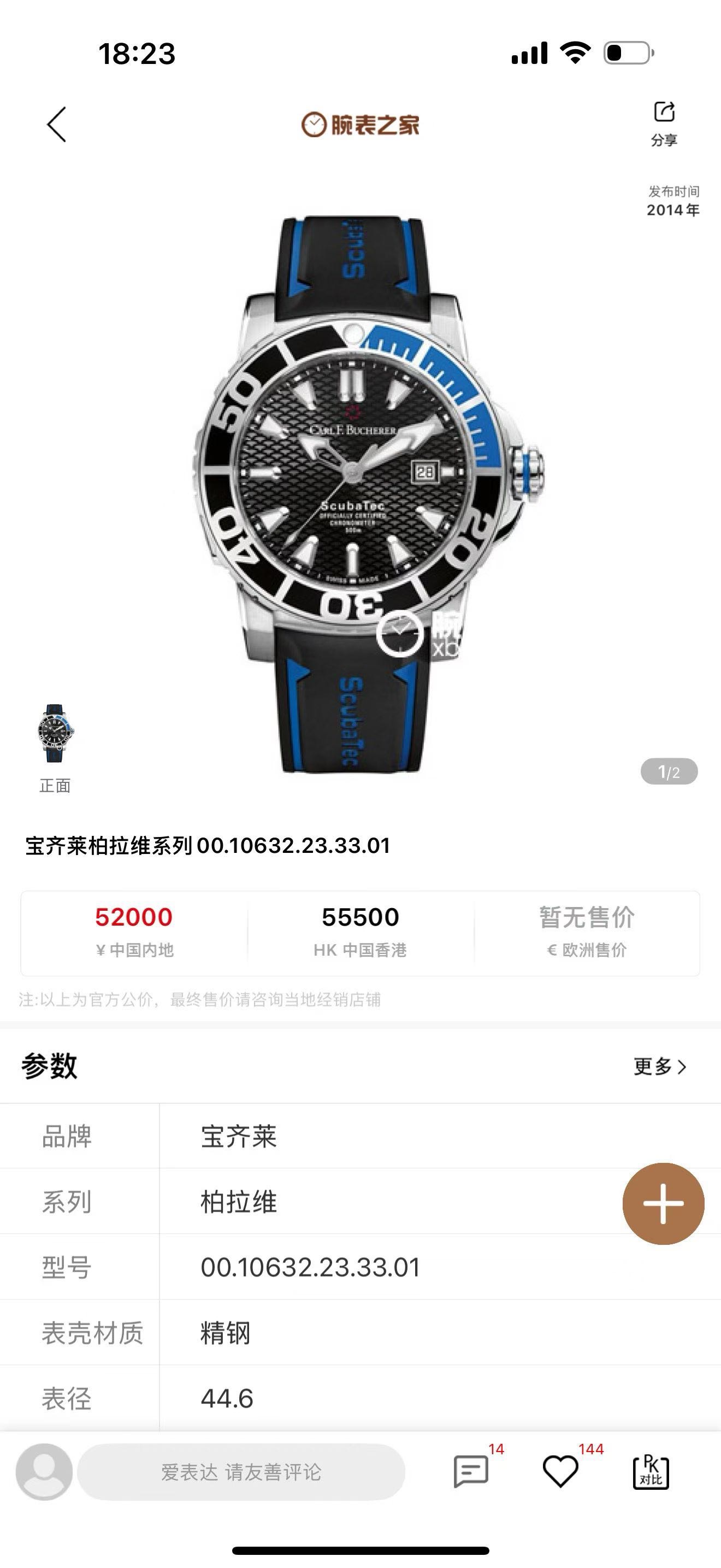 公价5.2万,表径44.6mm,全套附件齐全(2025年11月购买),单向旋转双色精钢表圈,水波纹表盘,夜光指针刻度,500m防水深度,天文台认证机芯。