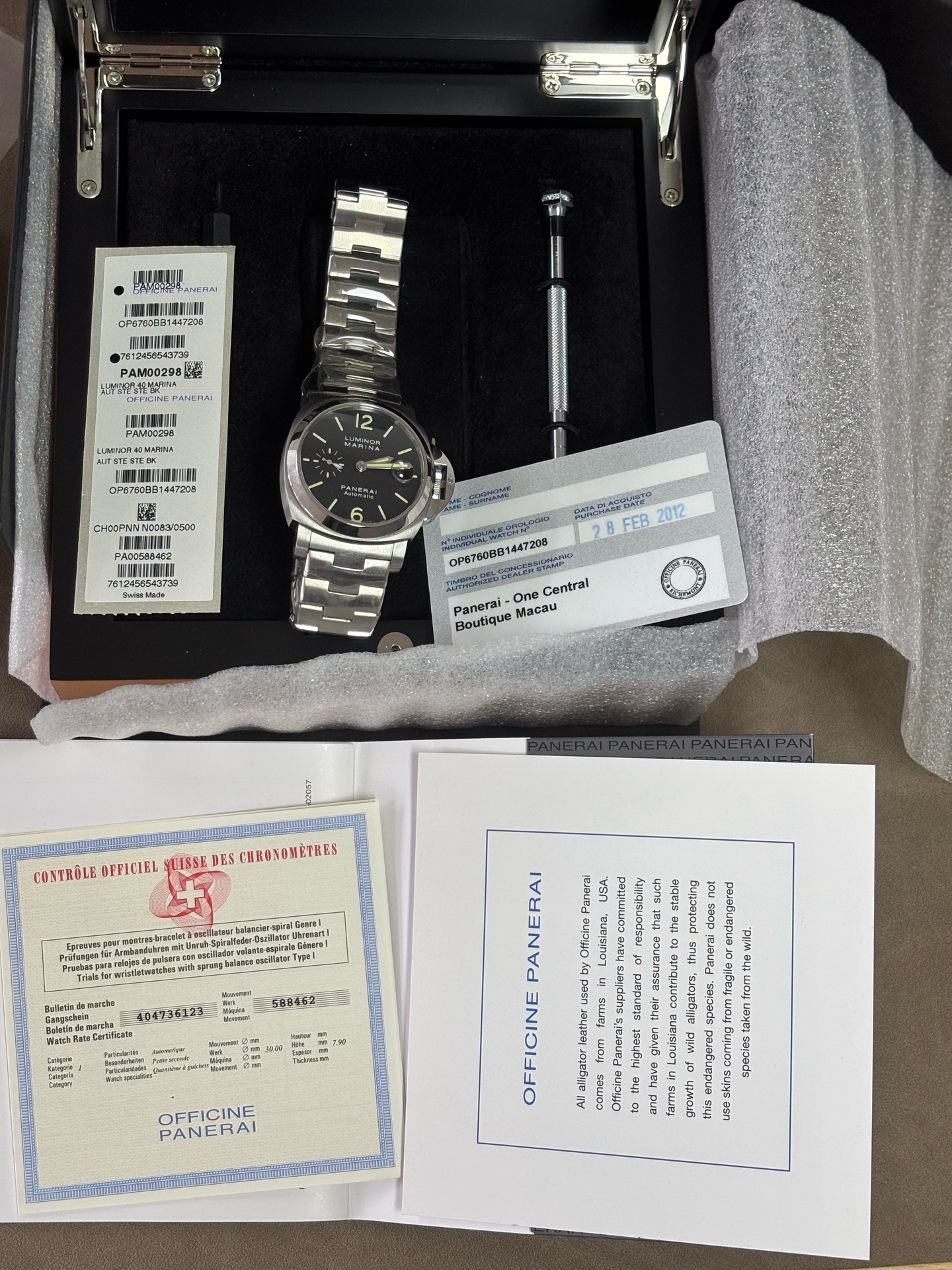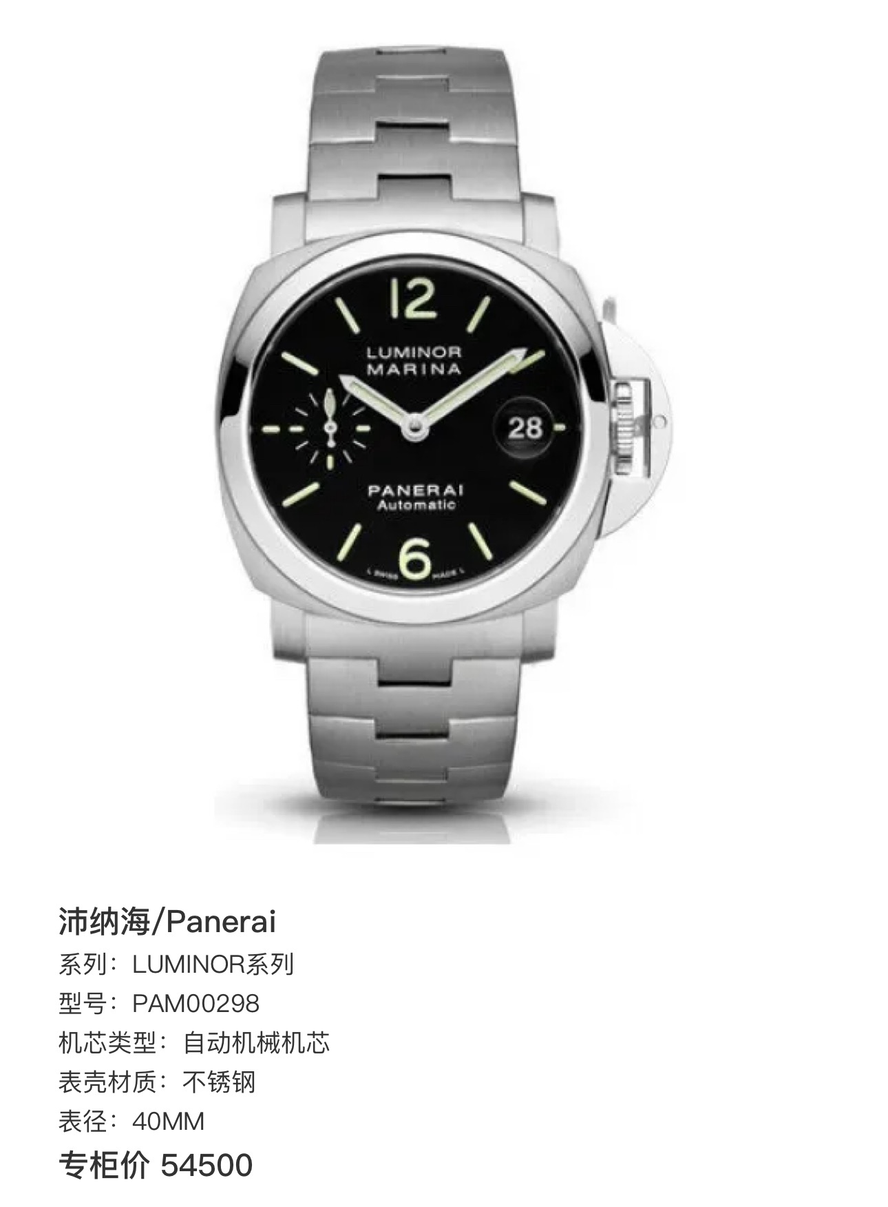 未使用原装钢带款沛纳海00298Pam298。全套未使用,原装钢带全新未使用,40mm的沛里经典元素非常齐全的一款,鱼雷小秒针, 非常少有且经典的一款