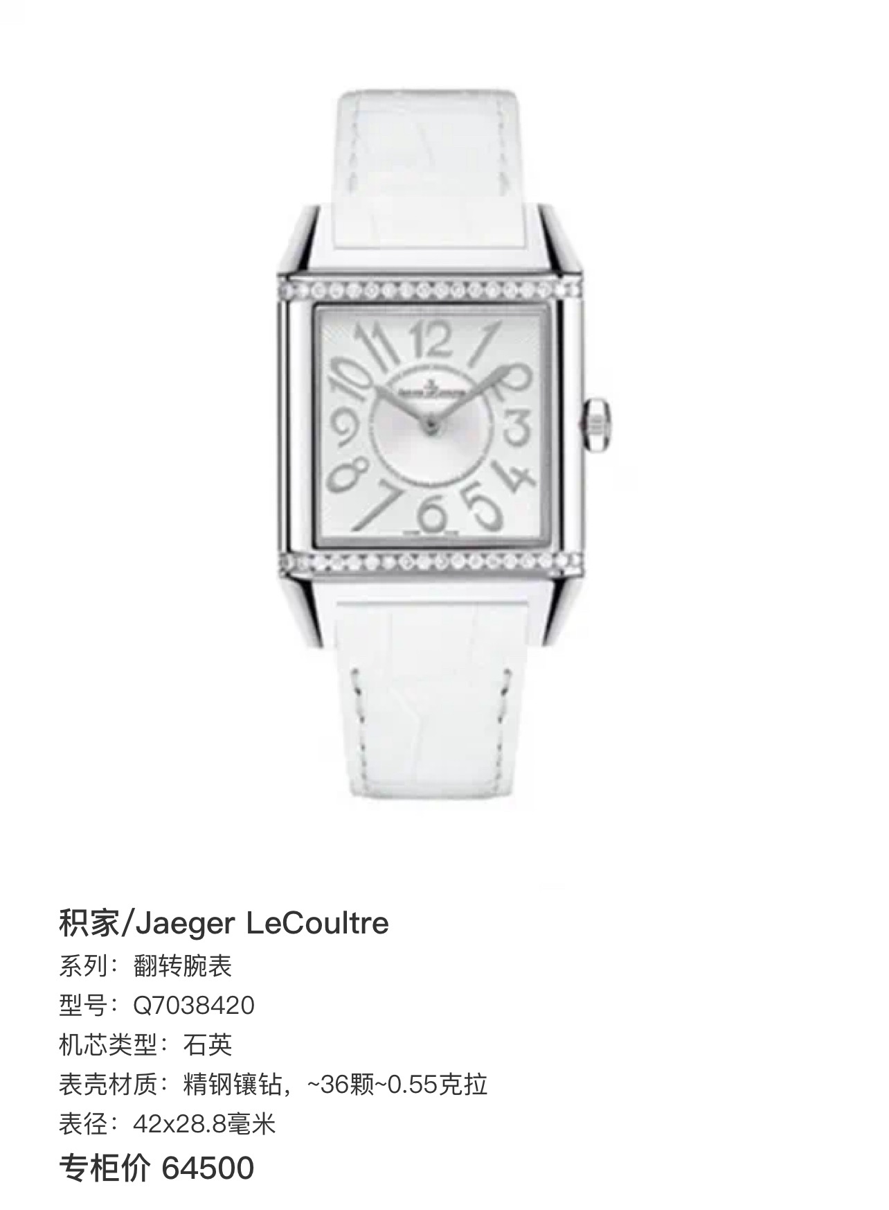 积家/Jaeger LeCoultre 女装翻转腕表 Q7038420 石英 精钢镶钻,~36颗~0.55克拉 42x28.8毫米,单表无附件 专柜价64500