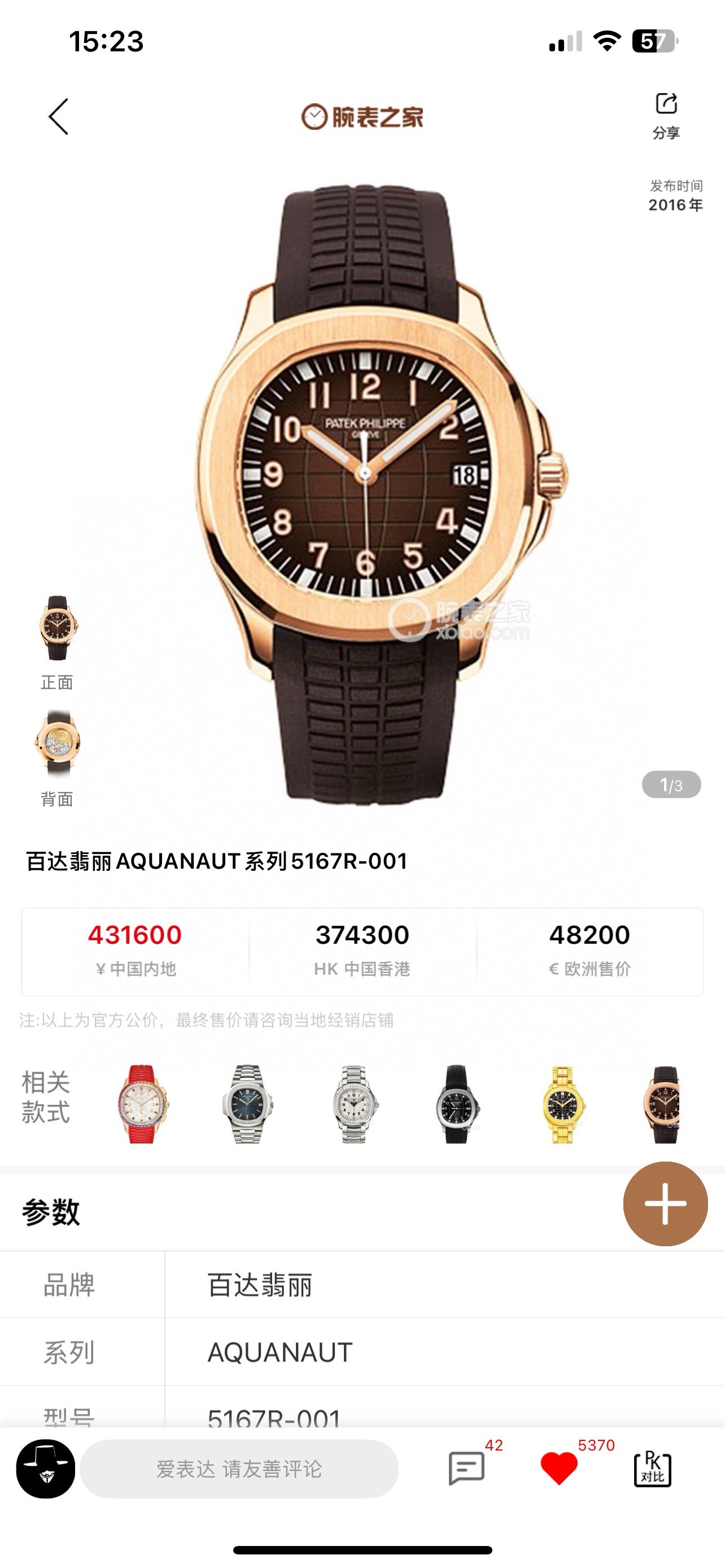 百达翡丽Aquanaut 手雷 5167R-001机械男性