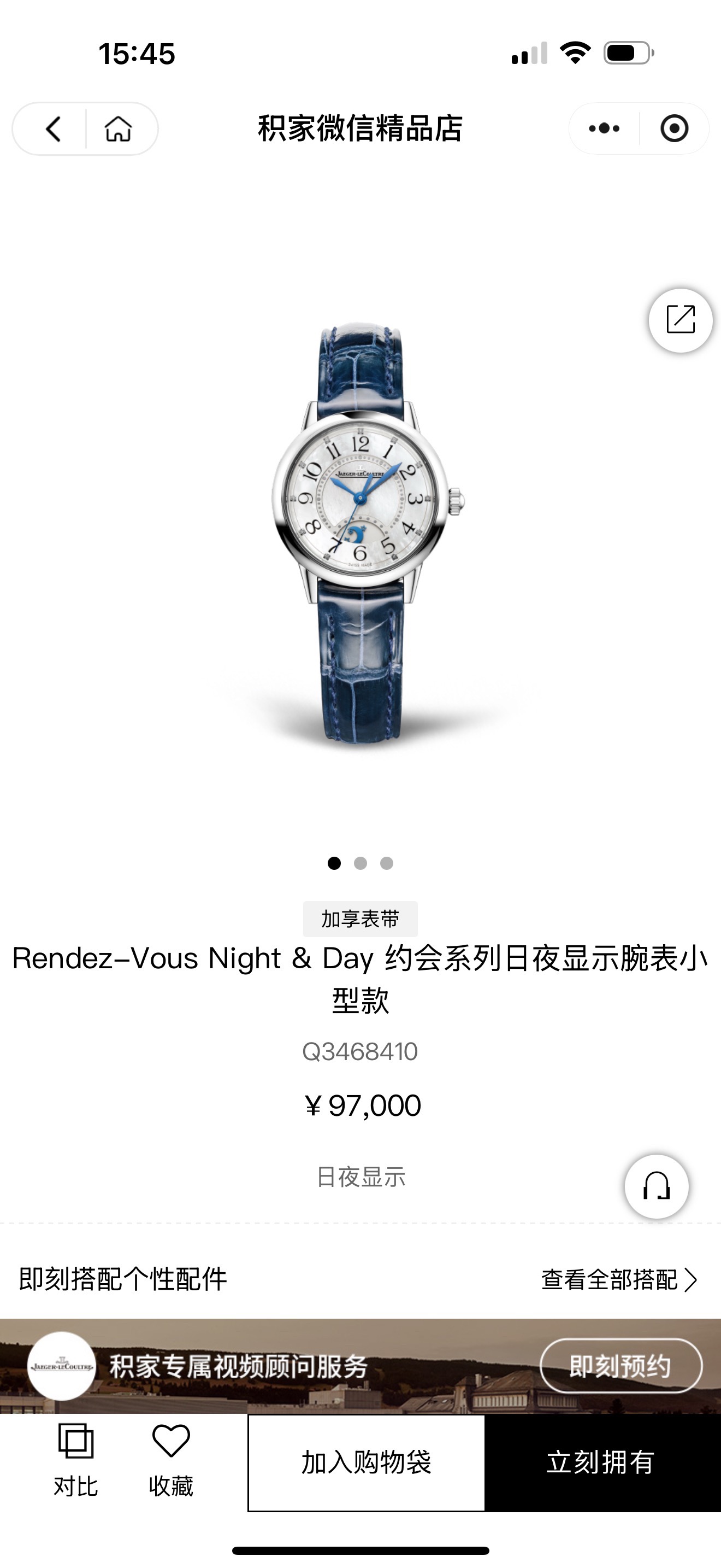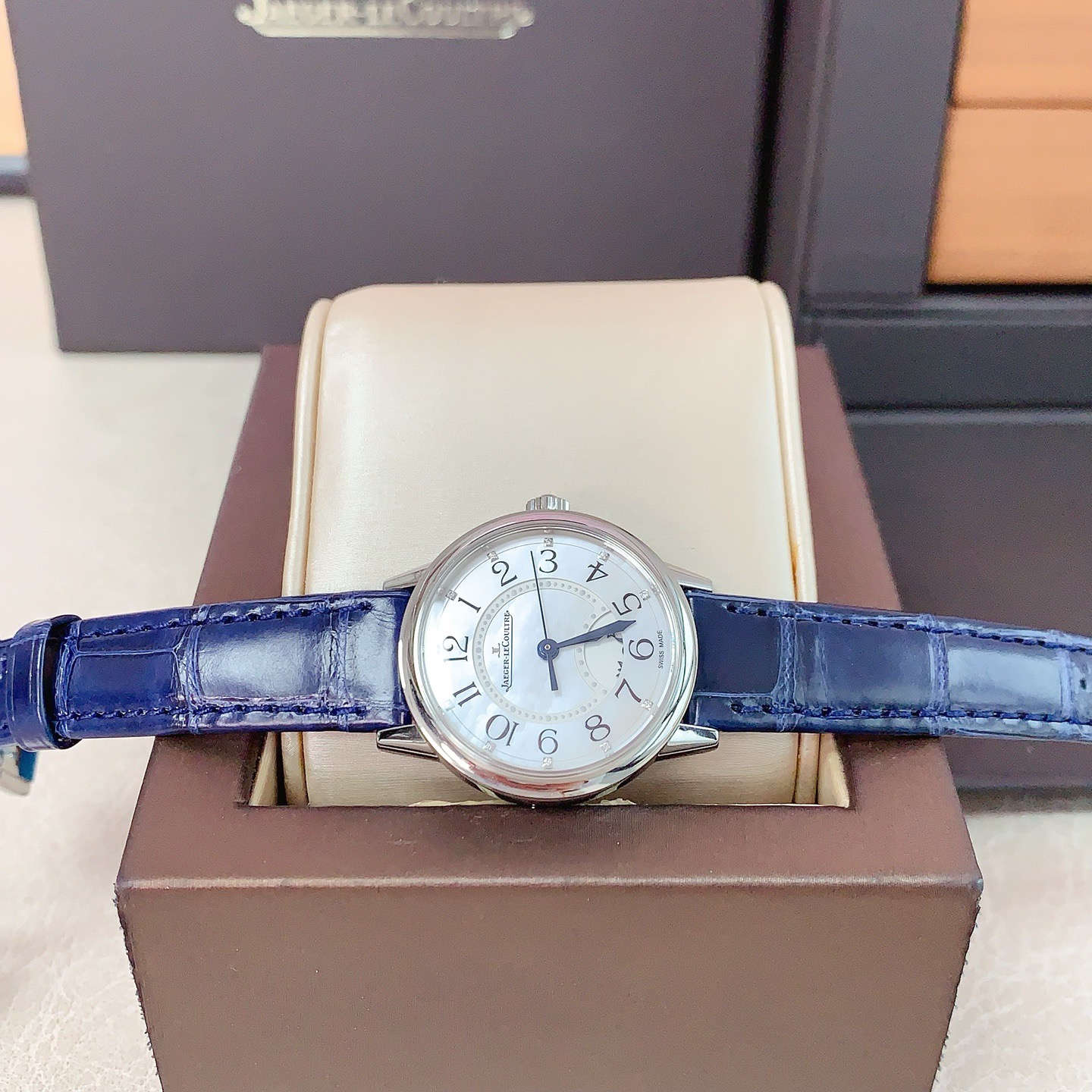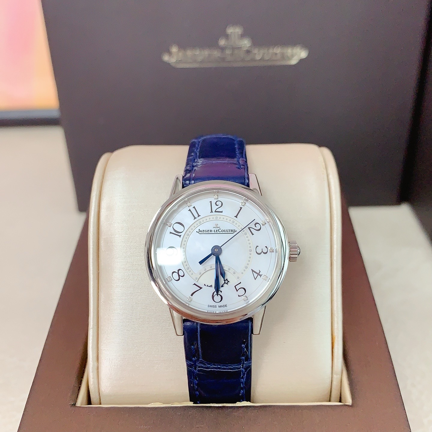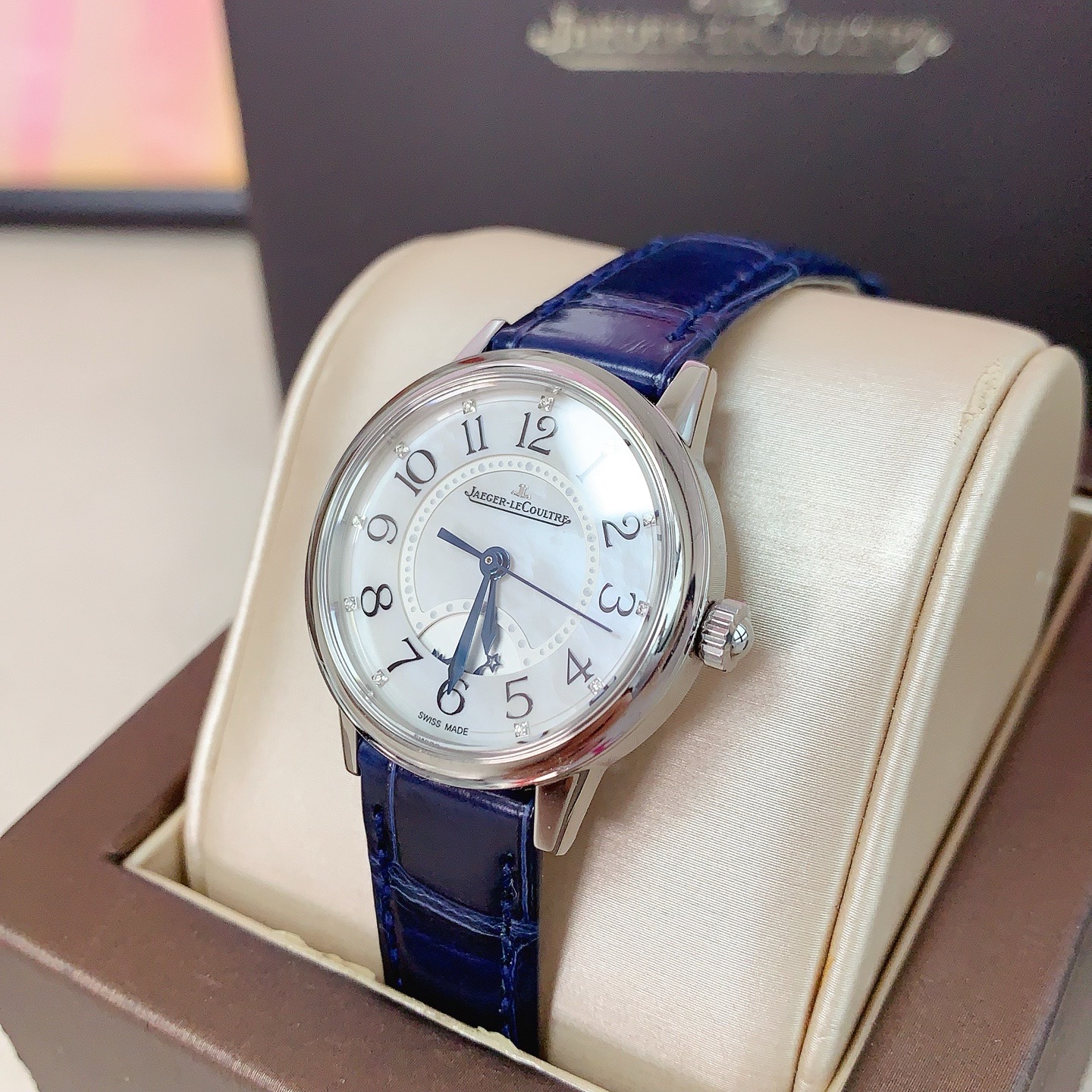闲置品全套积家3468410,自动机械机芯:967A,表径:29mm,表壳厚度:8.73mm,昼夜显示,动力储存:42小时。表盘:白色,珍珠母贝,蓝宝石水晶玻璃表镜,折叠表扣 柜柜价97000元。
