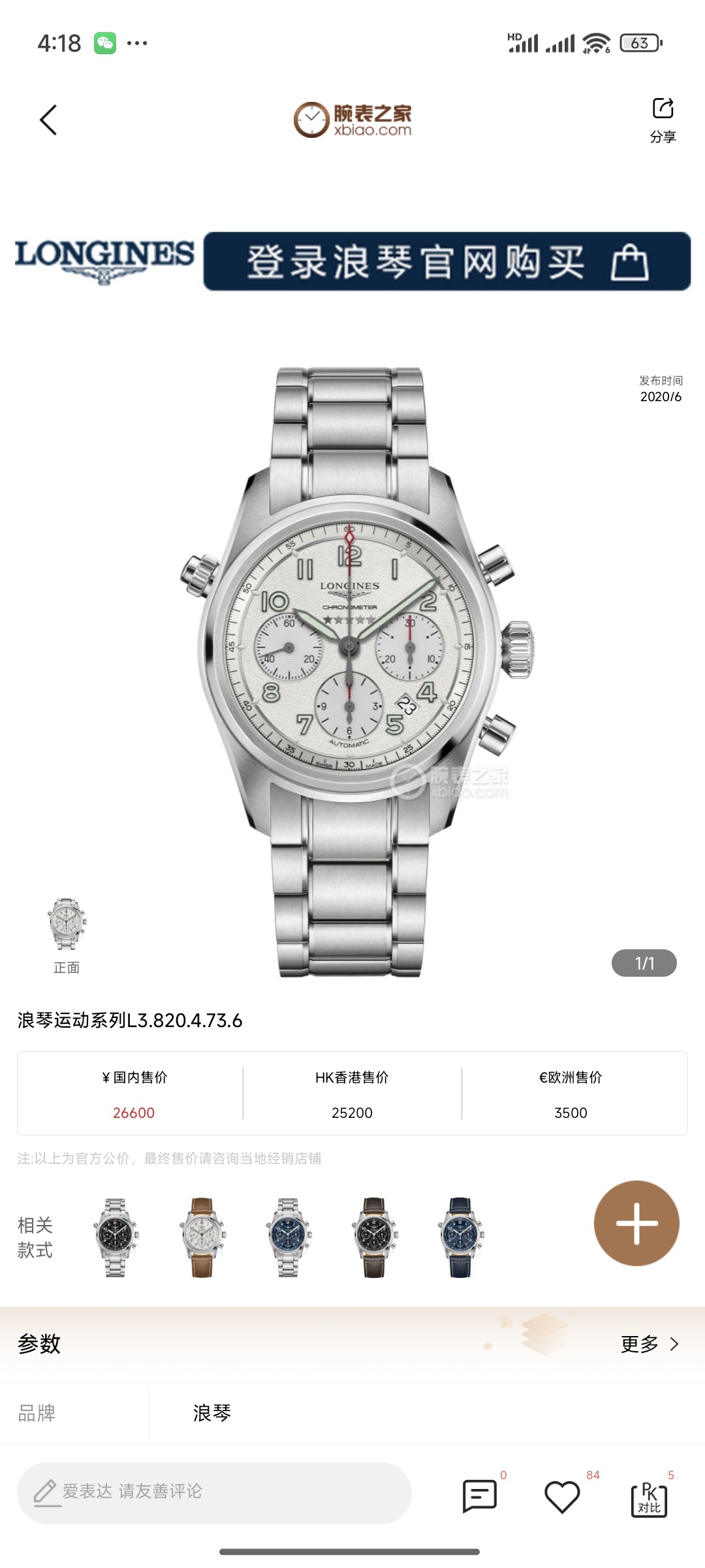 浪琴/Longines 先行者系列 L3.820.4.73.6 自动上链机械机芯 精钢 42.00mm 专柜价26600 全新未使用品