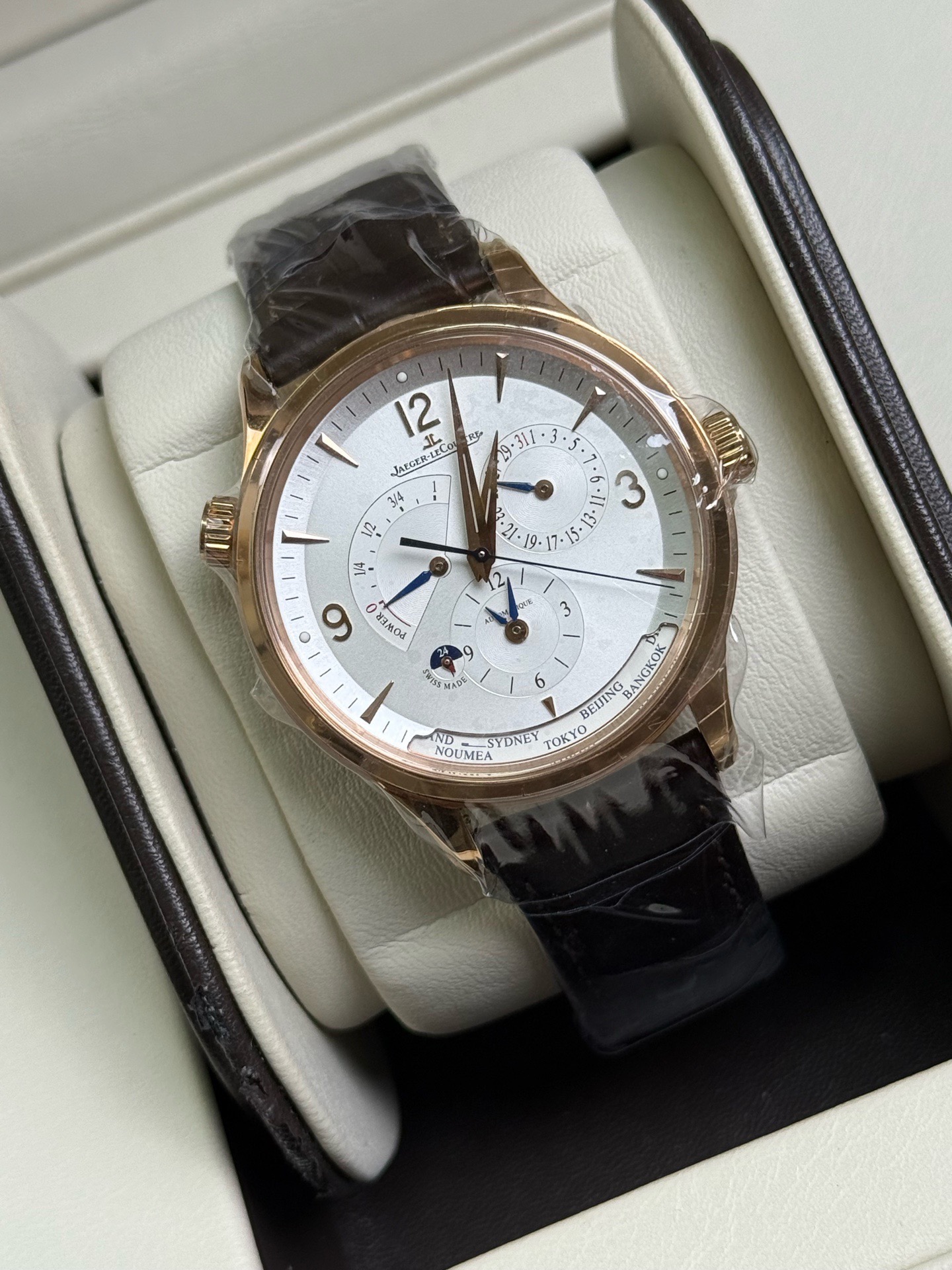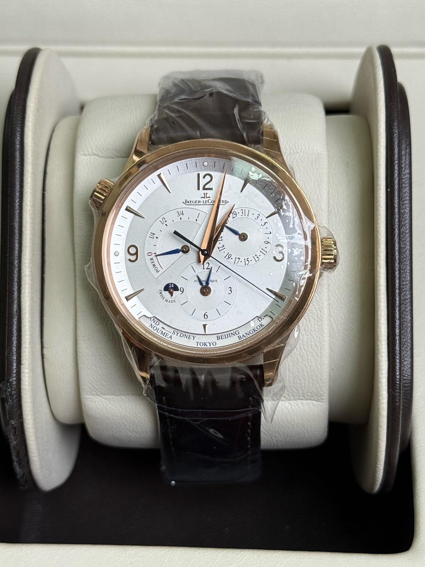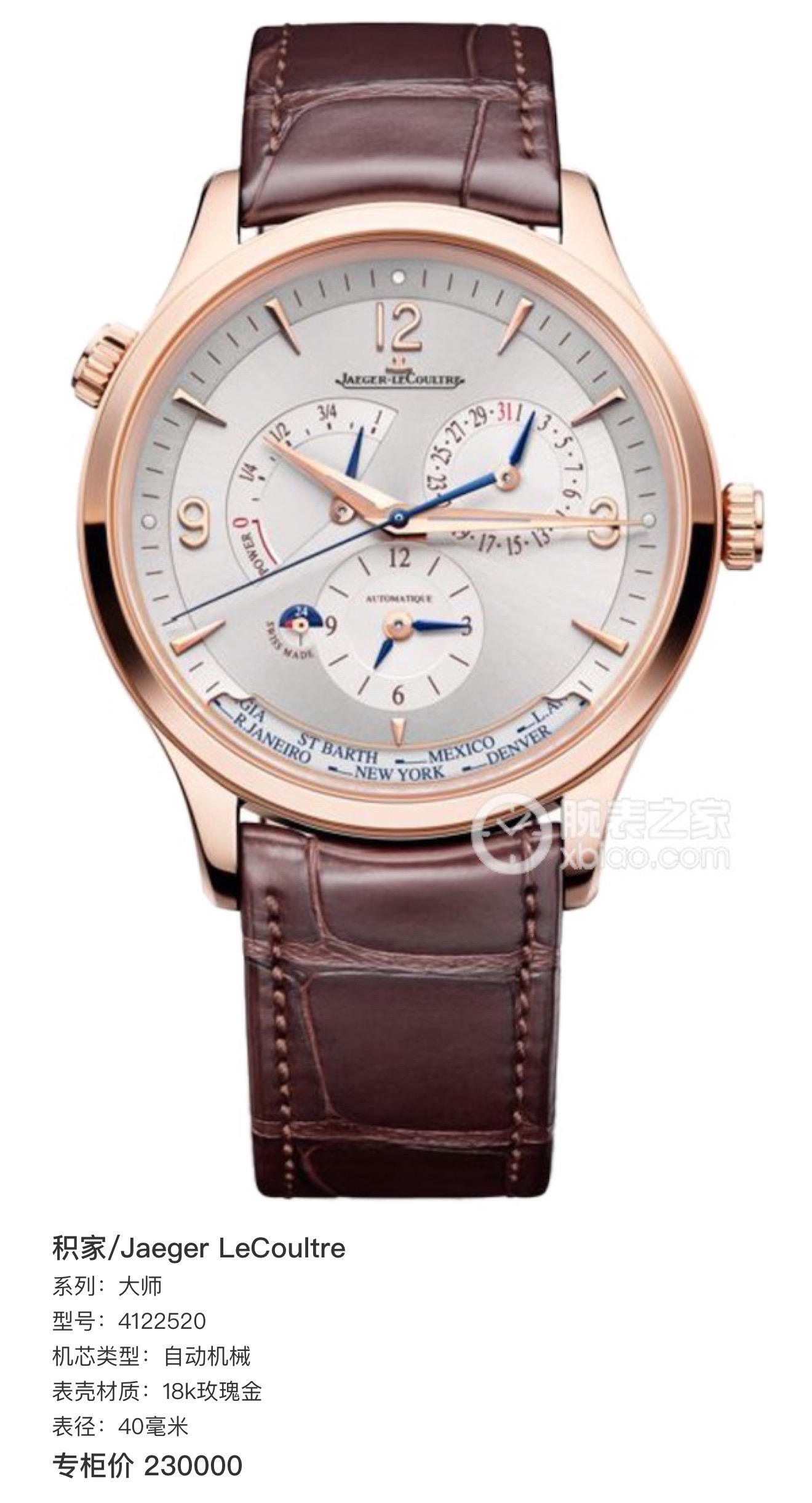 全套 积家地理大师最新款,积家4122520地理大师,通体玫瑰金材质,自动机械,40毫米,表盘设计新颖独特,日期显示、动储显示、昼夜显示,两地时显示,功能非常强大丰富,专柜价230000,现货全新立省大几万!。