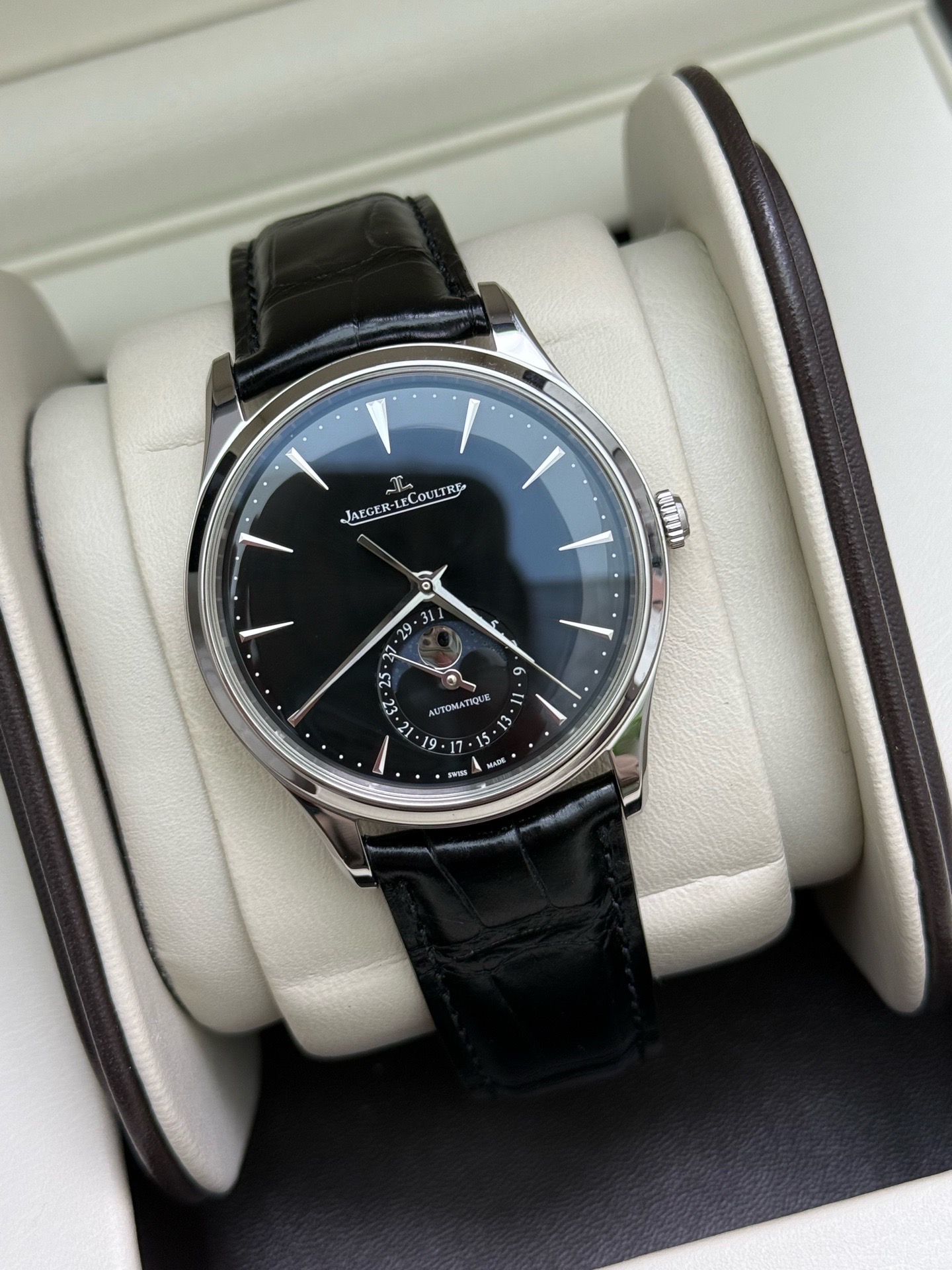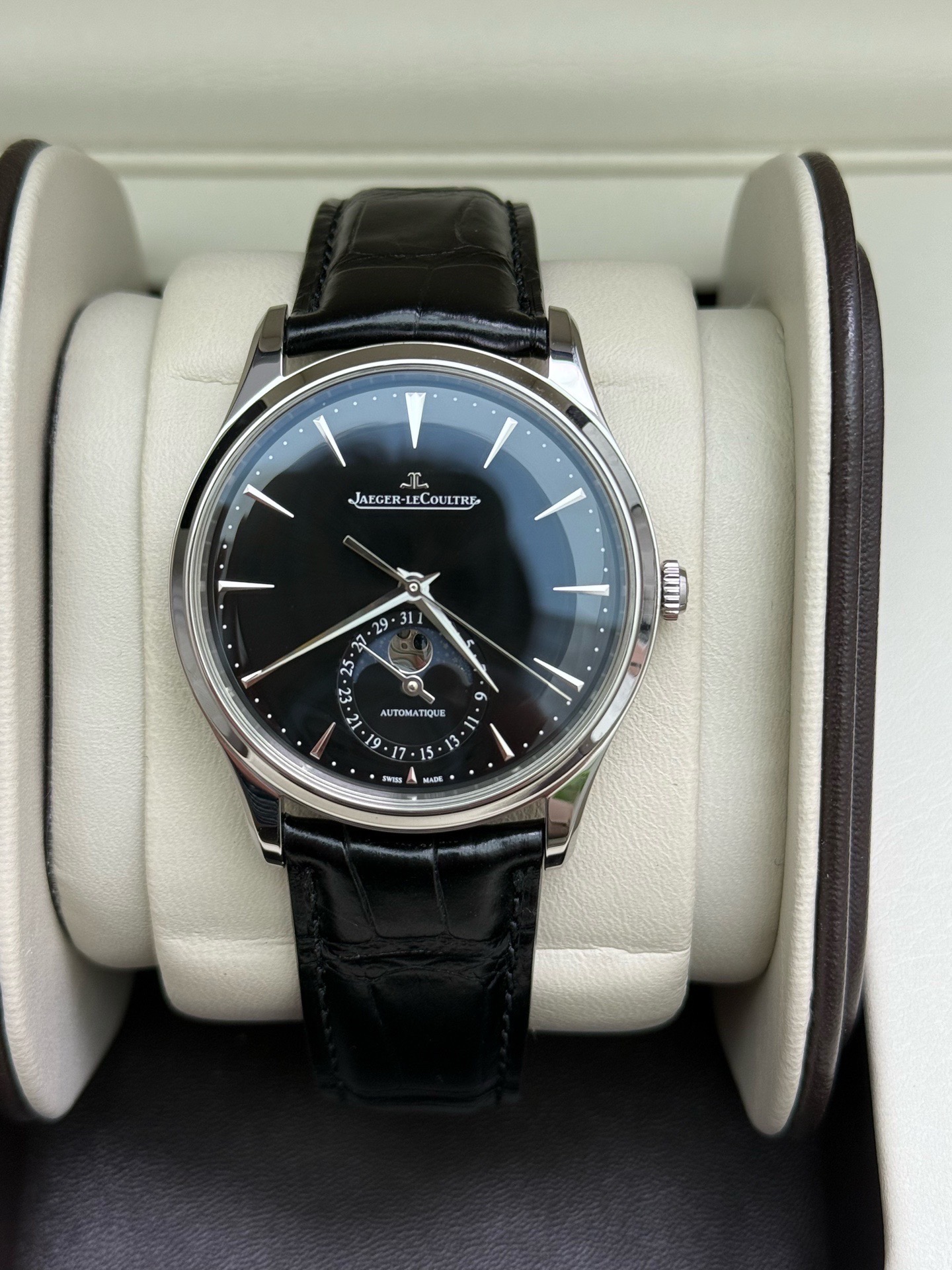全套 积家黑盘月相,独特稳重,没有白色容易撞款,积家大师1368471,新款动储70小时,自动机械 精钢 39毫米,专柜价92000