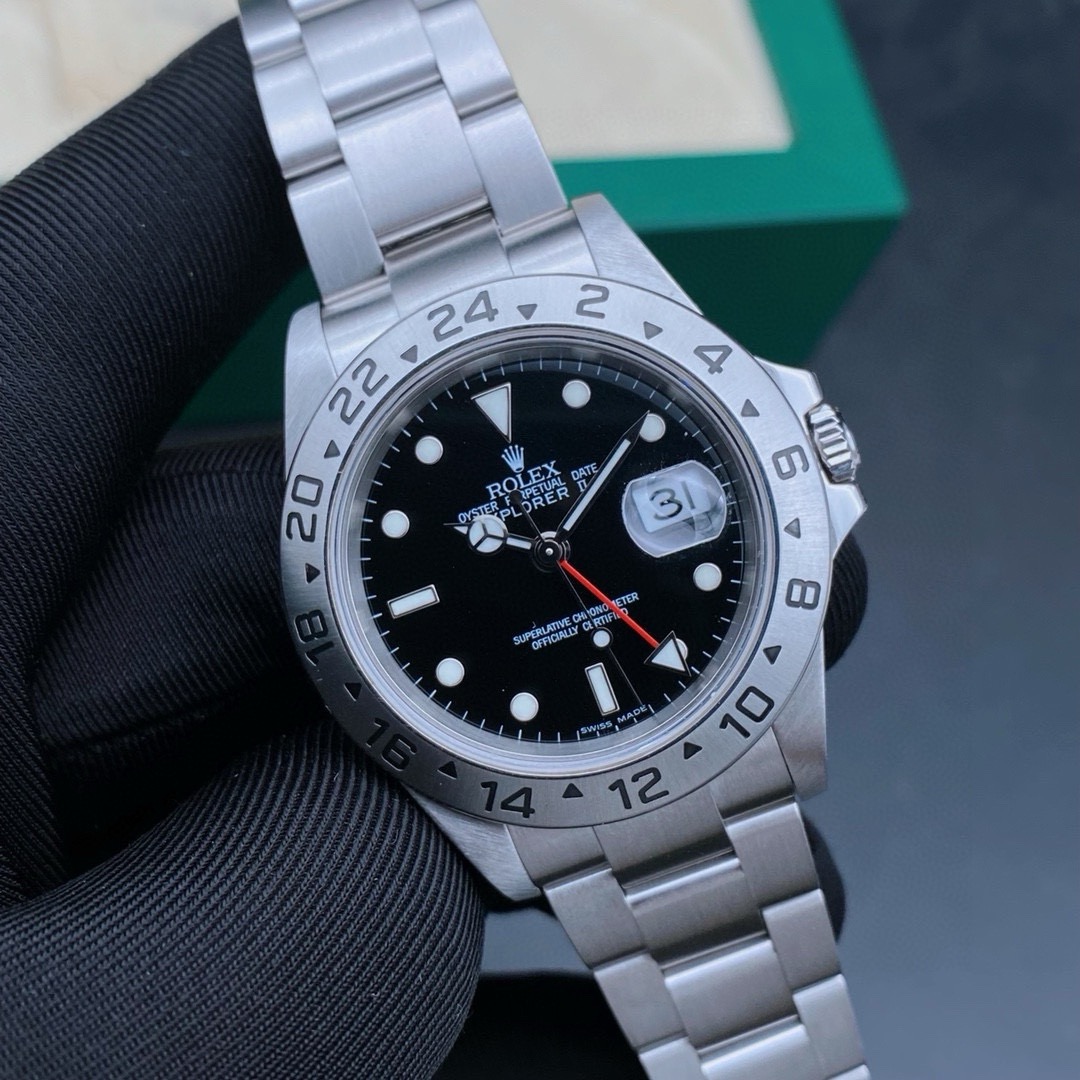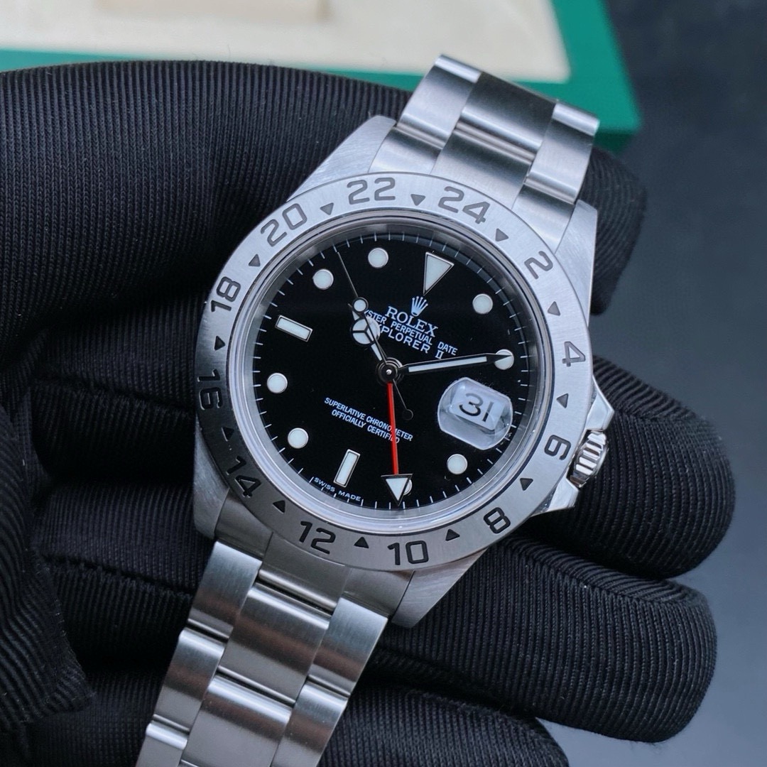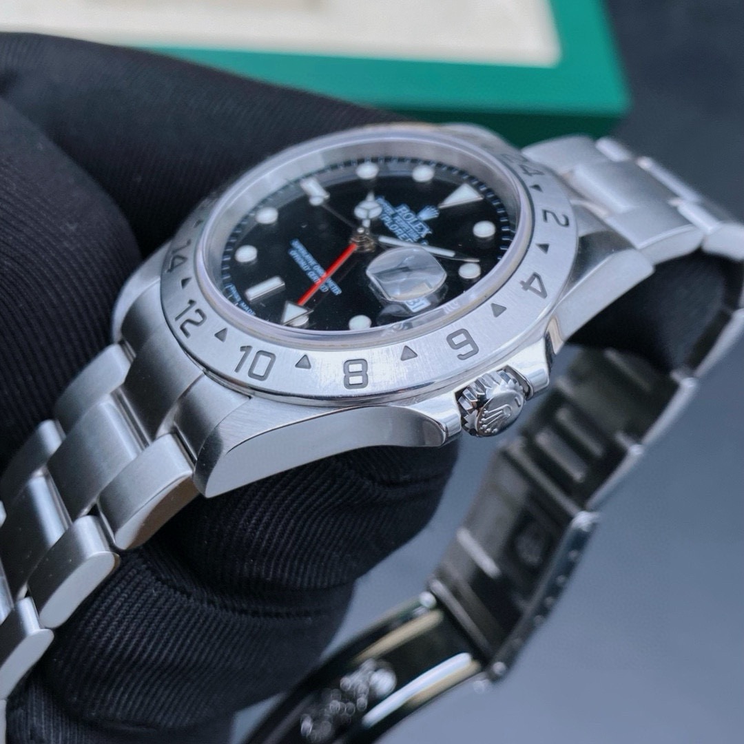 劳力士探险家16570男士腕表探二,精钢材质,搭载自动机械,表径42mm,黑色盘面简约大方干净素雅,红色GMT两地时指针,外圈GMT时针刻度,大热门款新表超工价64700