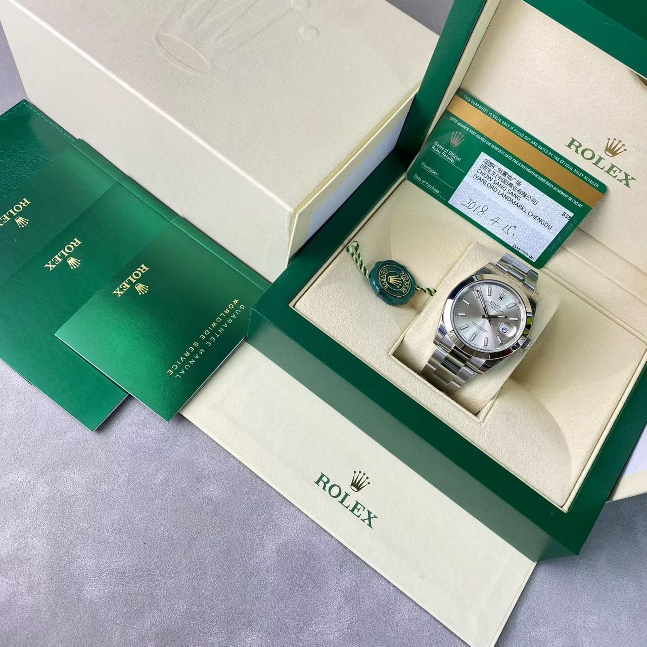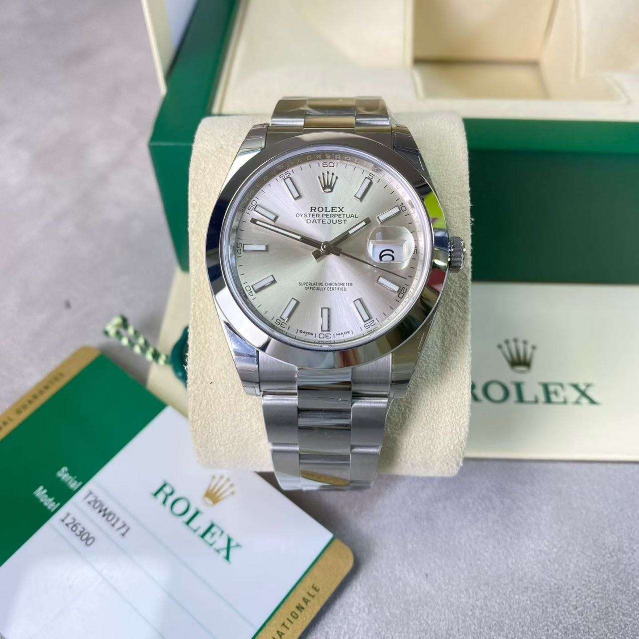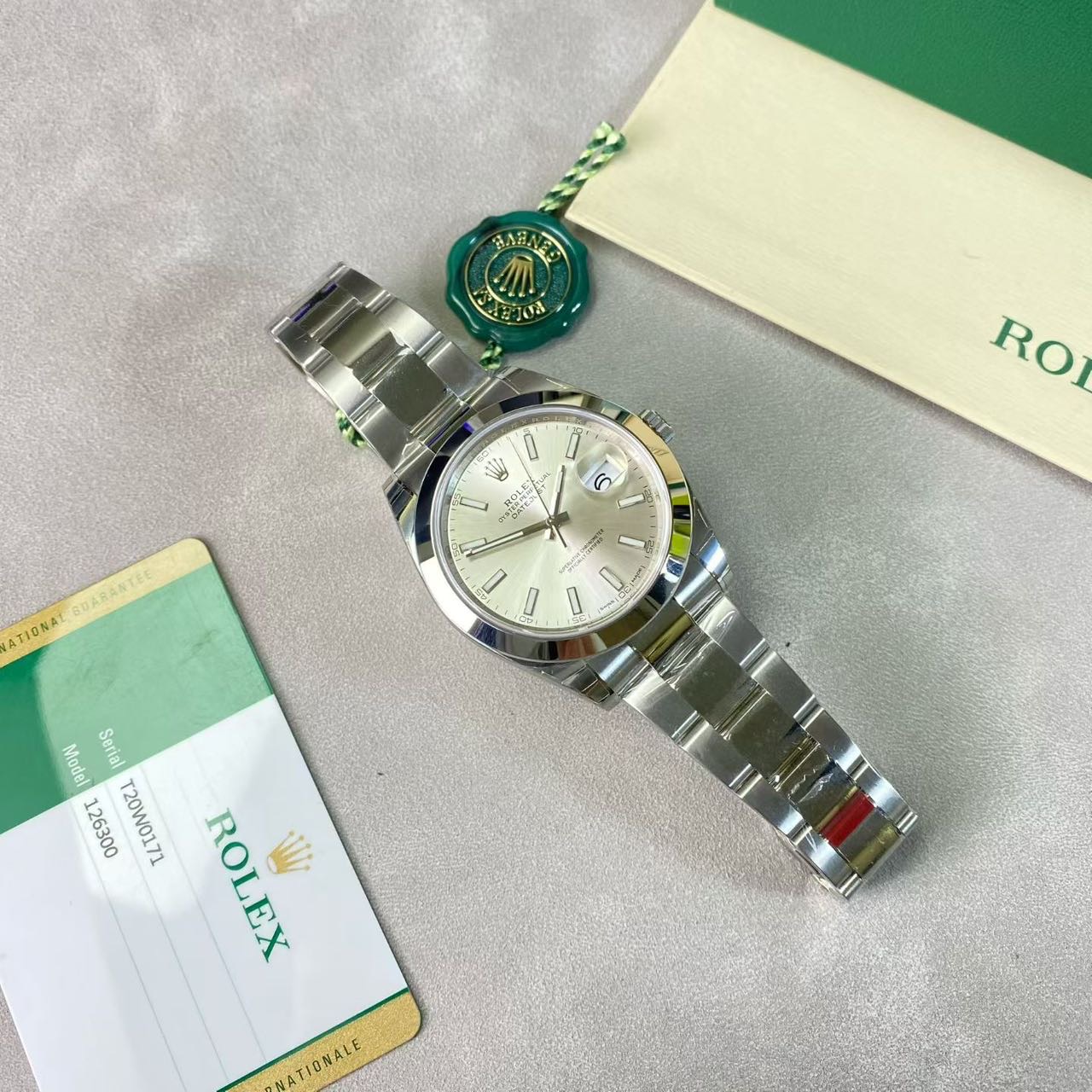 劳力士日志-126300,公价7.18万,表径41mm,18年全套未使用(全膜),银面 条刻,搭载新款3235机芯。