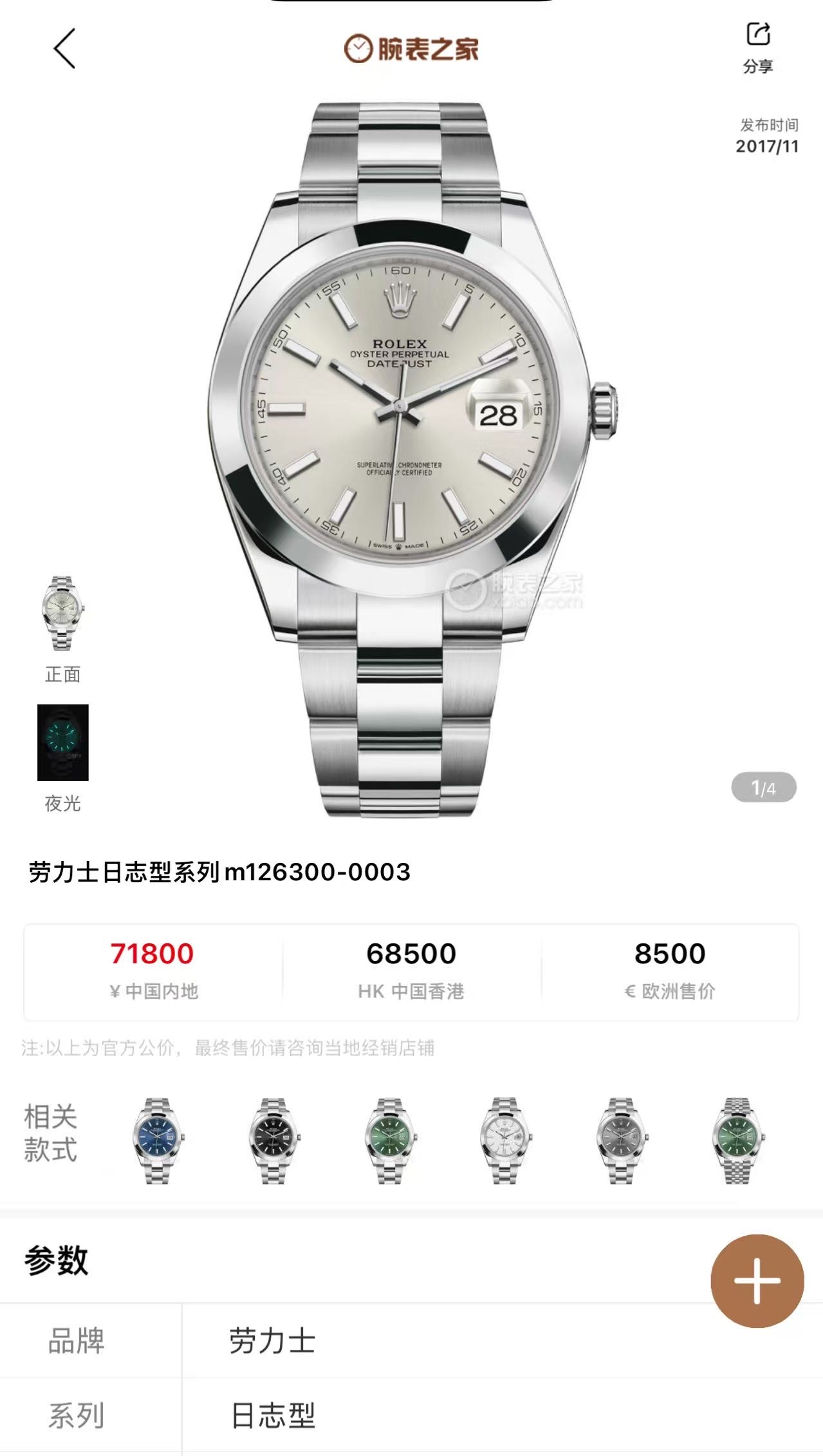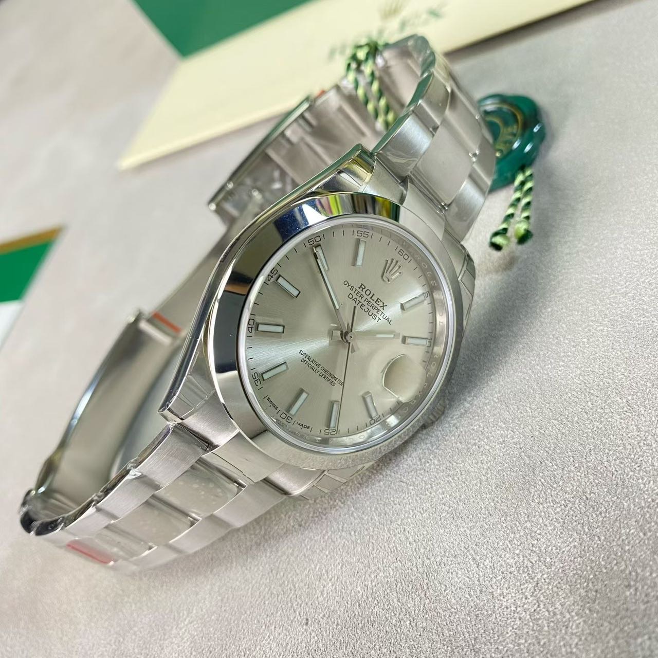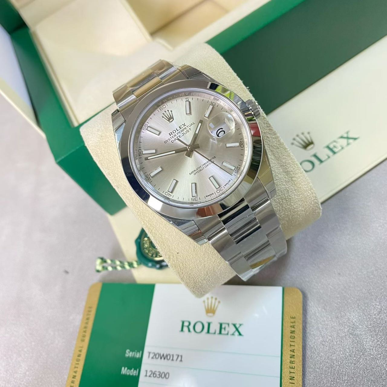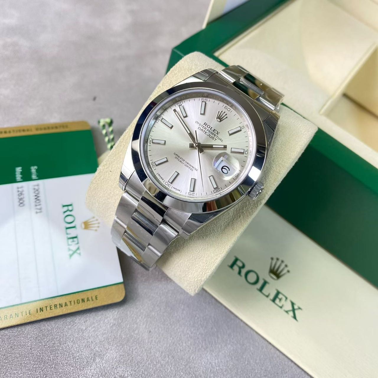 劳力士日志-126300,公价7.18万,表径41mm,18年全套未使用(全膜),银面 条刻,搭载新款3235机芯。