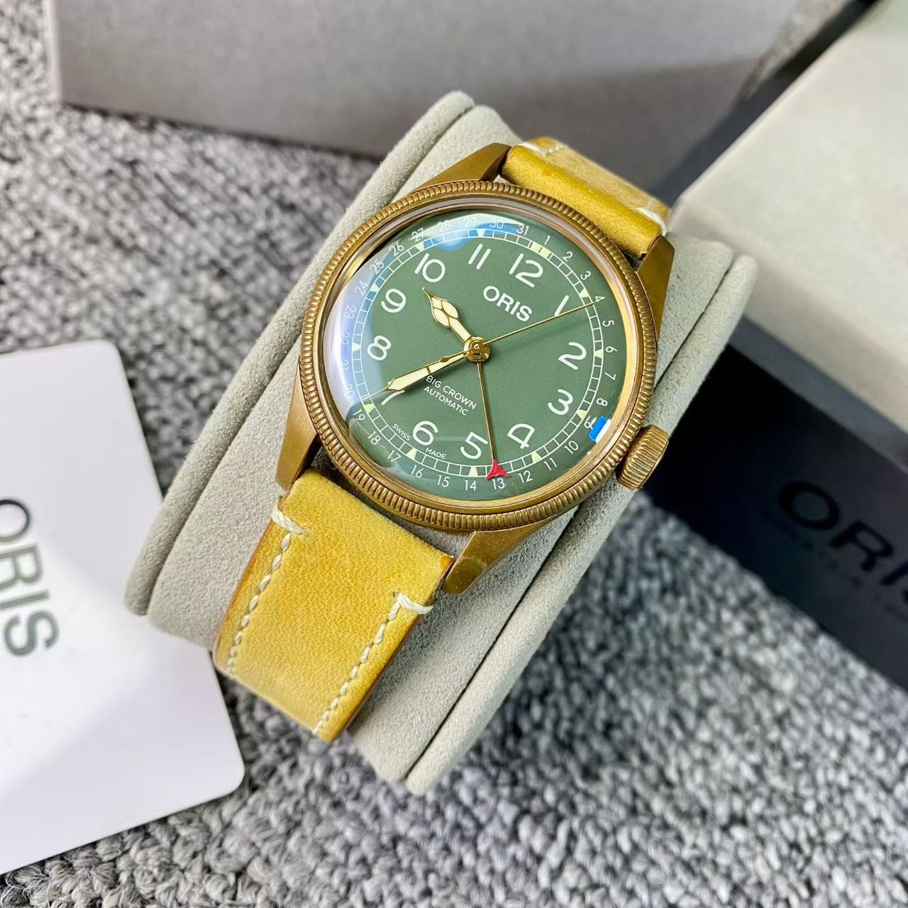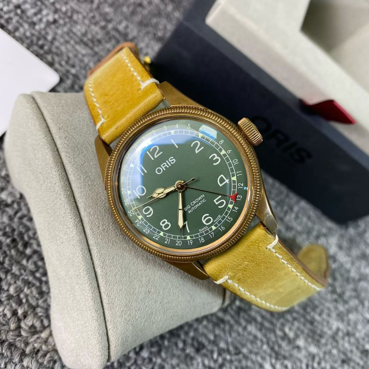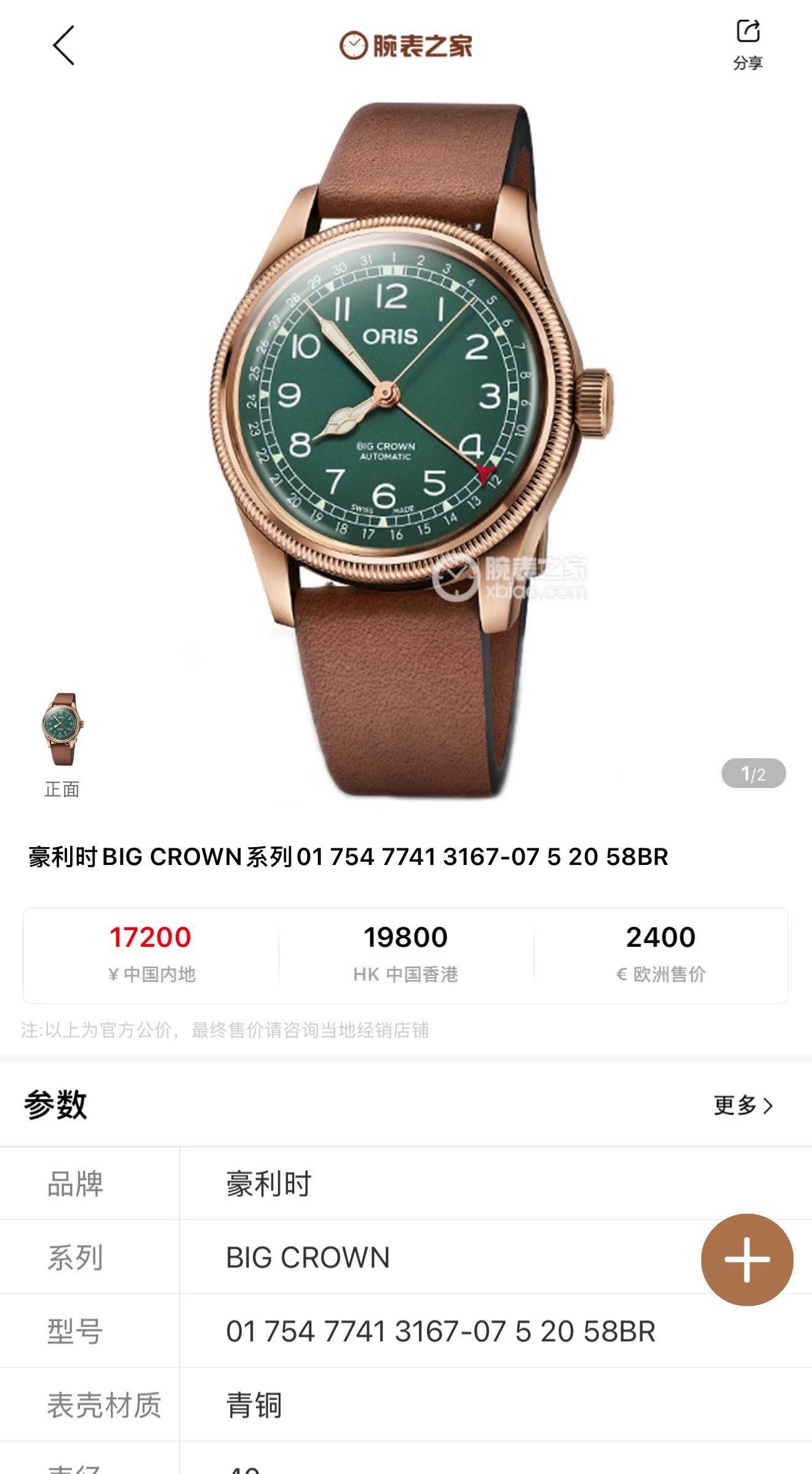 豪利时航空系列,公价1.72万,表径40mm,全套附件齐全 极品成色,青铜材质表壳,通透泡泡镜,复古阿拉伯数字刻度盘,指针式日历设计搭配薄荷绿表盘,浓浓复古文艺范儿。