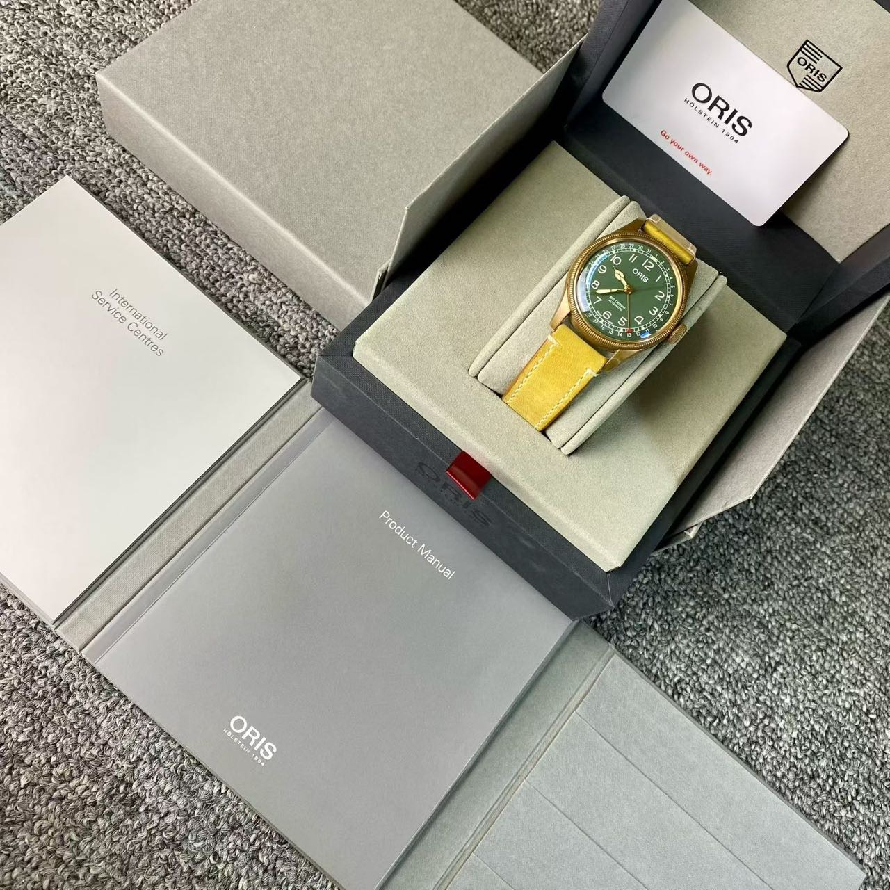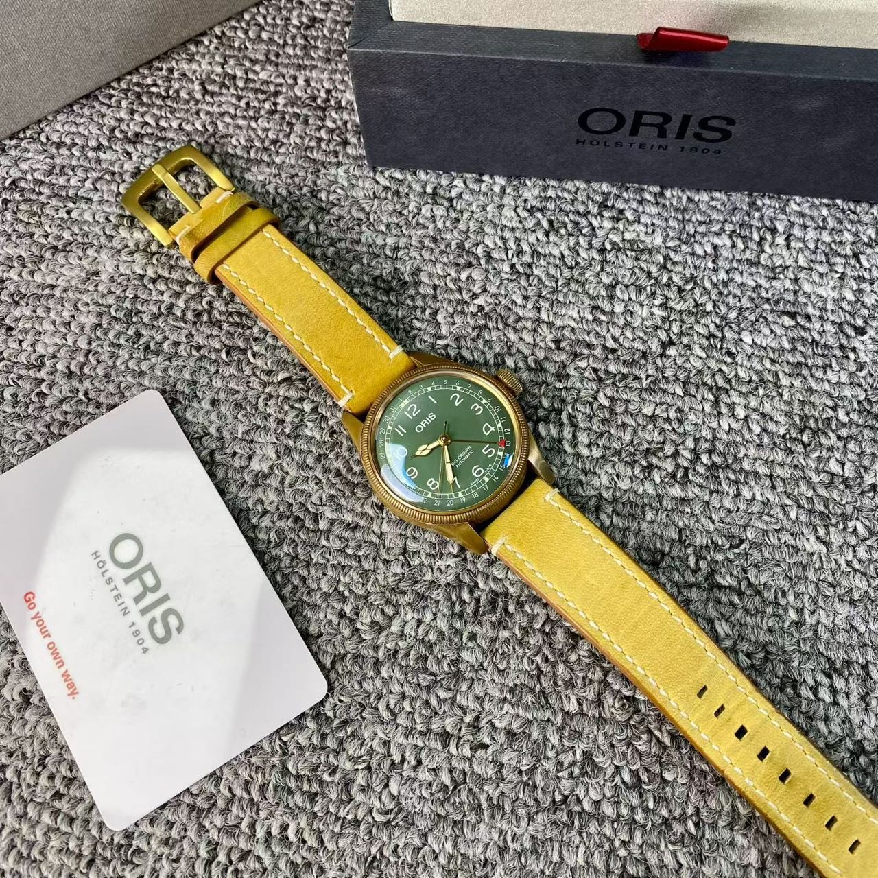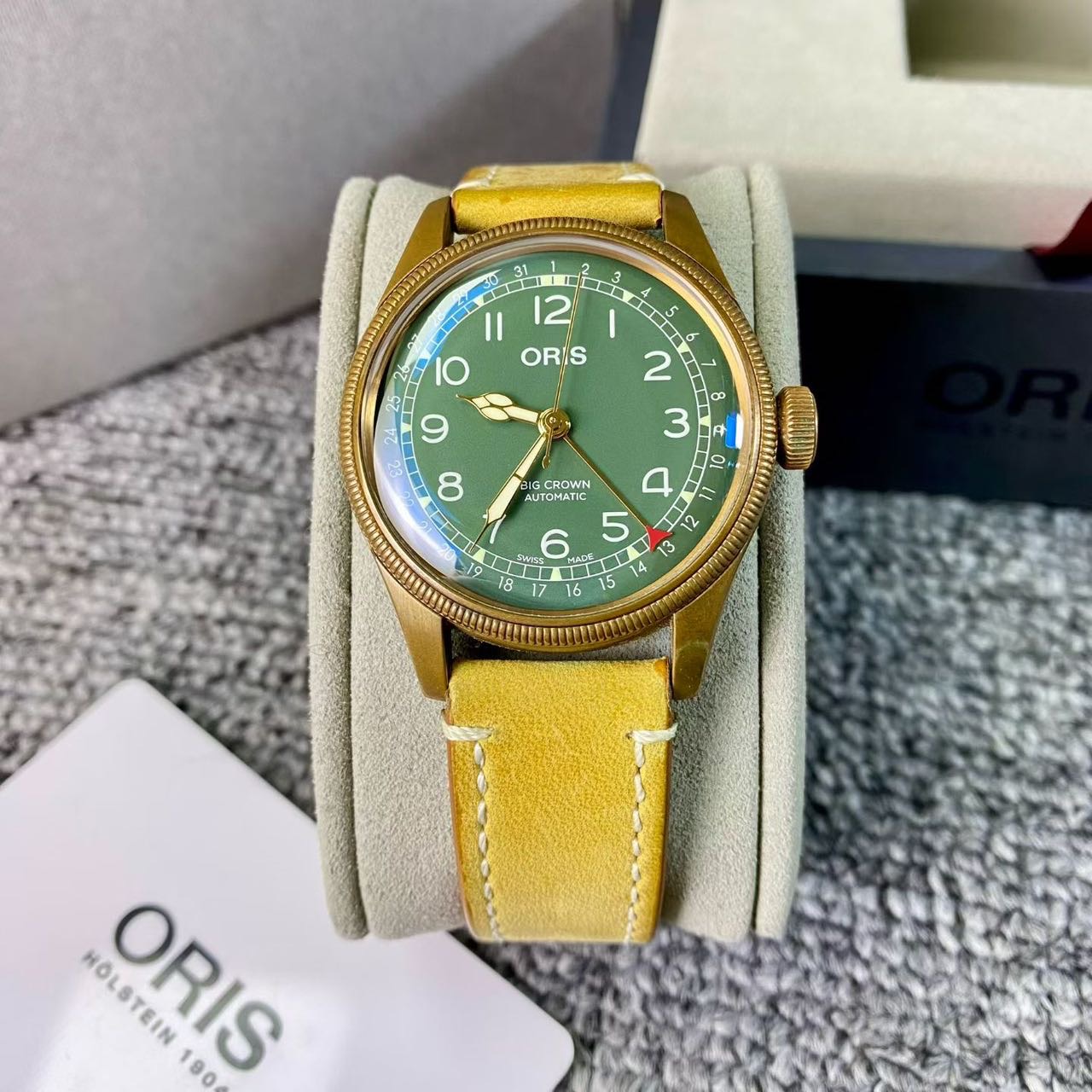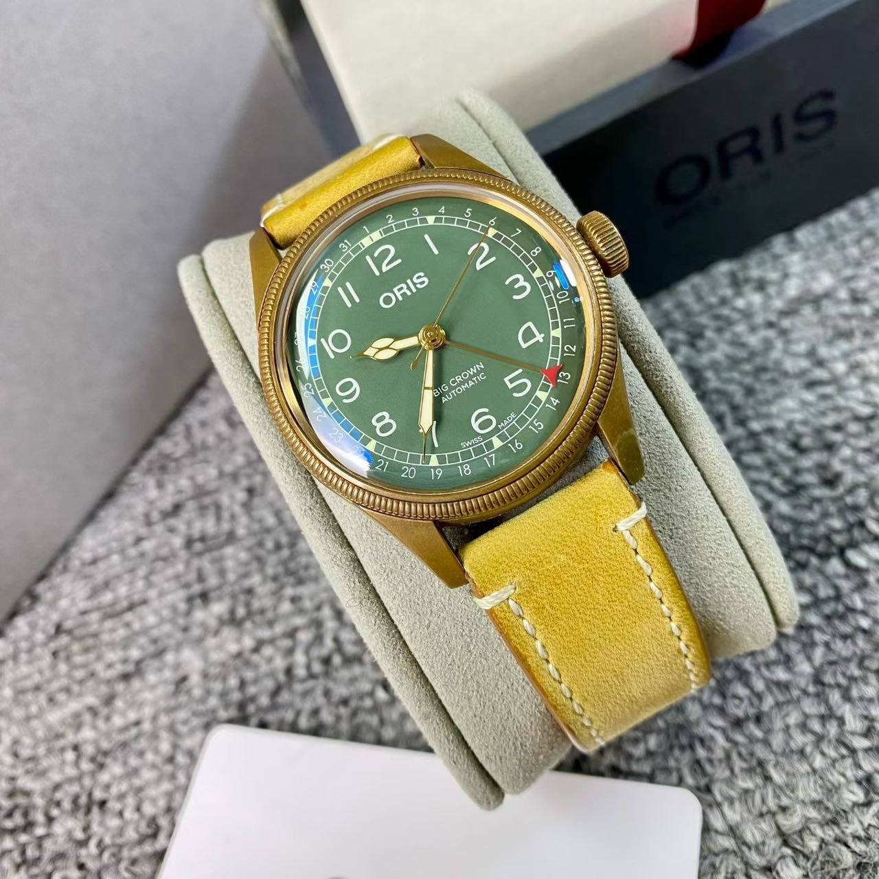 豪利时航空系列,公价1.72万,表径40mm,全套附件齐全 极品成色,青铜材质表壳,通透泡泡镜,复古阿拉伯数字刻度盘,指针式日历设计搭配薄荷绿表盘,浓浓复古文艺范儿。