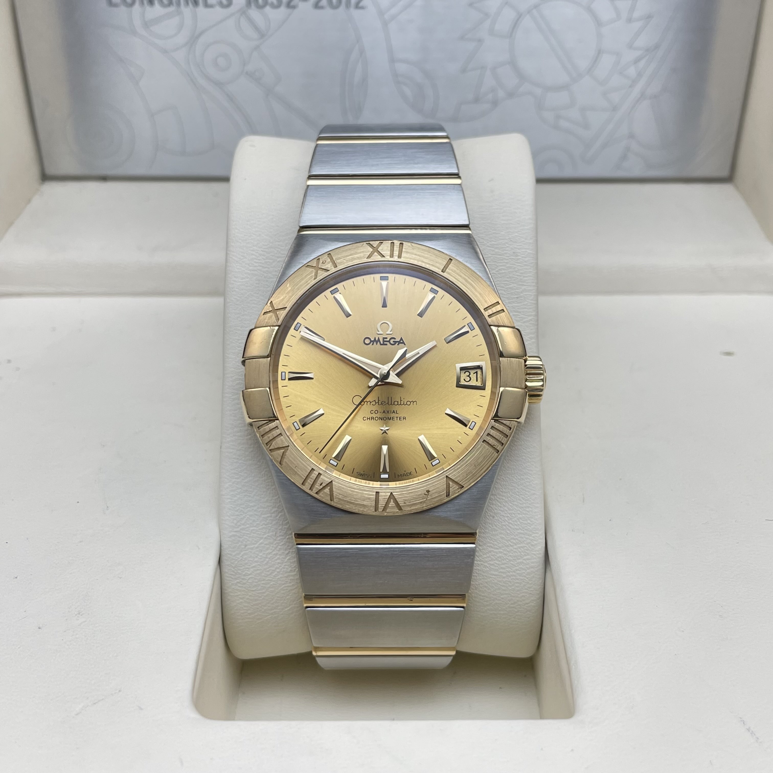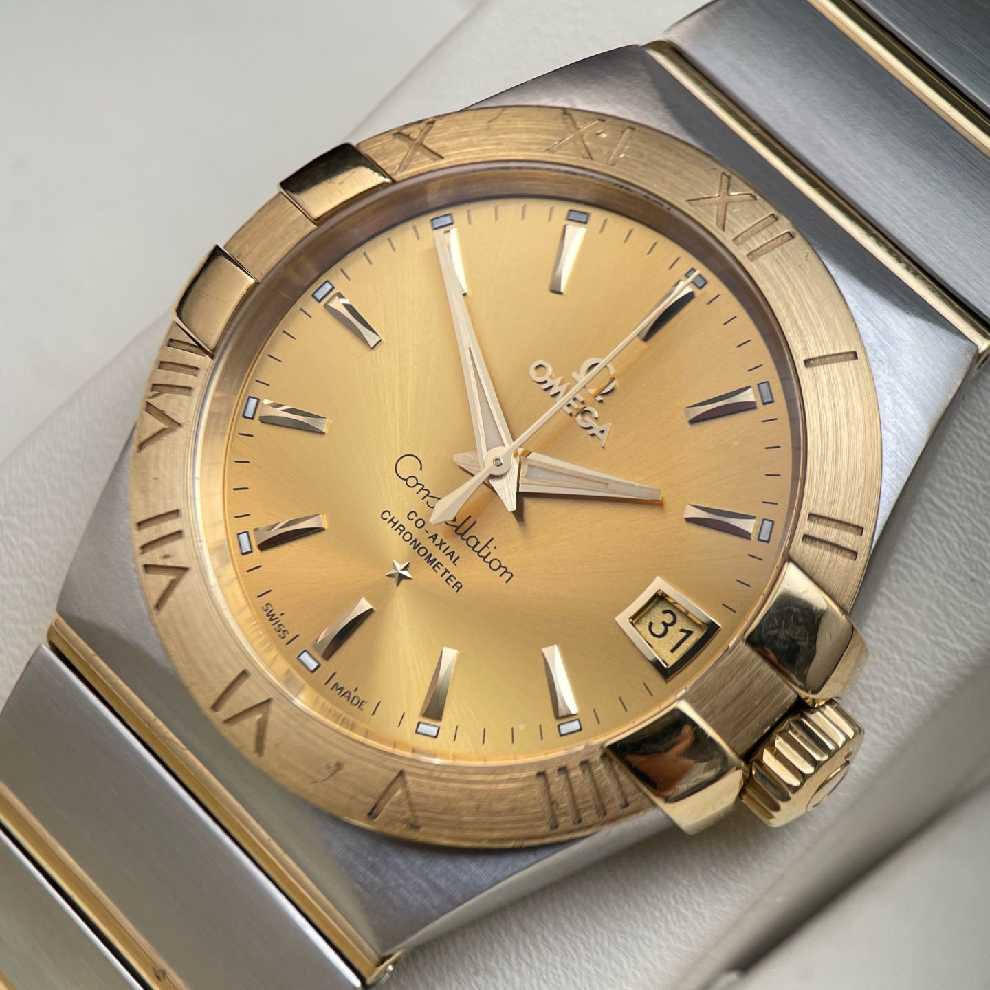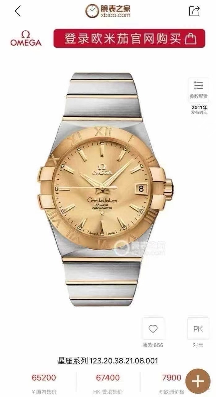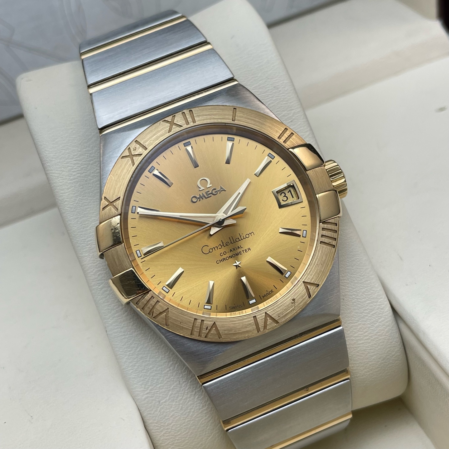 Omega 欧米茄 星座系列 123.20.38.21.08.001,自动机械男表,18k黄金/精钢材质,表径38mm,二手单表,公价¥65200。