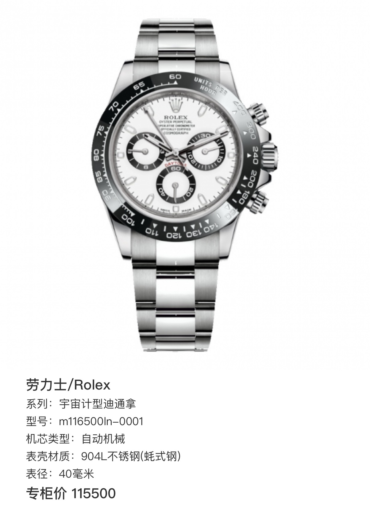 劳力士/Rolex 宇宙计型迪通拿 m116500ln-0001 自动机械 904L不锈钢(蚝式钢) 40毫米 专柜价115500