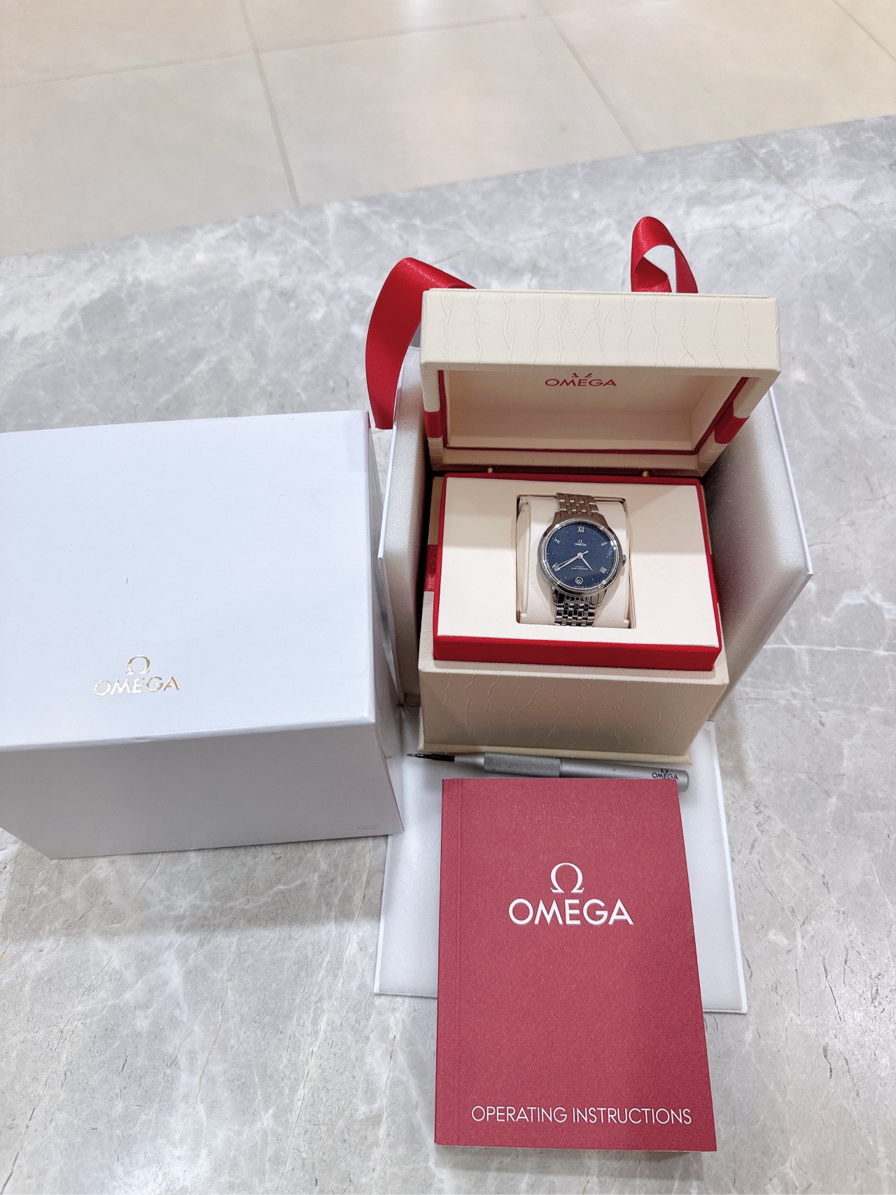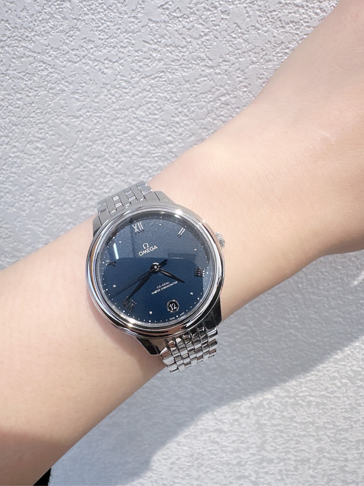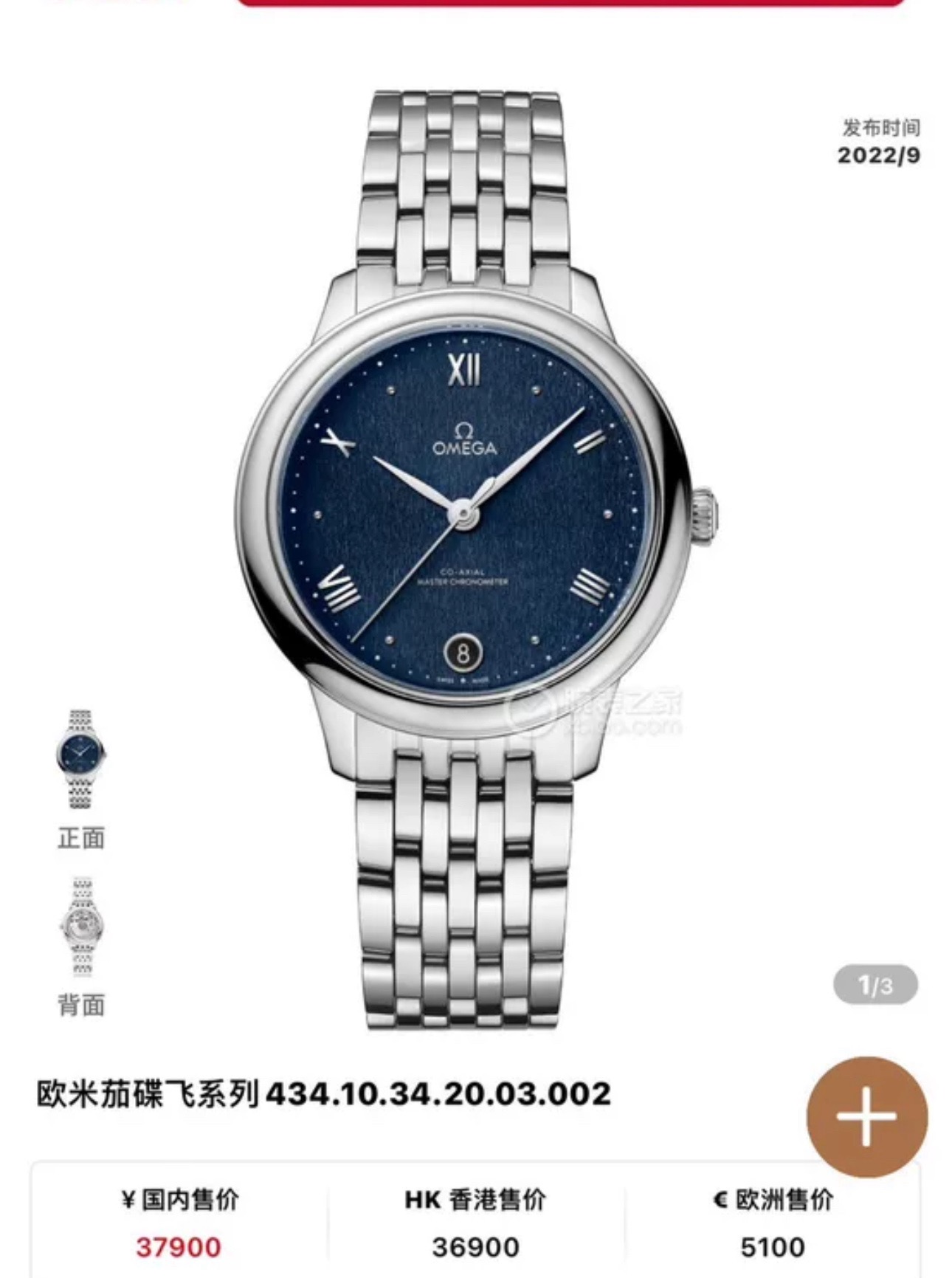 欧米茄碟飞系列434.10.34.20.03.002 自动机械腕表,表径34 ,蓝色盘面搭配银色指针刻度,日期显示,公价39700,现货好价